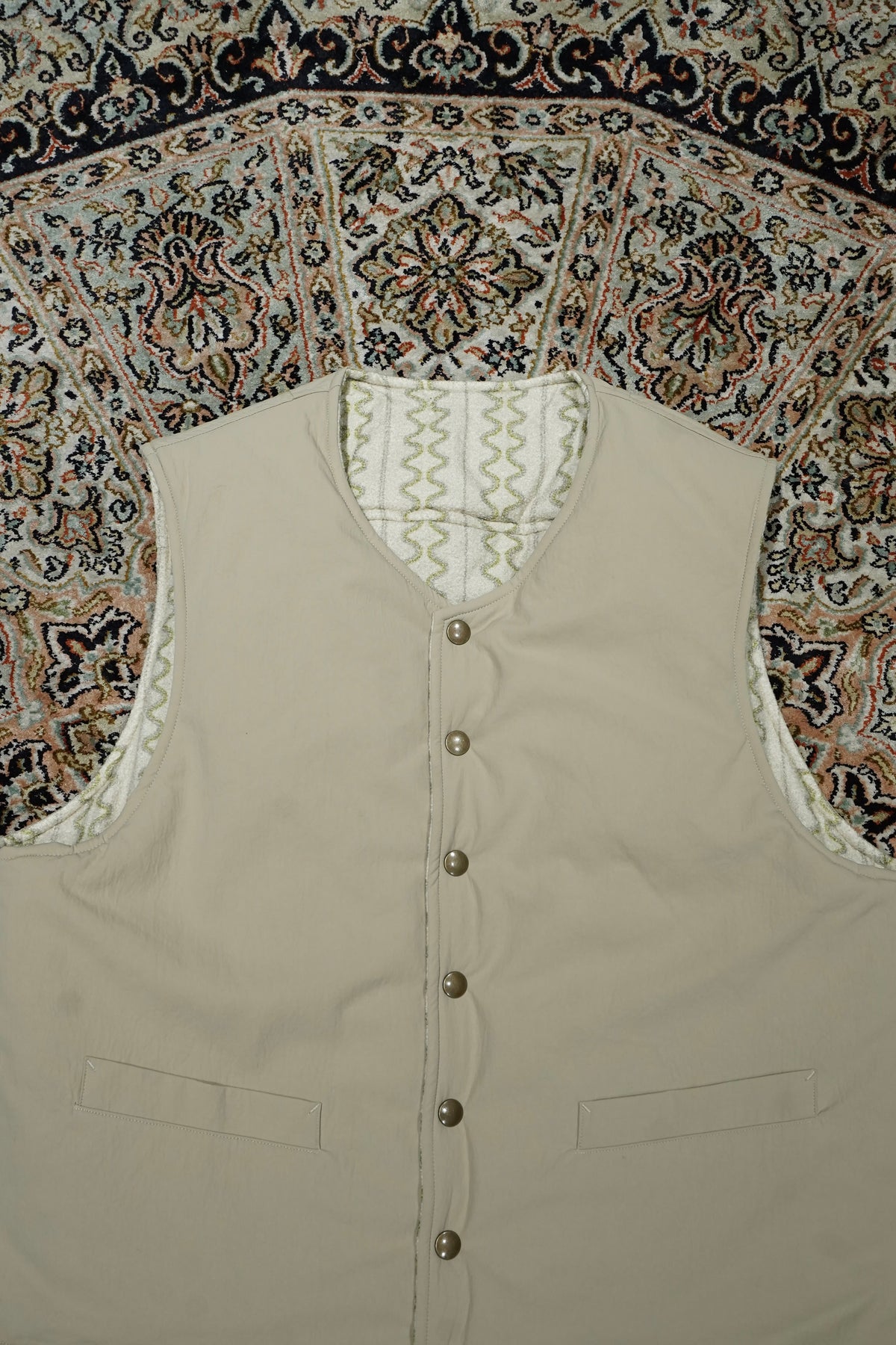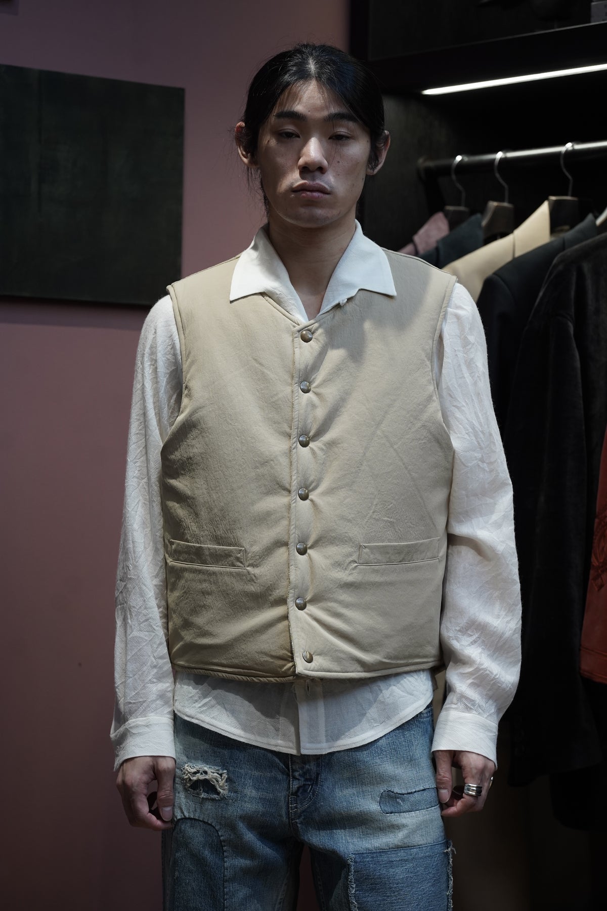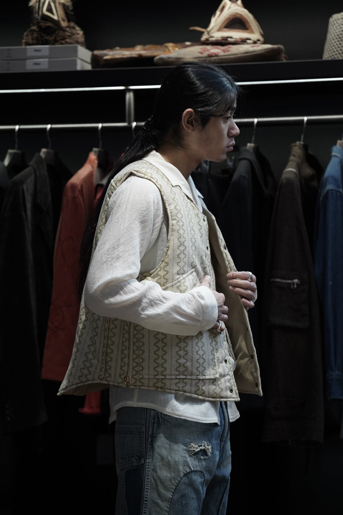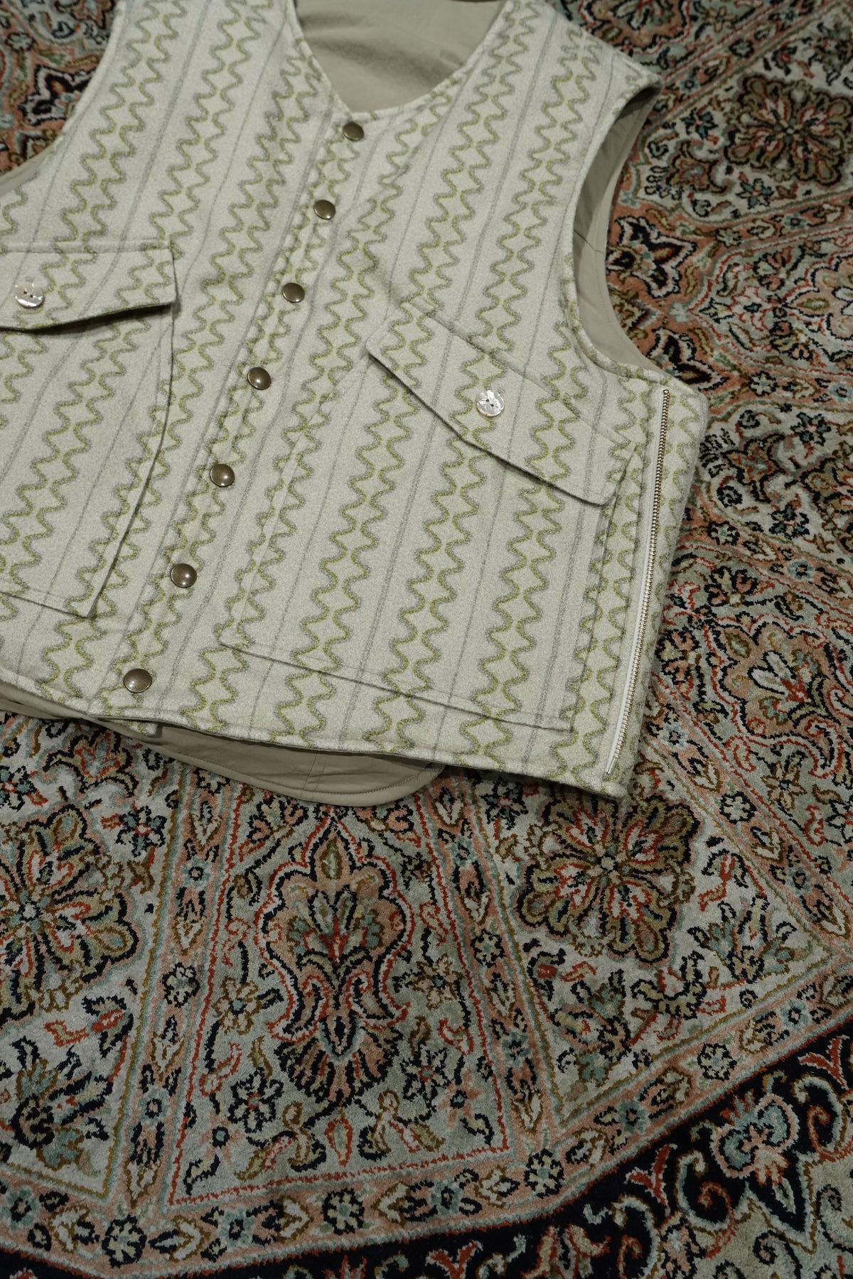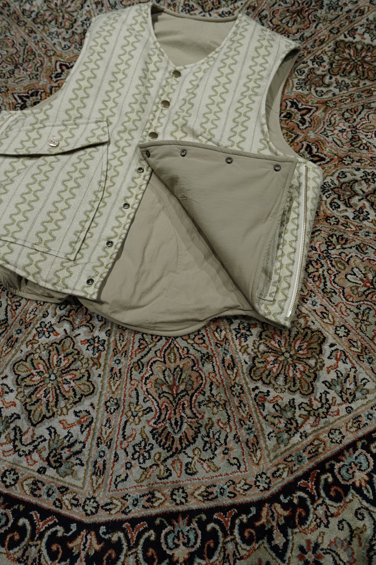 Made with water-repellent nylon that uses Taslan-based material for lightness.This is a reversible vest with padding that is made using an original fabric that is linked to the theme by printing a pattern from the braiding technique of Peru's Nazca culture on flannel fabric using an inkjet process, punching it blank with a needle punch, and then hooking it onto a thread to create an expression on the fabric.It is characterized by a change in the back of the front that is inspired by the mountains of the Andes.There is a zipper on the side of the back side (pattern side), which allows you to reduce the size and make it easy to use as an inner layer under outerwear. The three-dimensional pattern and padding make it elegant and comfortable to wear.