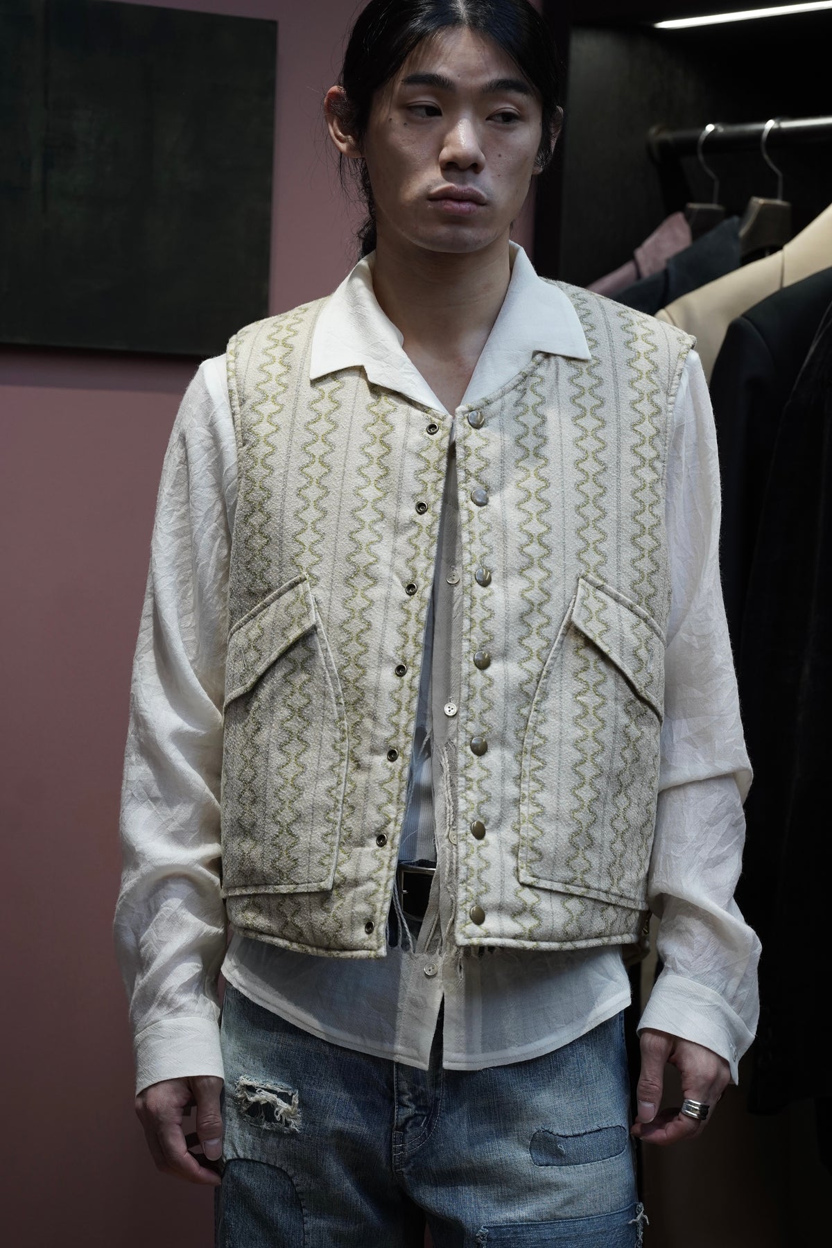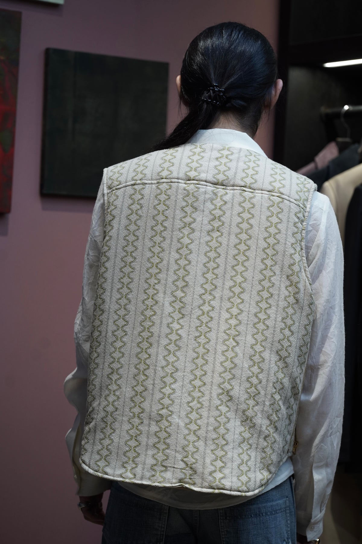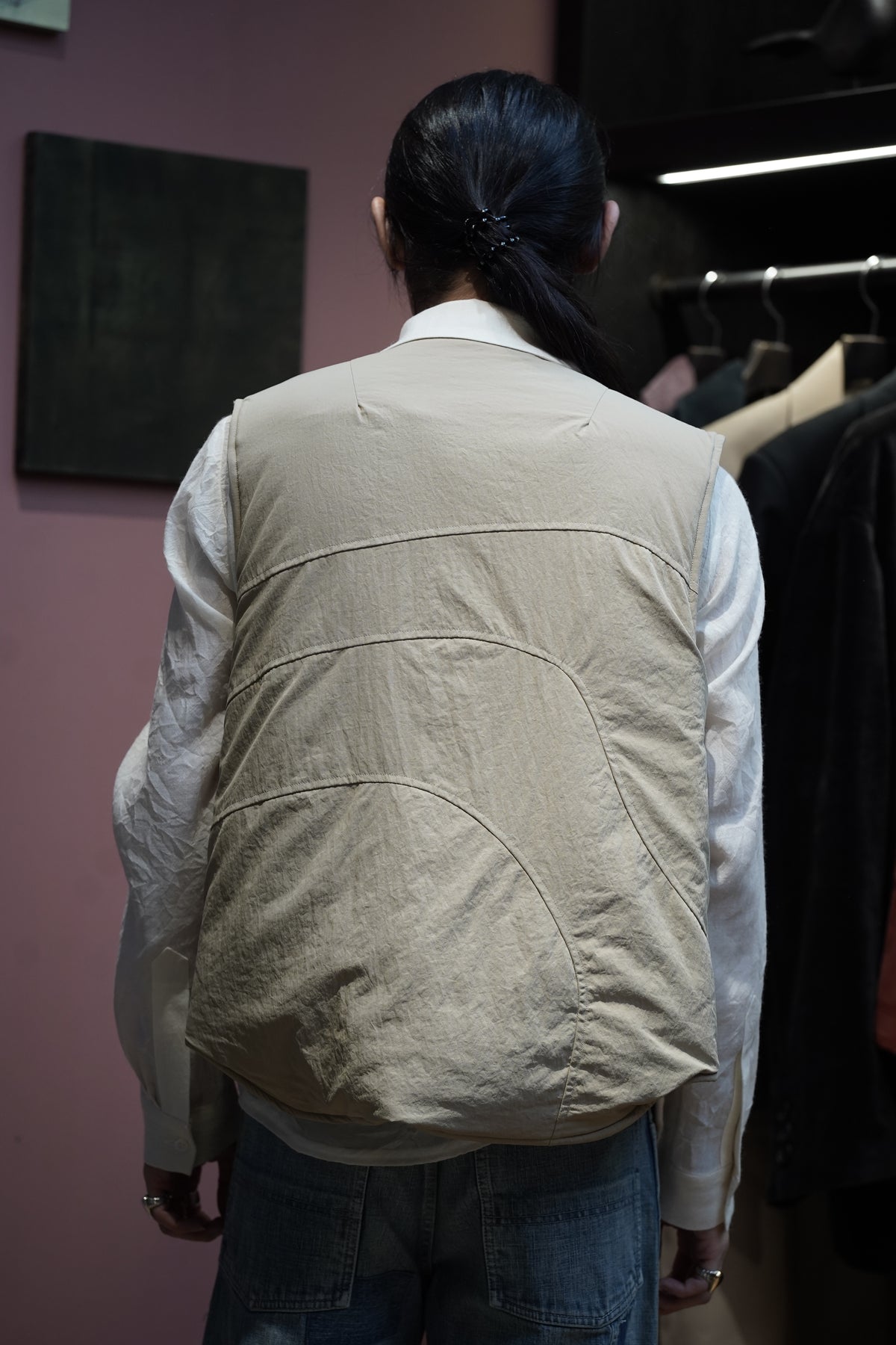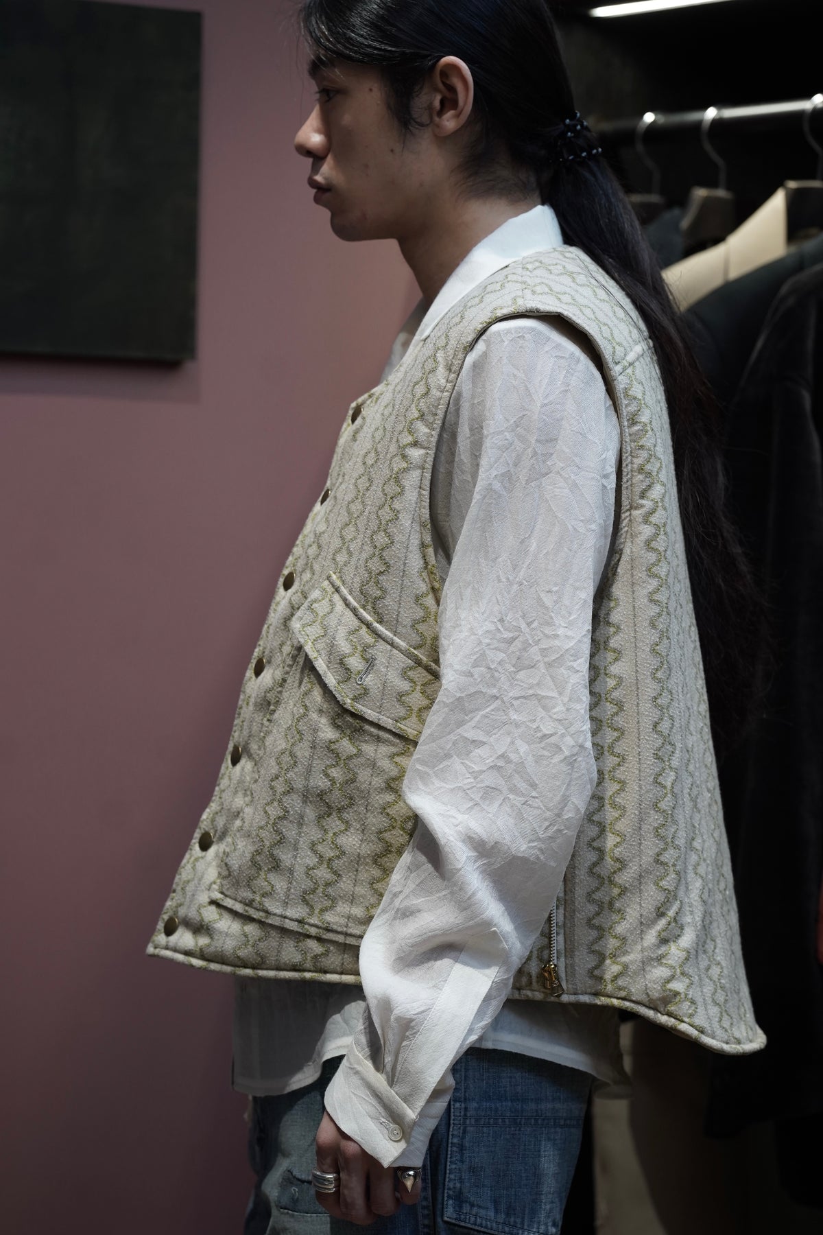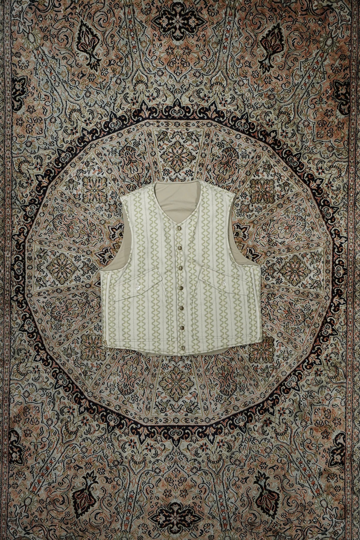 Made with water-repellent nylon that uses Taslan-based material for lightness.This is a reversible vest with padding that is made using an original fabric that is linked to the theme by printing a pattern from the braiding technique of Peru's Nazca culture on flannel fabric using an inkjet process, punching it blank with a needle punch, and then hooking it onto a thread to create an expression on the fabric.It is characterized by a change in the back of the front that is inspired by the mountains of the Andes.There is a zipper on the side of the back side (pattern side), which allows you to reduce the size and make it easy to use as an inner layer under outerwear. The three-dimensional pattern and padding make it elegant and comfortable to wear.