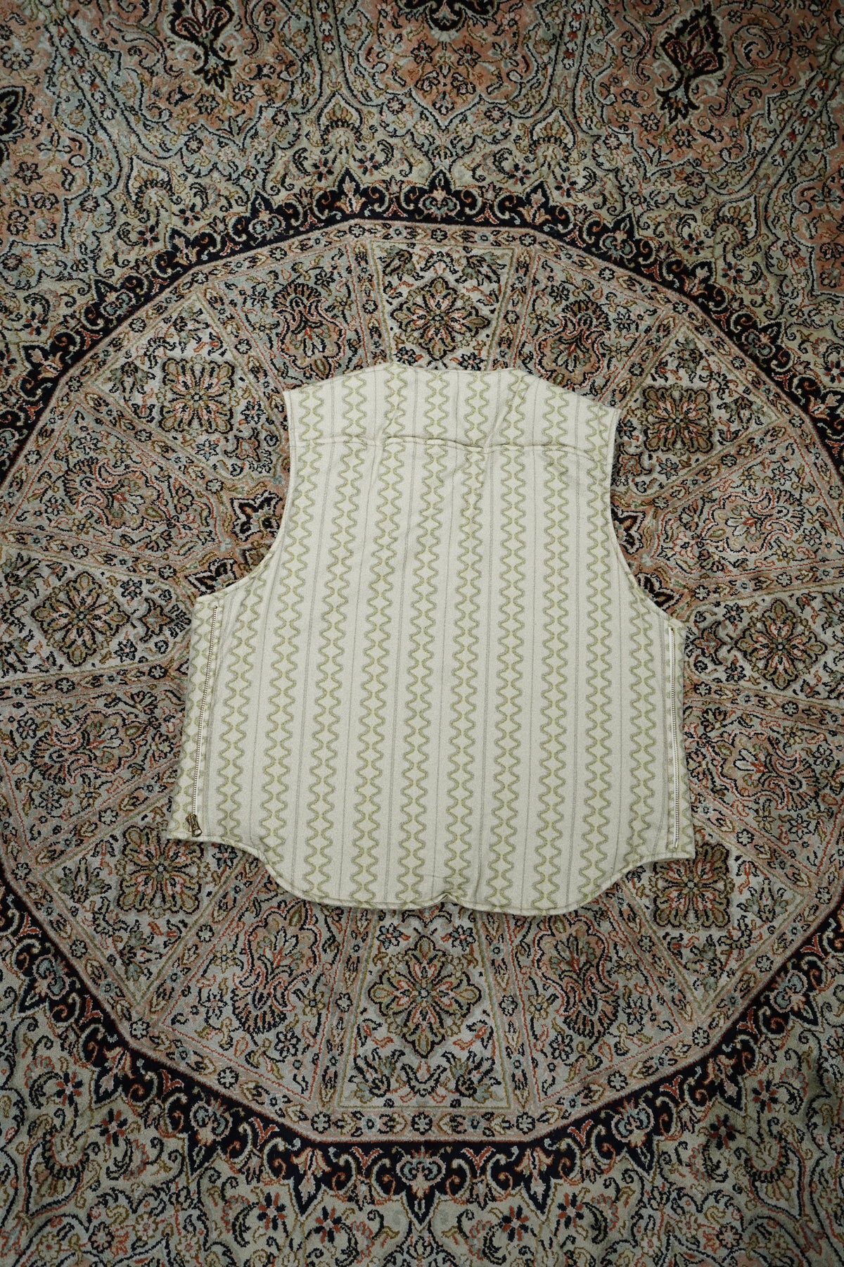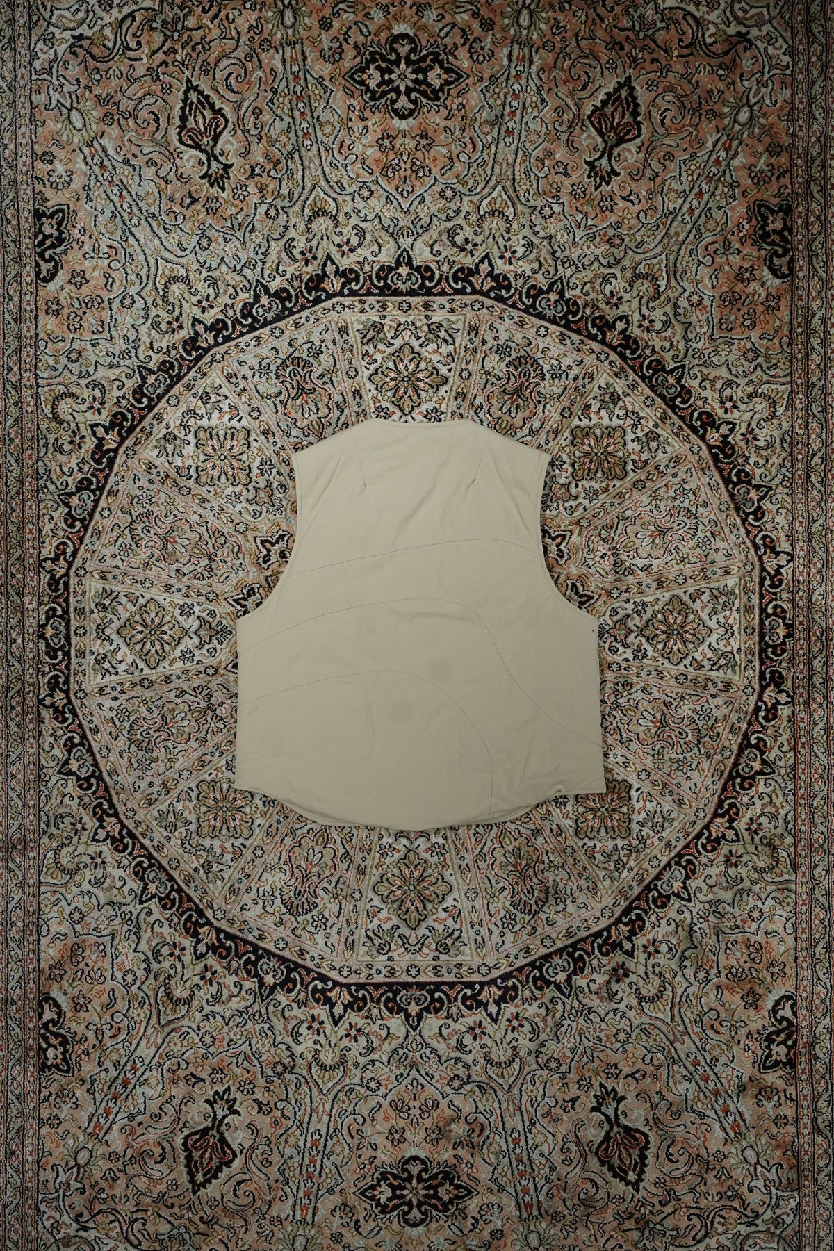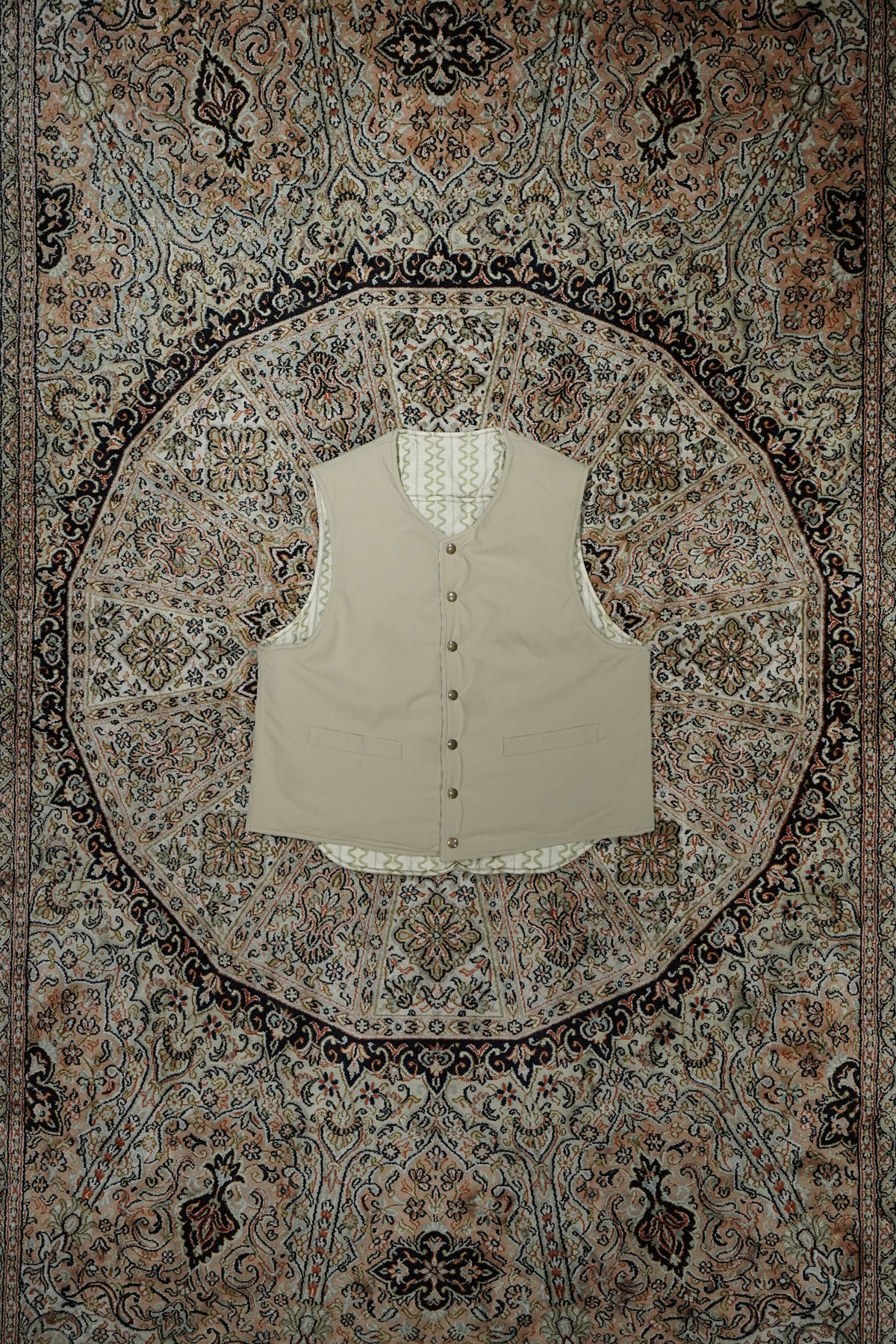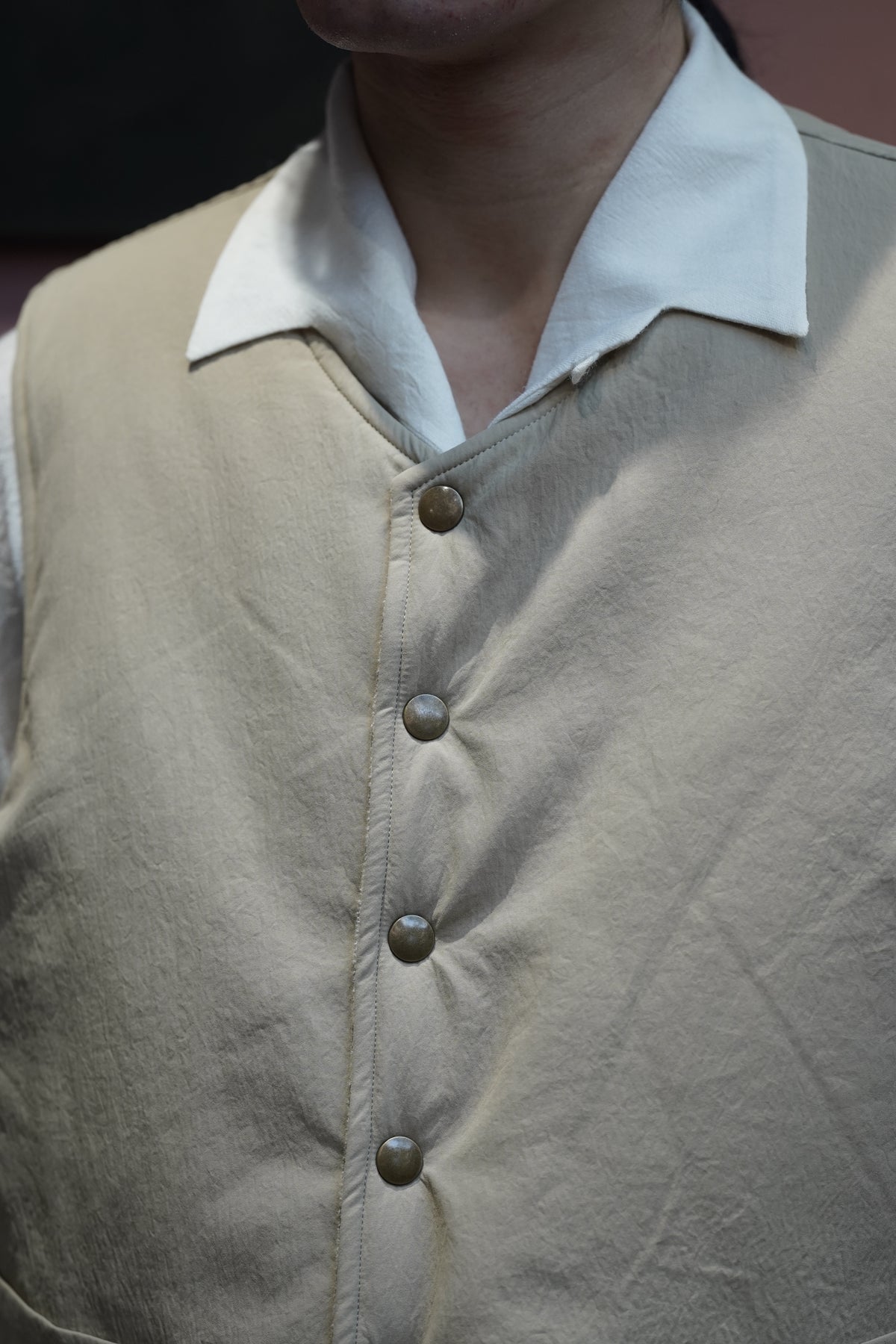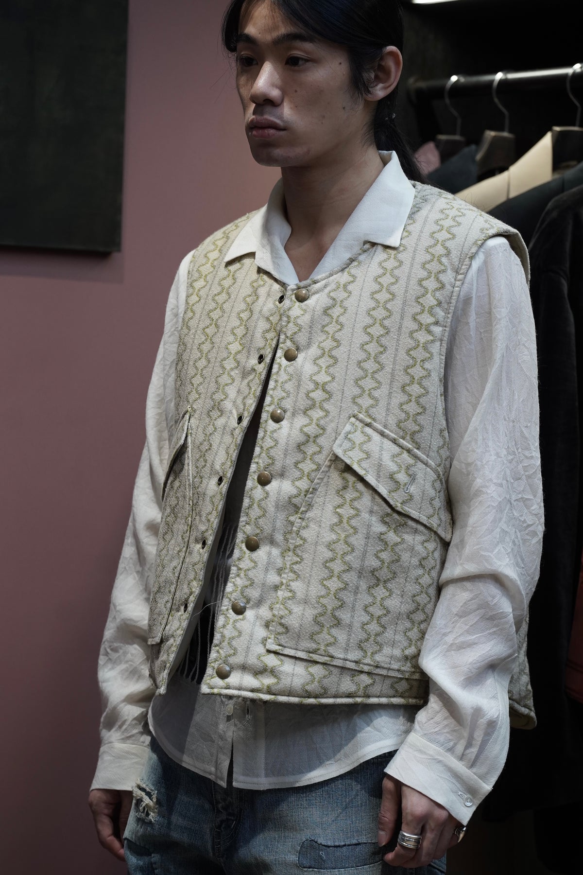 Made with water-repellent nylon that uses Taslan-based material for lightness.This is a reversible vest with padding that is made using an original fabric that is linked to the theme by printing a pattern from the braiding technique of Peru's Nazca culture on flannel fabric using an inkjet process, punching it blank with a needle punch, and then hooking it onto a thread to create an expression on the fabric.It is characterized by a change in the back of the front that is inspired by the mountains of the Andes.There is a zipper on the side of the back side (pattern side), which allows you to reduce the size and make it easy to use as an inner layer under outerwear. The three-dimensional pattern and padding make it elegant and comfortable to wear.