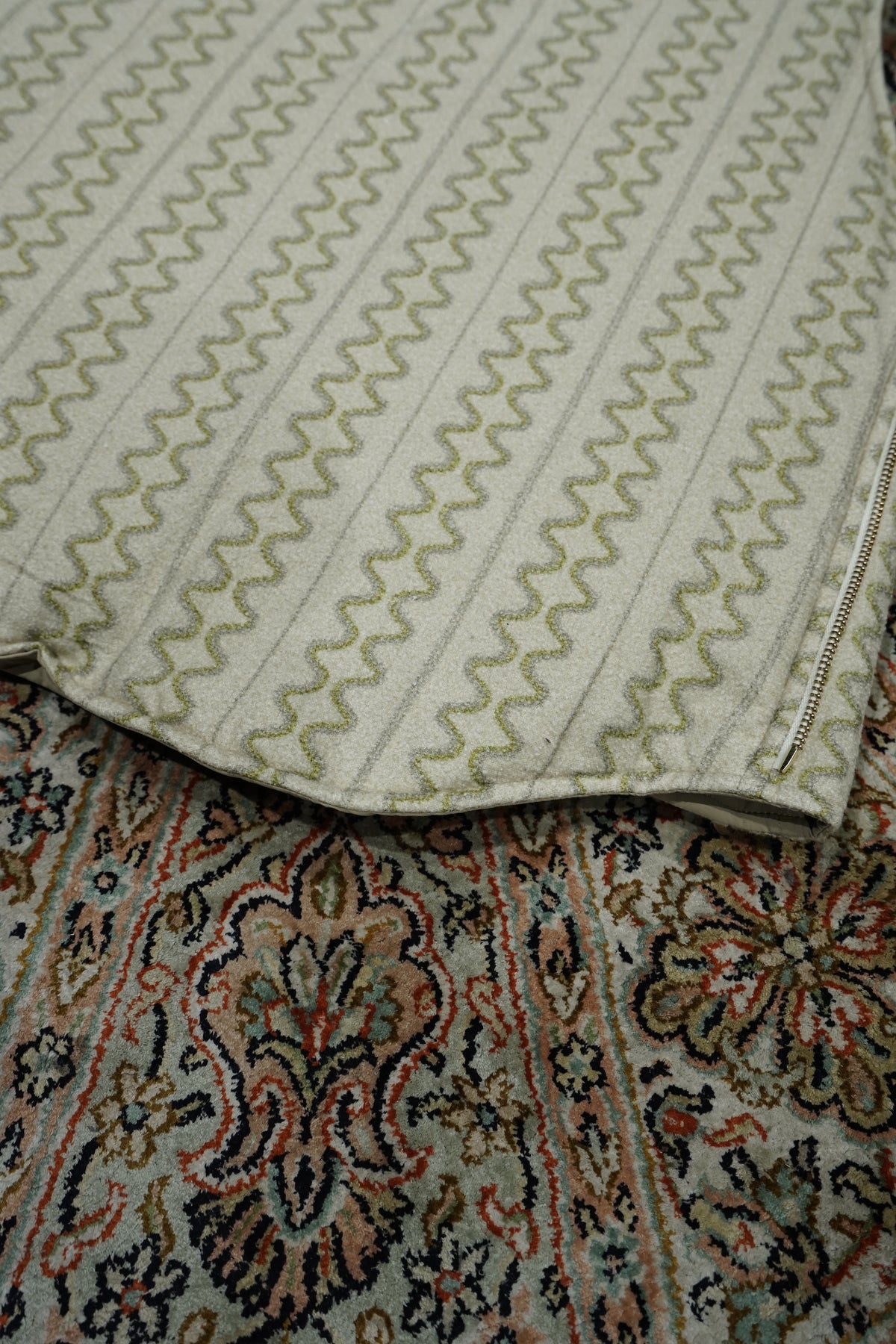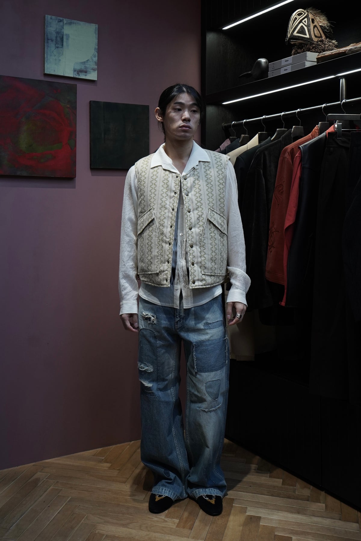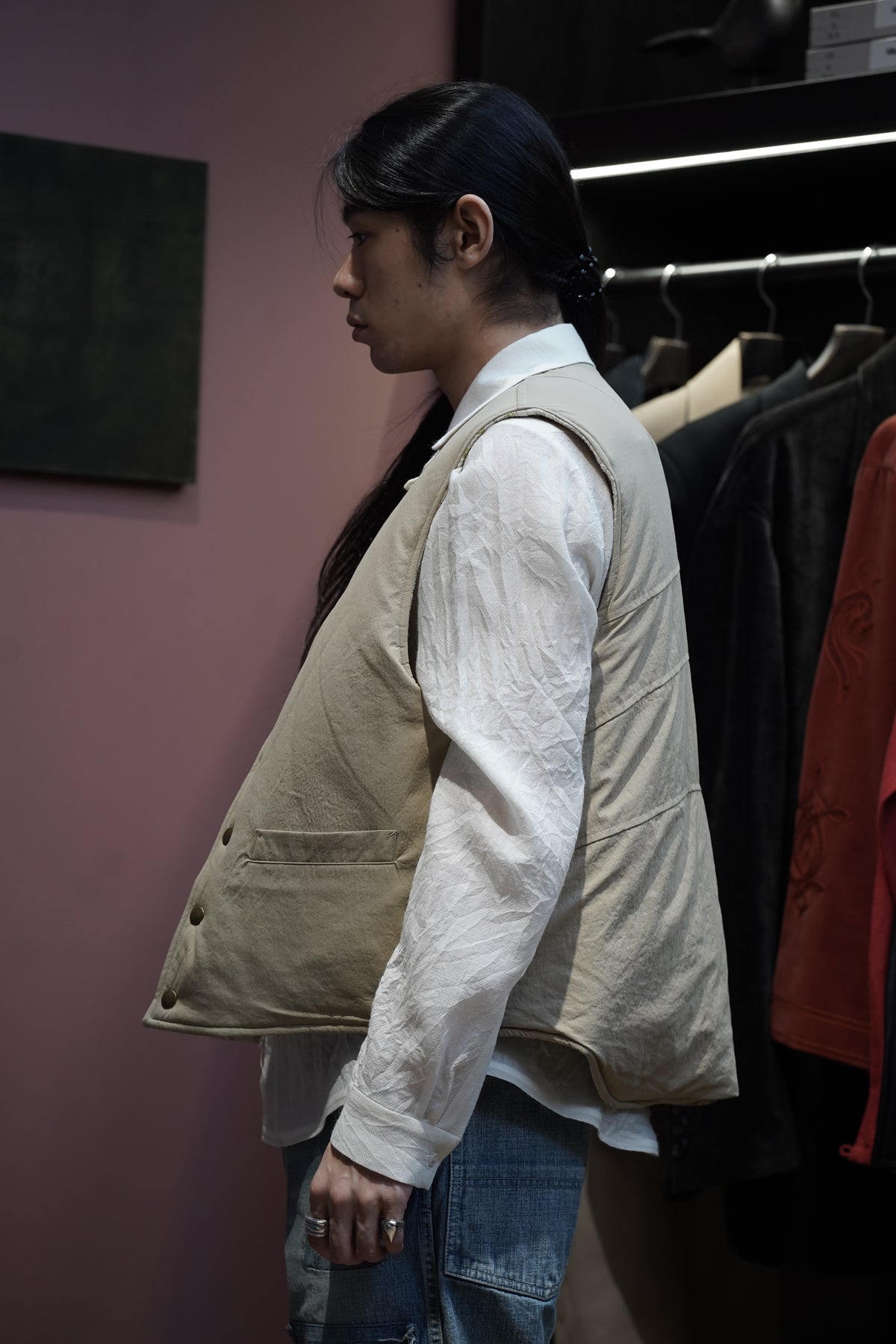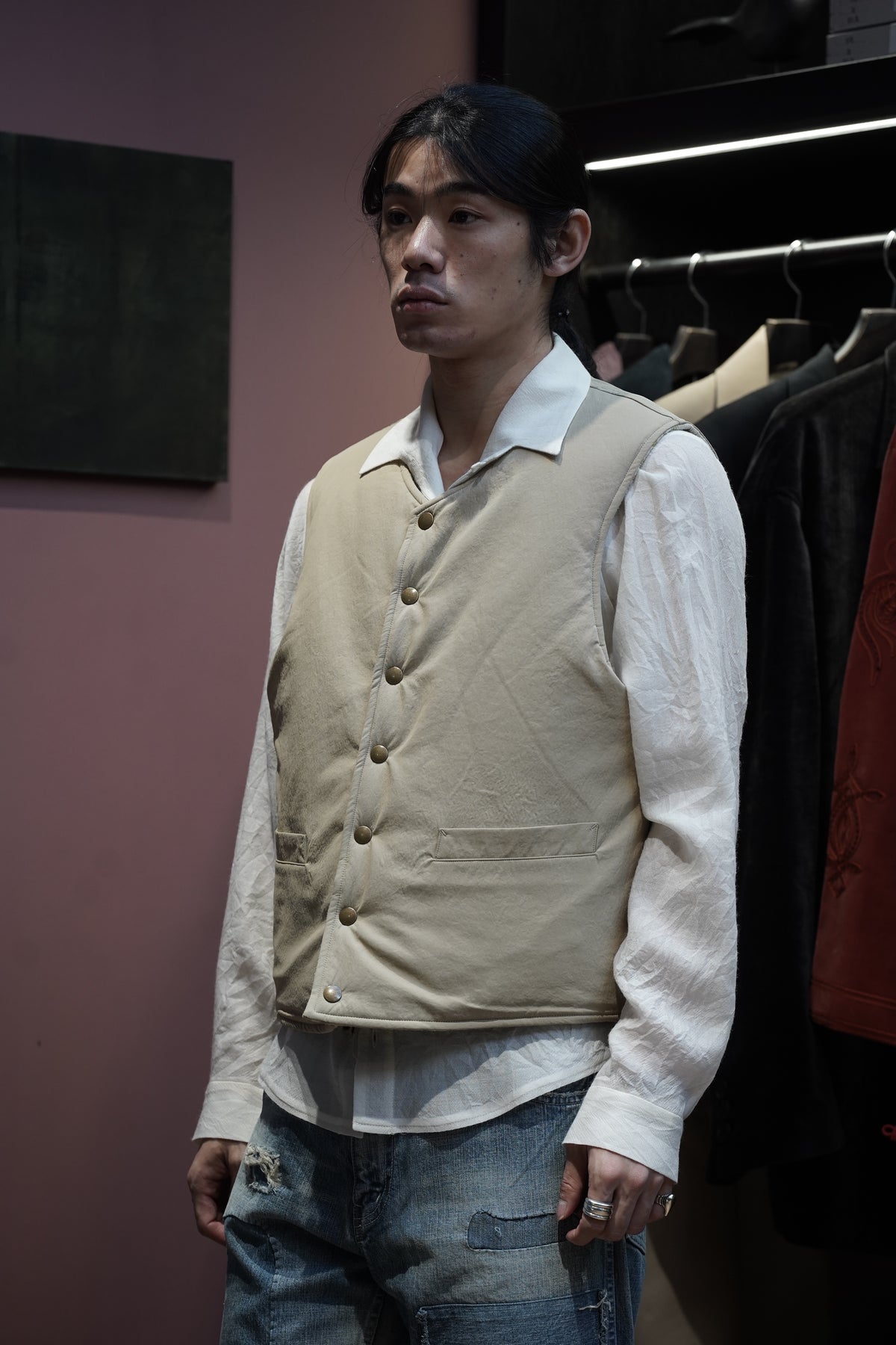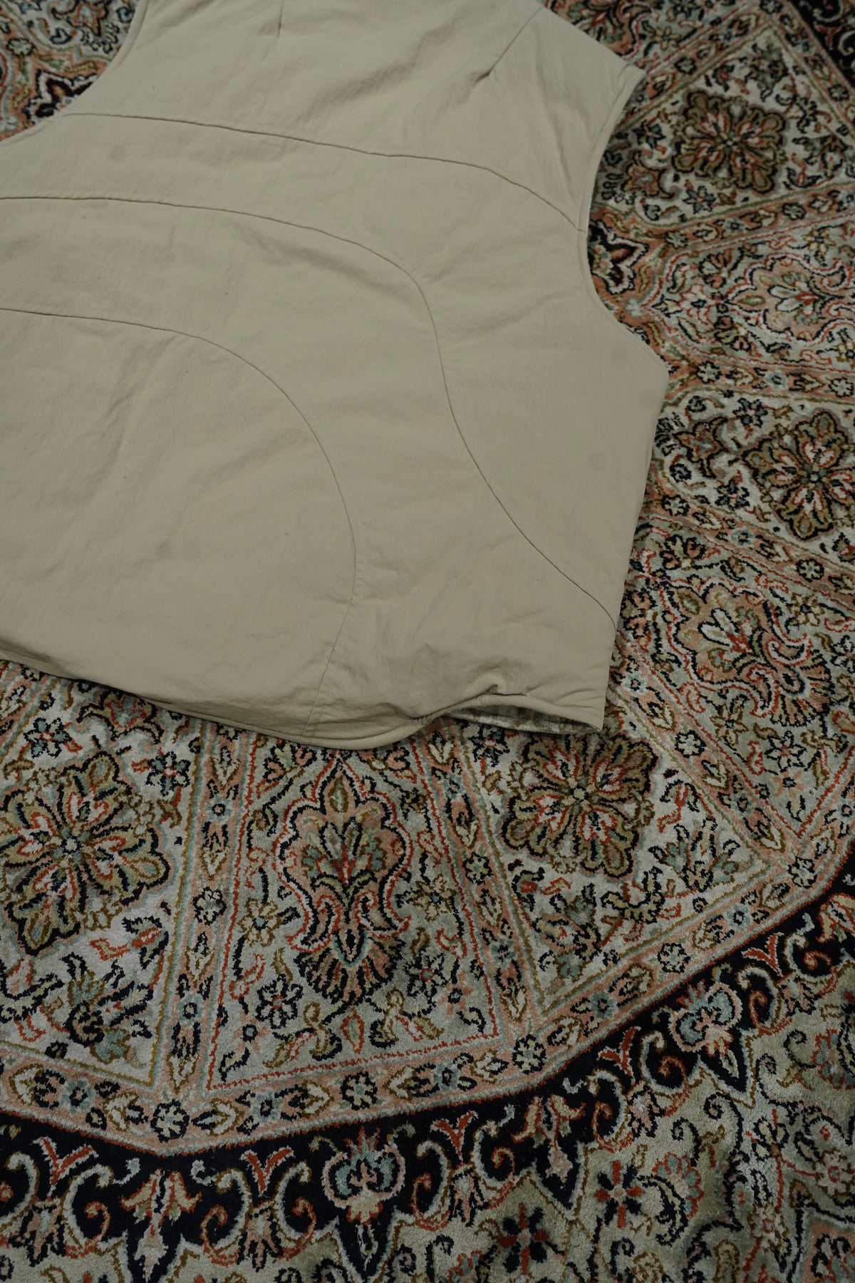 Made with water-repellent nylon that uses Taslan-based material for lightness.This is a reversible vest with padding that is made using an original fabric that is linked to the theme by printing a pattern from the braiding technique of Peru's Nazca culture on flannel fabric using an inkjet process, punching it blank with a needle punch, and then hooking it onto a thread to create an expression on the fabric.It is characterized by a change in the back of the front that is inspired by the mountains of the Andes.There is a zipper on the side of the back side (pattern side), which allows you to reduce the size and make it easy to use as an inner layer under outerwear. The three-dimensional pattern and padding make it elegant and comfortable to wear.