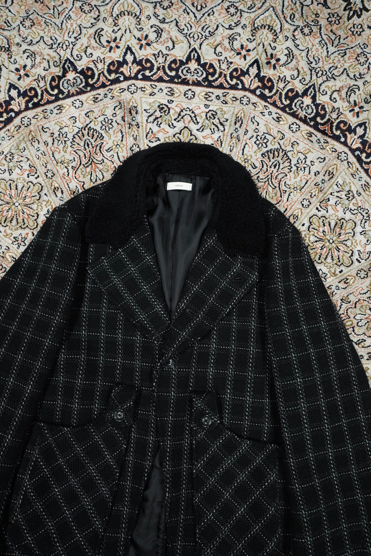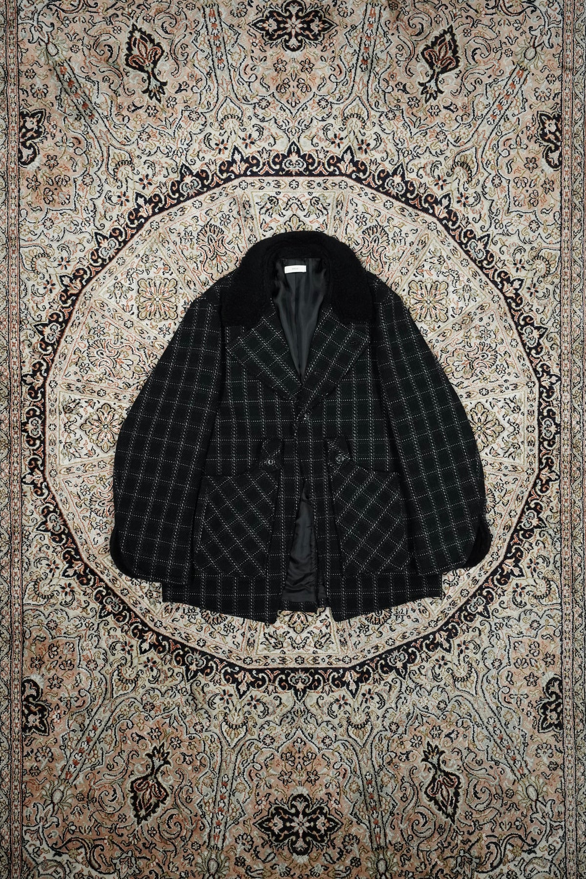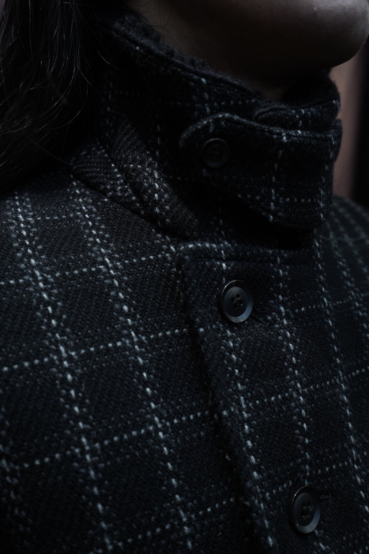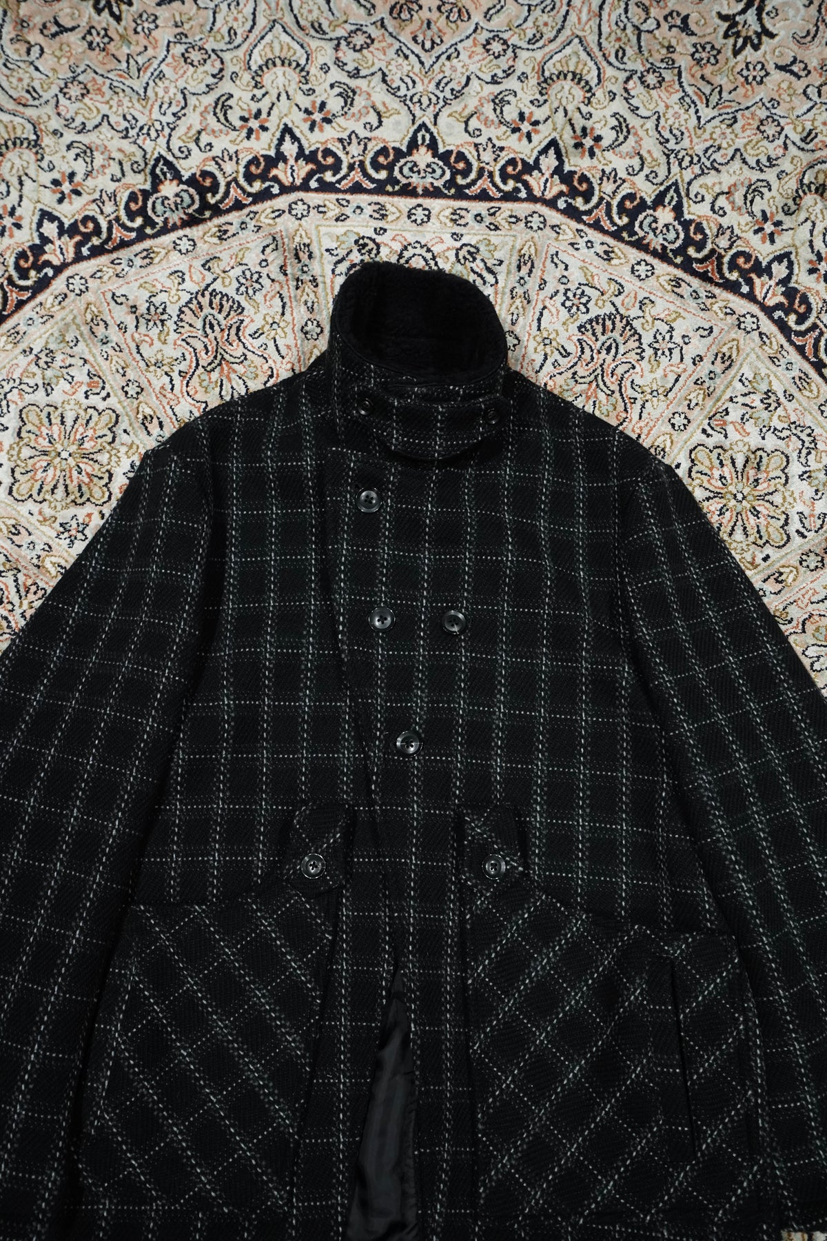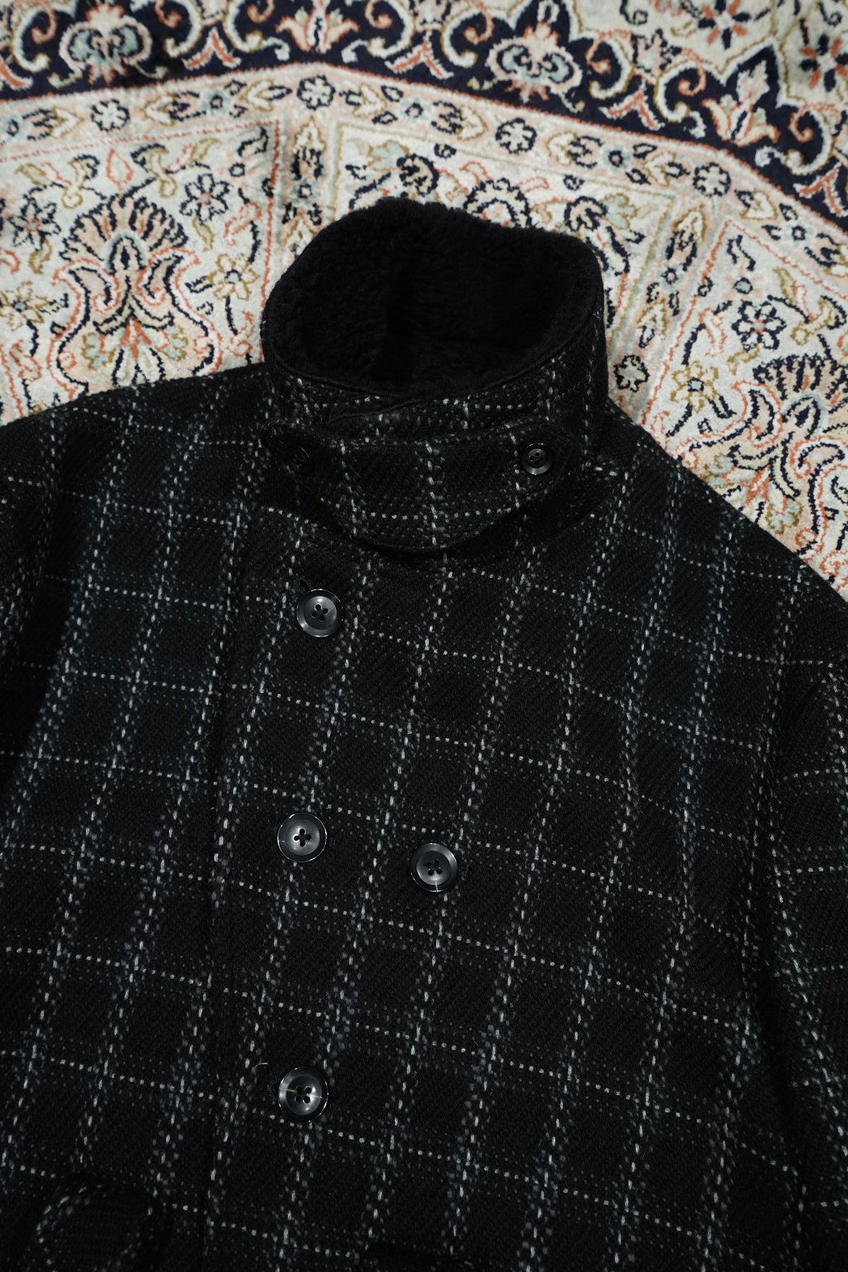 Based on the Nazca civilization spring technique linked to this season's theme.An original tweed fabric woven with the image of a diagonal twill weave.The Used and tailored coat. While creating volume by twisting 4 strands of 1/10Craftsmen carefully weave it so that the surface looks beautiful. On the collar and cuffsMade of 100% wool boa. Lapel can be worn closed or open It's a pattern. The collar can be raised and fastened with a chinstrap.It can be worn in a variety of ways. This coat symbolizes this season.