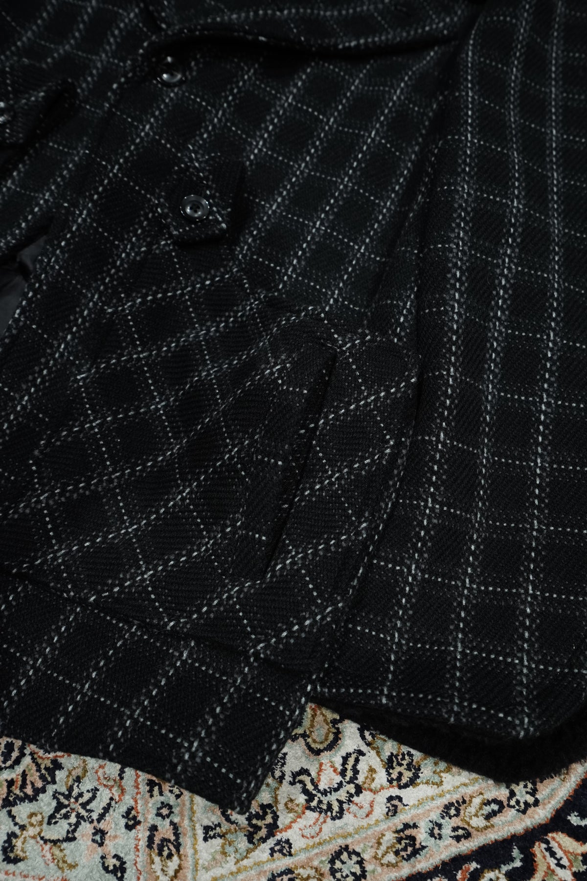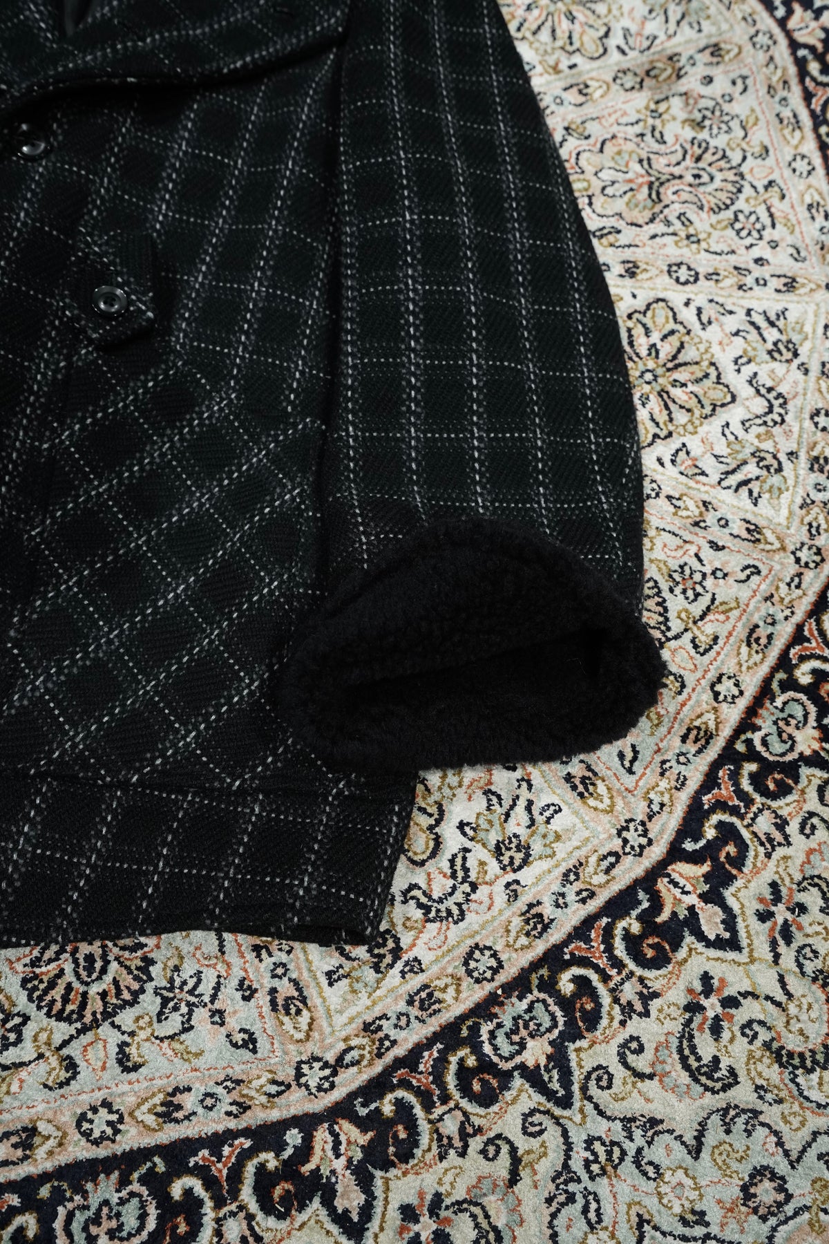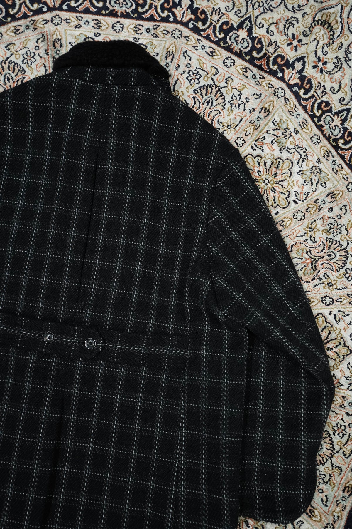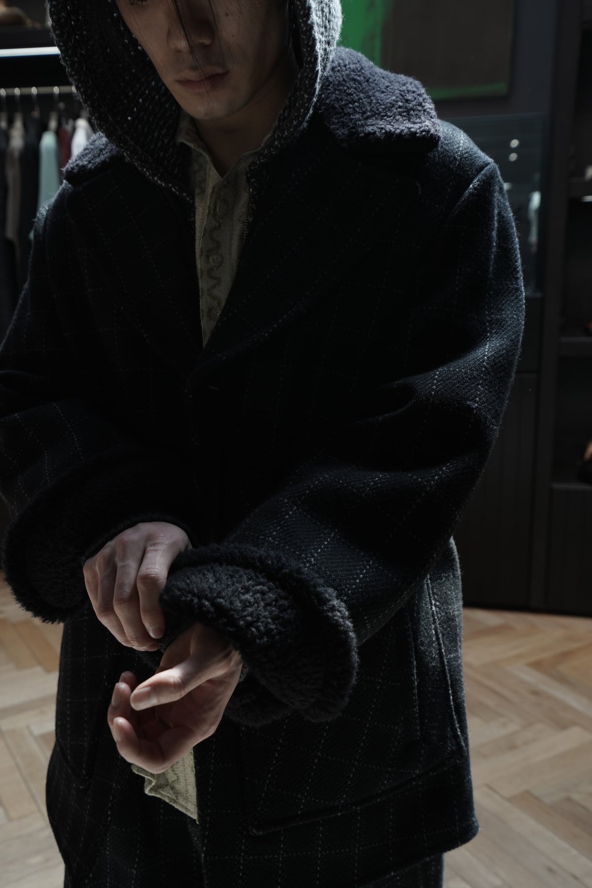 Based on the Nazca civilization spring technique linked to this season's theme.An original tweed fabric woven with the image of a diagonal twill weave.The Used and tailored coat. While creating volume by twisting 4 strands of 1/10Craftsmen carefully weave it so that the surface looks beautiful. On the collar and cuffsMade of 100% wool boa. Lapel can be worn closed or open It's a pattern. The collar can be raised and fastened with a chinstrap.It can be worn in a variety of ways. This coat symbolizes this season.
