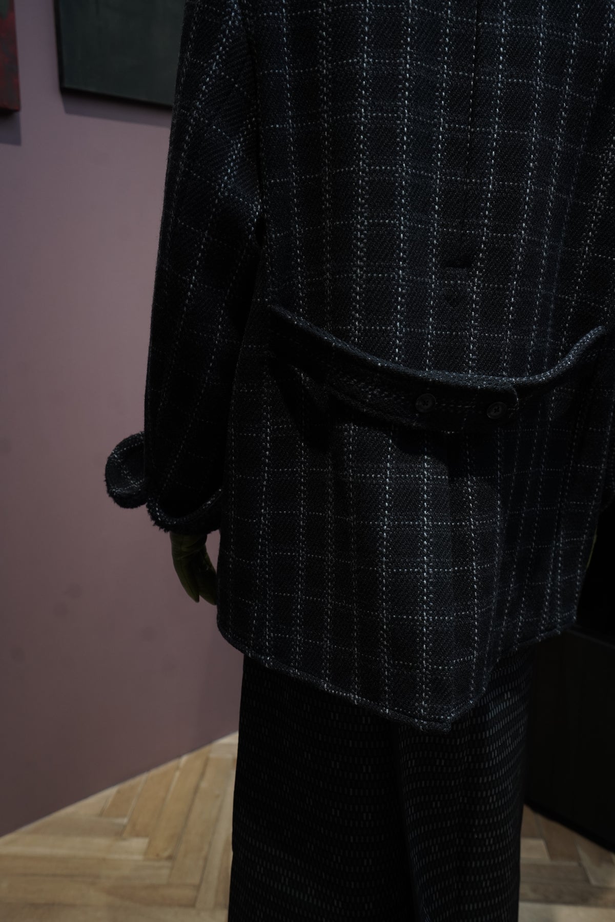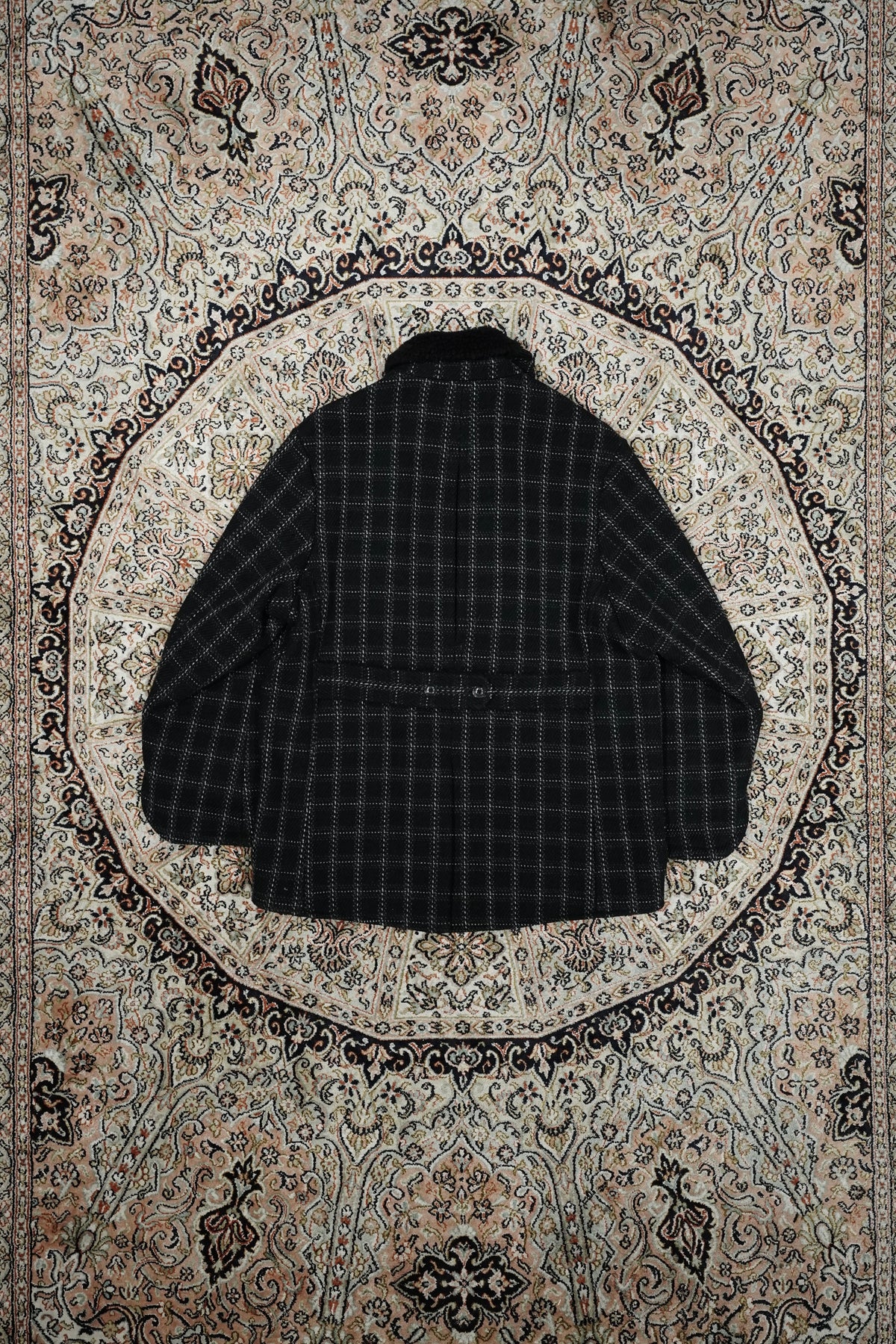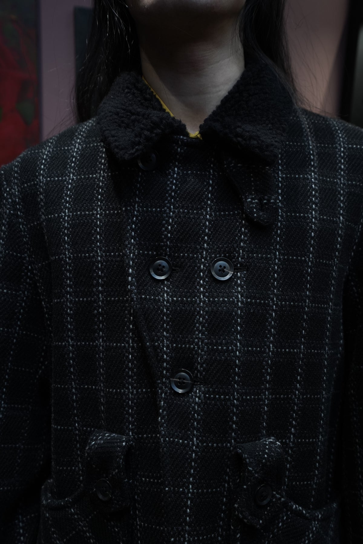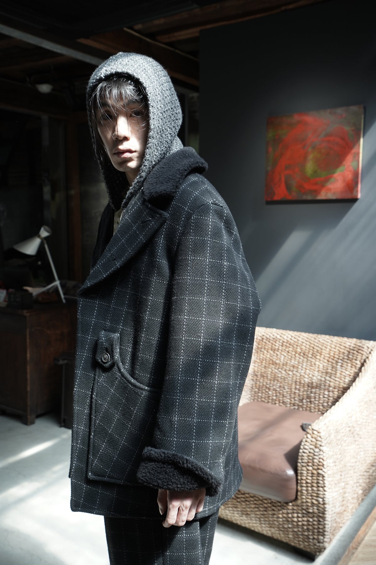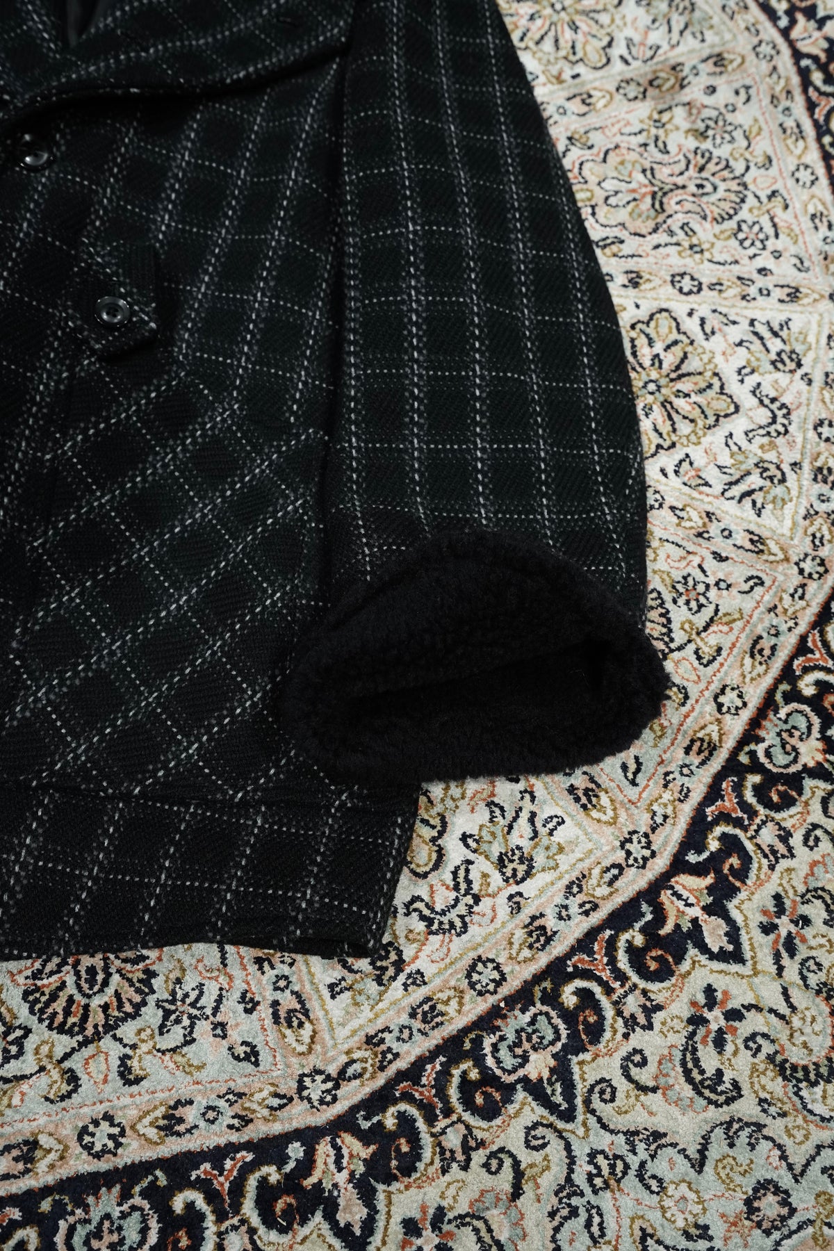 Based on the Nazca civilization spring technique linked to this season's theme.An original tweed fabric woven with the image of a diagonal twill weave.The Used and tailored coat. While creating volume by twisting 4 strands of 1/10Craftsmen carefully weave it so that the surface looks beautiful. On the collar and cuffsMade of 100% wool boa. Lapel can be worn closed or open It's a pattern. The collar can be raised and fastened with a chinstrap.It can be worn in a variety of ways. This coat symbolizes this season.