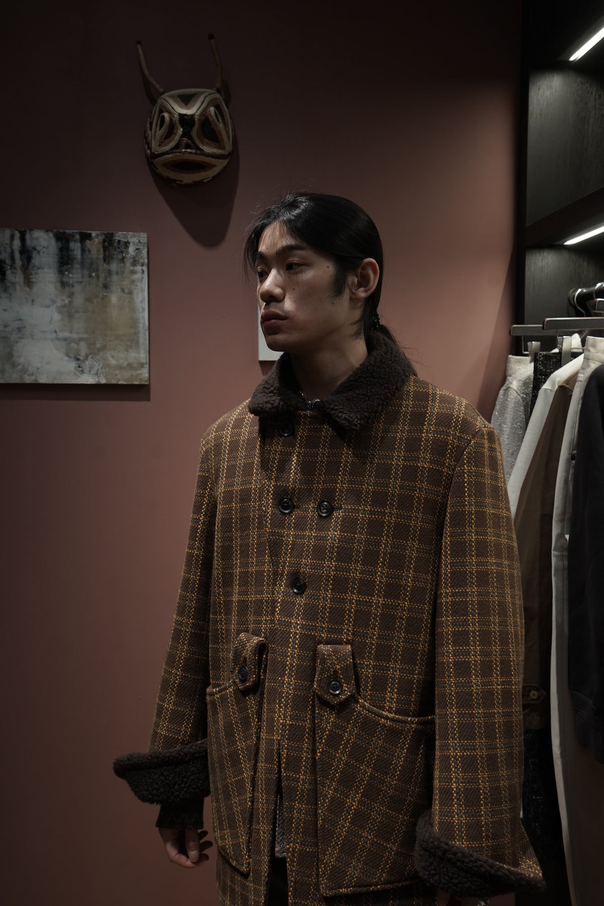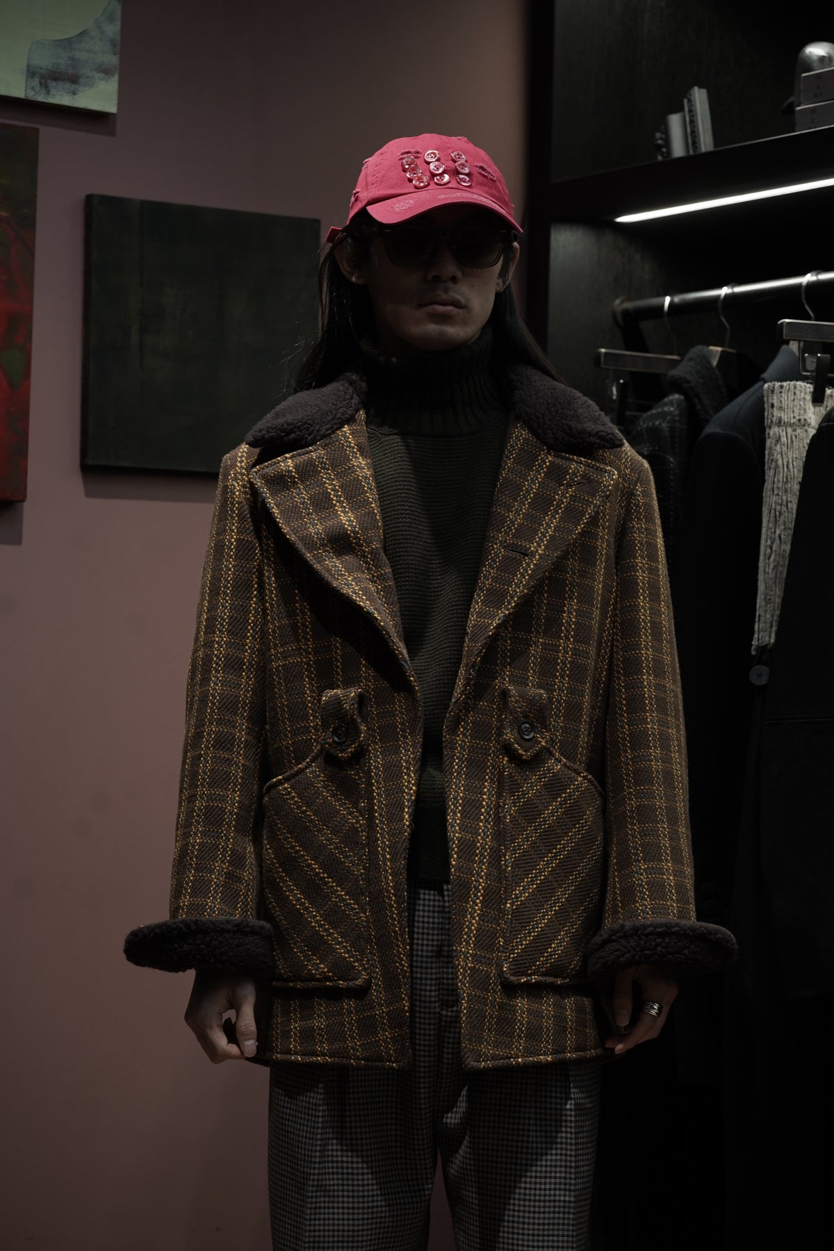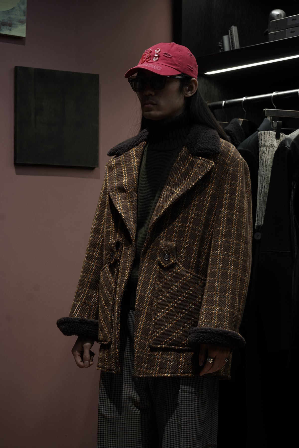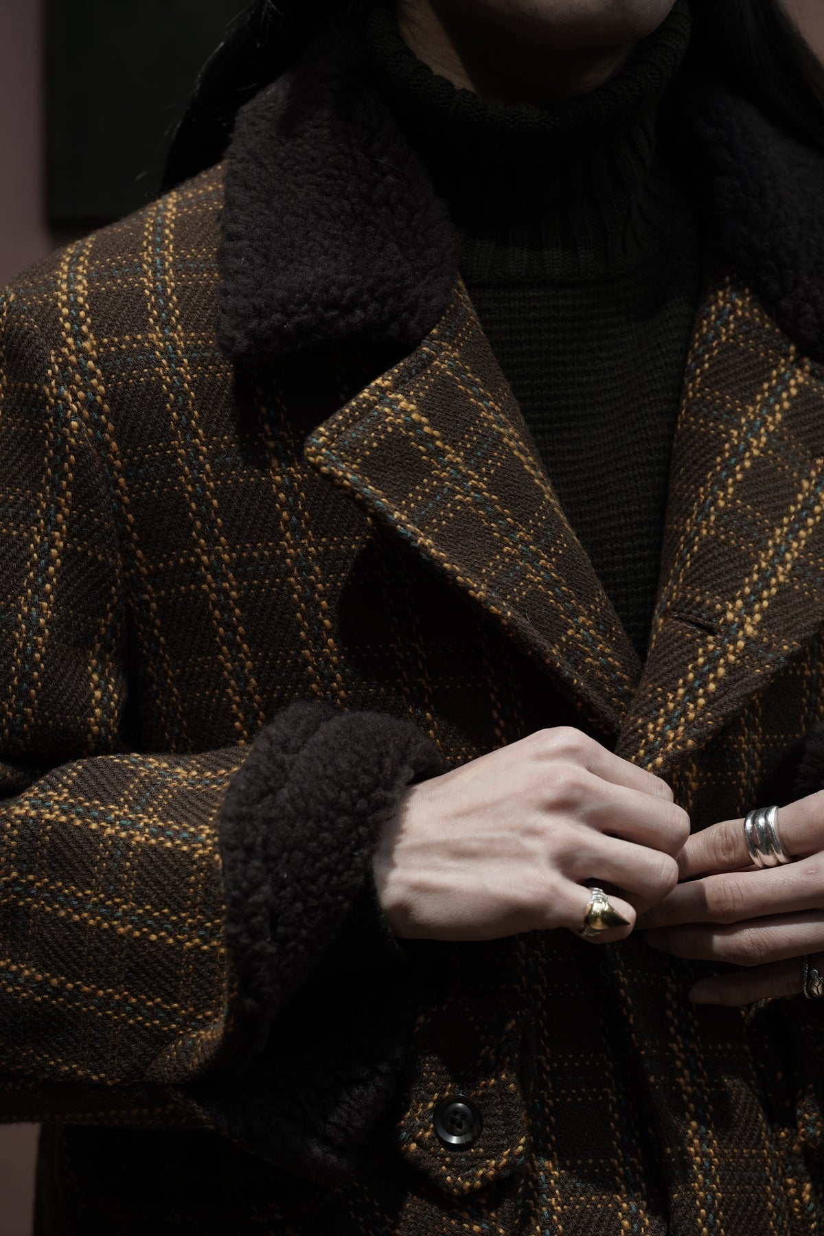 Based on the Nazca civilization spring technique linked to this season's theme.An original tweed fabric woven with the image of a diagonal twill weave.The Used and tailored coat. While creating volume by twisting 4 strands of 1/10Craftsmen carefully weave it so that the surface looks beautiful. On the collar and cuffsMade of 100% wool boa. Lapel can be worn closed or open It's a pattern. The collar can be raised and fastened with a chinstrap.It can be worn in a variety of ways. This coat symbolizes this season.