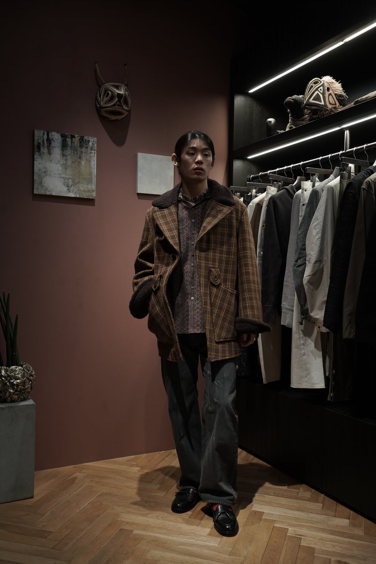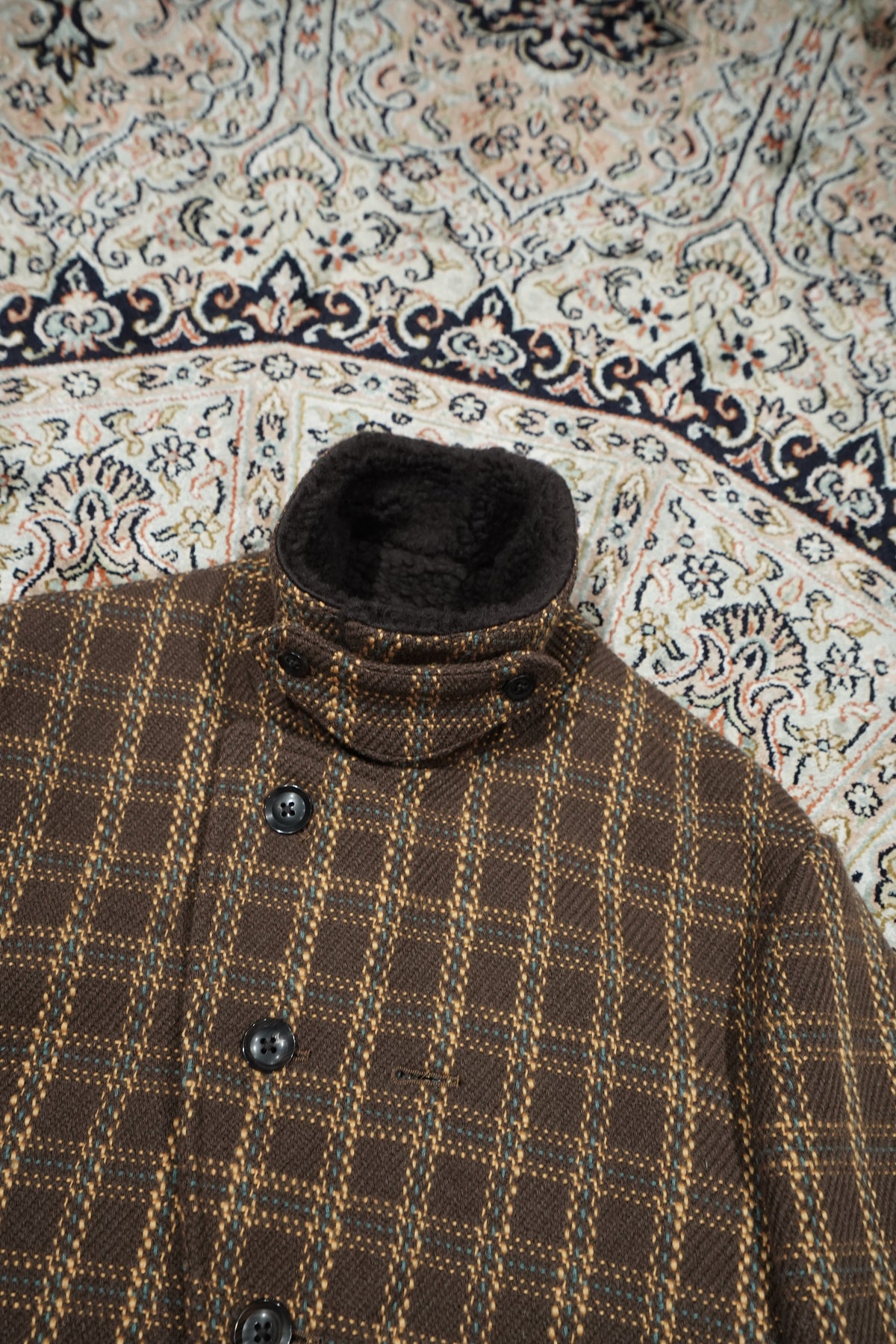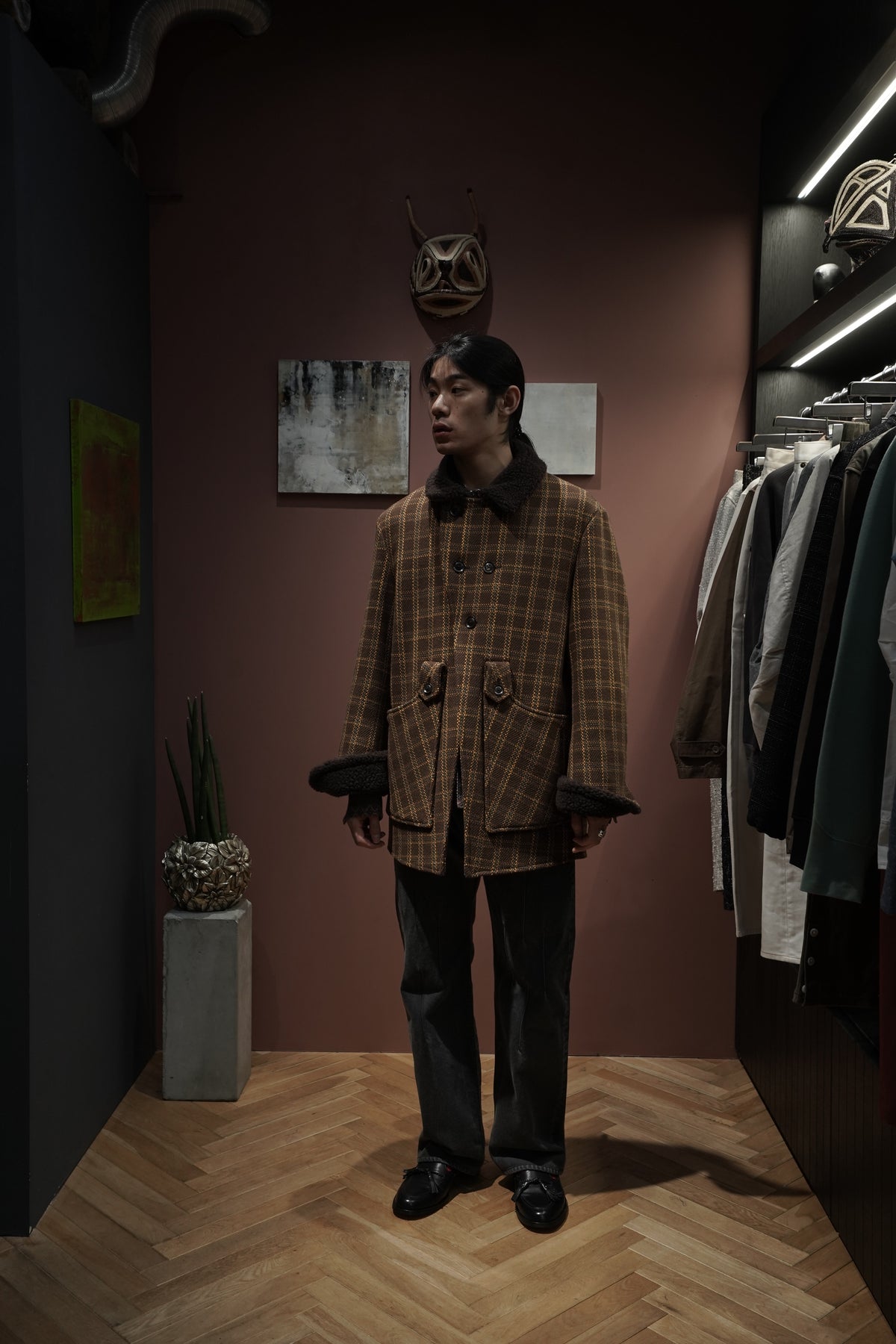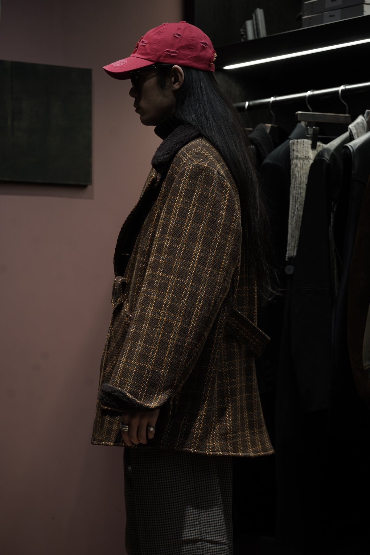 Based on the Nazca civilization spring technique linked to this season's theme.An original tweed fabric woven with the image of a diagonal twill weave.The Used and tailored coat. While creating volume by twisting 4 strands of 1/10Craftsmen carefully weave it so that the surface looks beautiful. On the collar and cuffsMade of 100% wool boa. Lapel can be worn closed or open It's a pattern. The collar can be raised and fastened with a chinstrap.It can be worn in a variety of ways. This coat symbolizes this season.