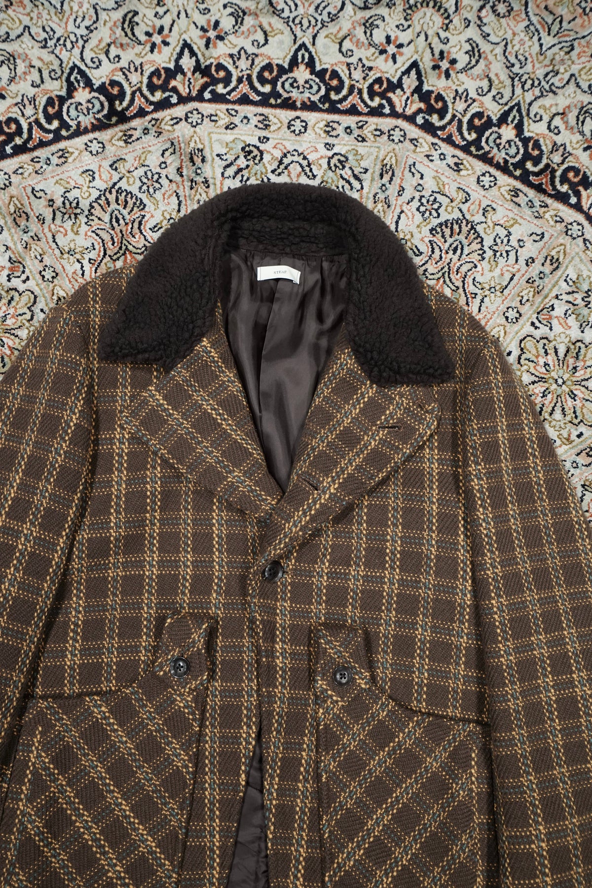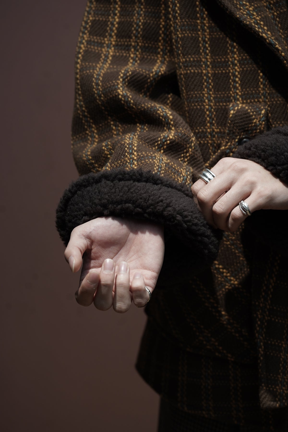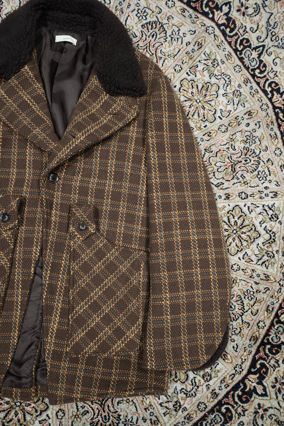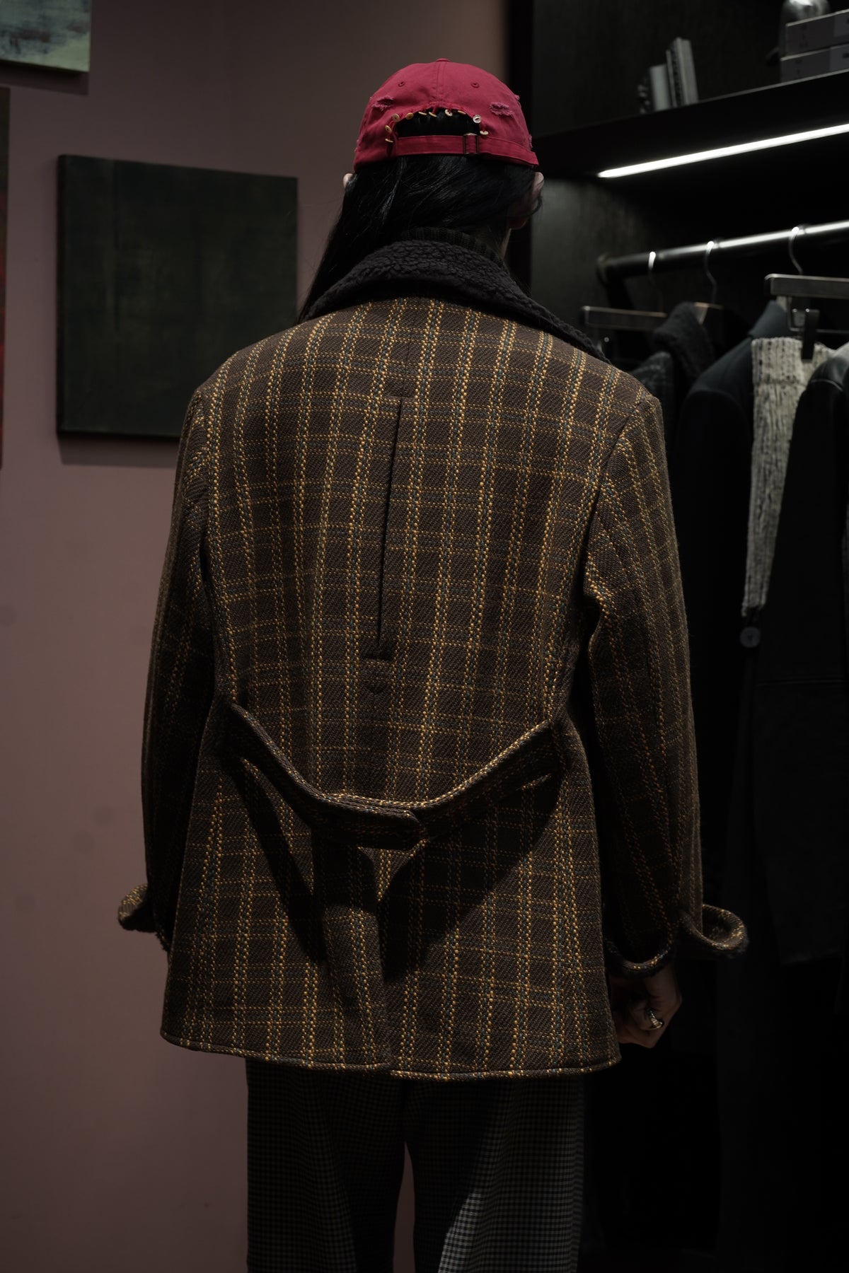 Based on the Nazca civilization spring technique linked to this season's theme.An original tweed fabric woven with the image of a diagonal twill weave.The Used and tailored coat. While creating volume by twisting 4 strands of 1/10Craftsmen carefully weave it so that the surface looks beautiful. On the collar and cuffsMade of 100% wool boa. Lapel can be worn closed or open It's a pattern. The collar can be raised and fastened with a chinstrap.It can be worn in a variety of ways. This coat symbolizes this season.