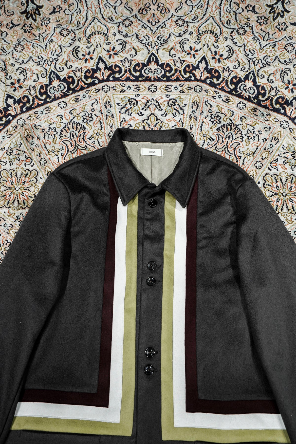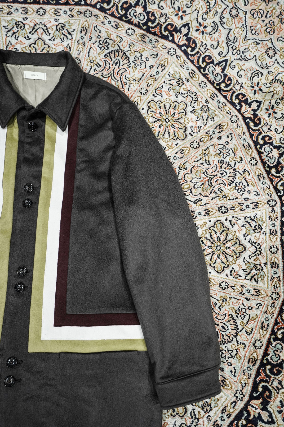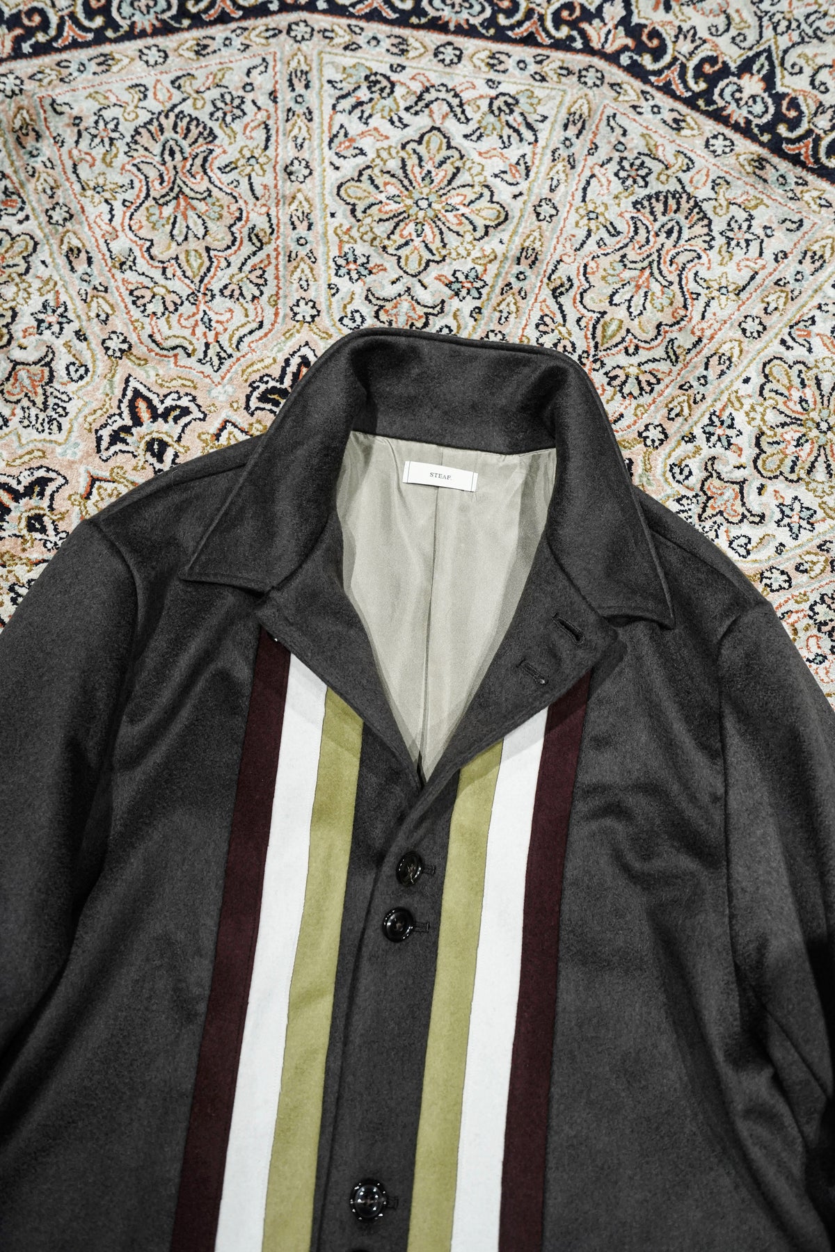 Appeared in STEAF's 1st collection and sold out as soon as it was released.A special item that has been rebuilt from GRADATION COAT.The base fabric is made by a manufacturer located in the Burrato region of Italy."MTR" PURE CASHMERE 100% extremely rare material is used with beaver finish, and the color scheme is STEAF's 25AWWe selected wool with a color scheme inspired by the theme of ``Himno Andino.''The lining of the body is luxuriously made with 100% SILK lining, and the lining of the sleeves is made of the strongest Bemberg to prevent snagging on the sleeves.And the pattern is GRADATION, which is 4 years after its release. Searching for the silhouette that you want to wear now based on COATLike STEAF, it has been redrawn three-dimensionally in pursuit of high-quality comfort.