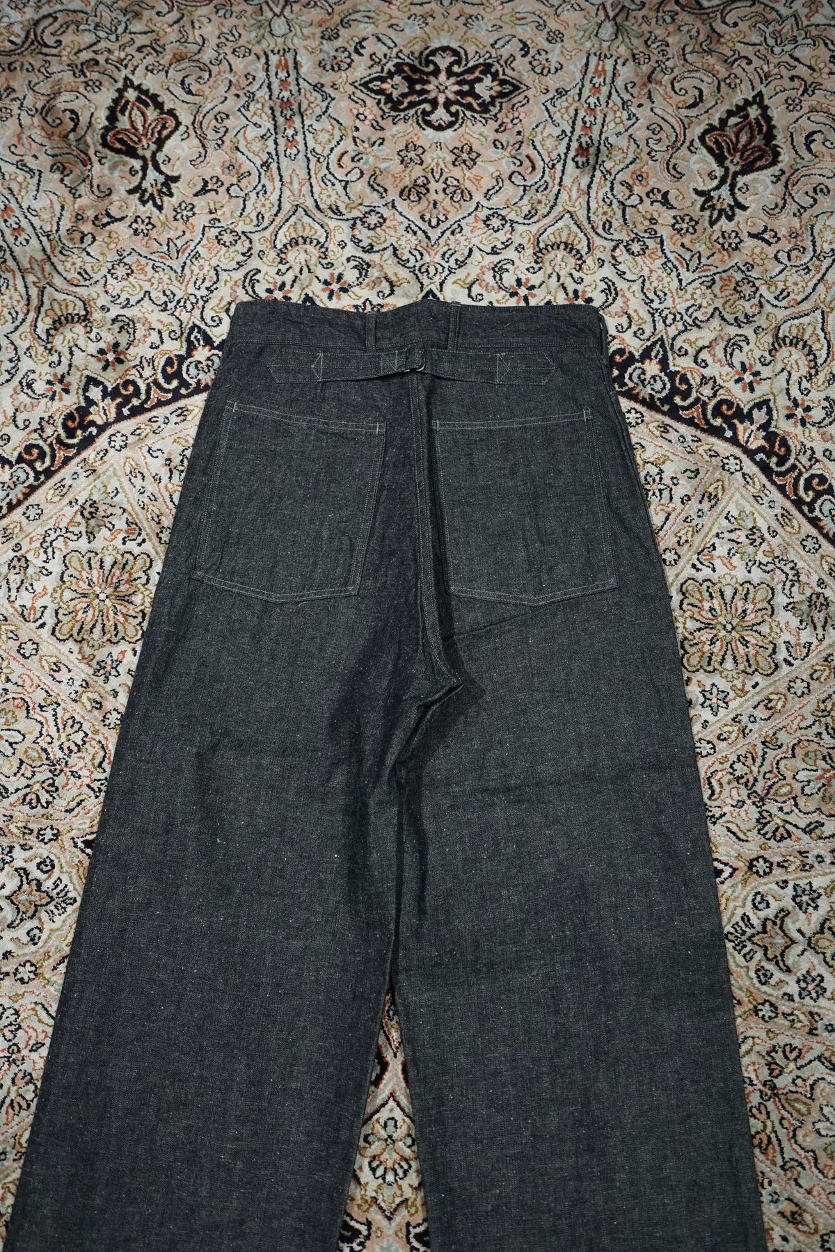 The CCC (Civilian Conservation Corps) denim pants were also developed in 1908 for the Coastal Infantry (Army).Coast Artillery Corps)'s pants have been updated. Like a pullover,These pants were also registered as "SPEC6-124" in 1919, but after some minor modifications were made to the pattern,In 1933, it was re-registered as "SPEC6-124A". Large patch pockets on the front and backThis is one of the features of this design. The sizes provided at that time were quite rough, soThe est was designed to be adjusted with a cinch back. White thread was often used for stitching, but grayExamples have also been confirmed, and this is reflected in the design of Lot.719.As for the fabric, we used an original denim fabric that was newly developed by analyzing the denim fabrics of the time.This fabric uses green cast indigo-dyed warp yarns and ecru-tinted weft yarns devised by Takahashi.By adjusting the count and increasing the number of strokes while maintaining the color, the texture of 1/2 right twill creates a constant texture.It has a rich expression that is different from the left twill denim.