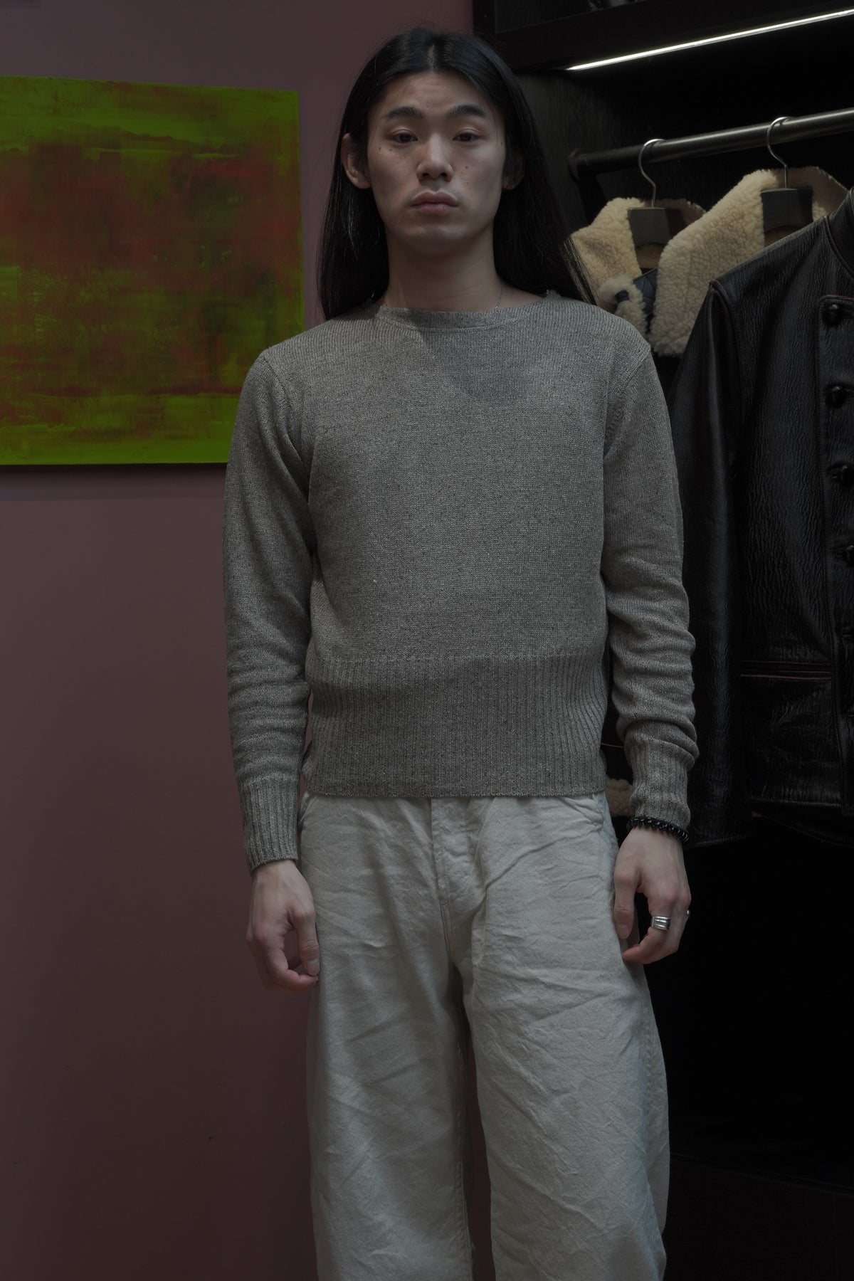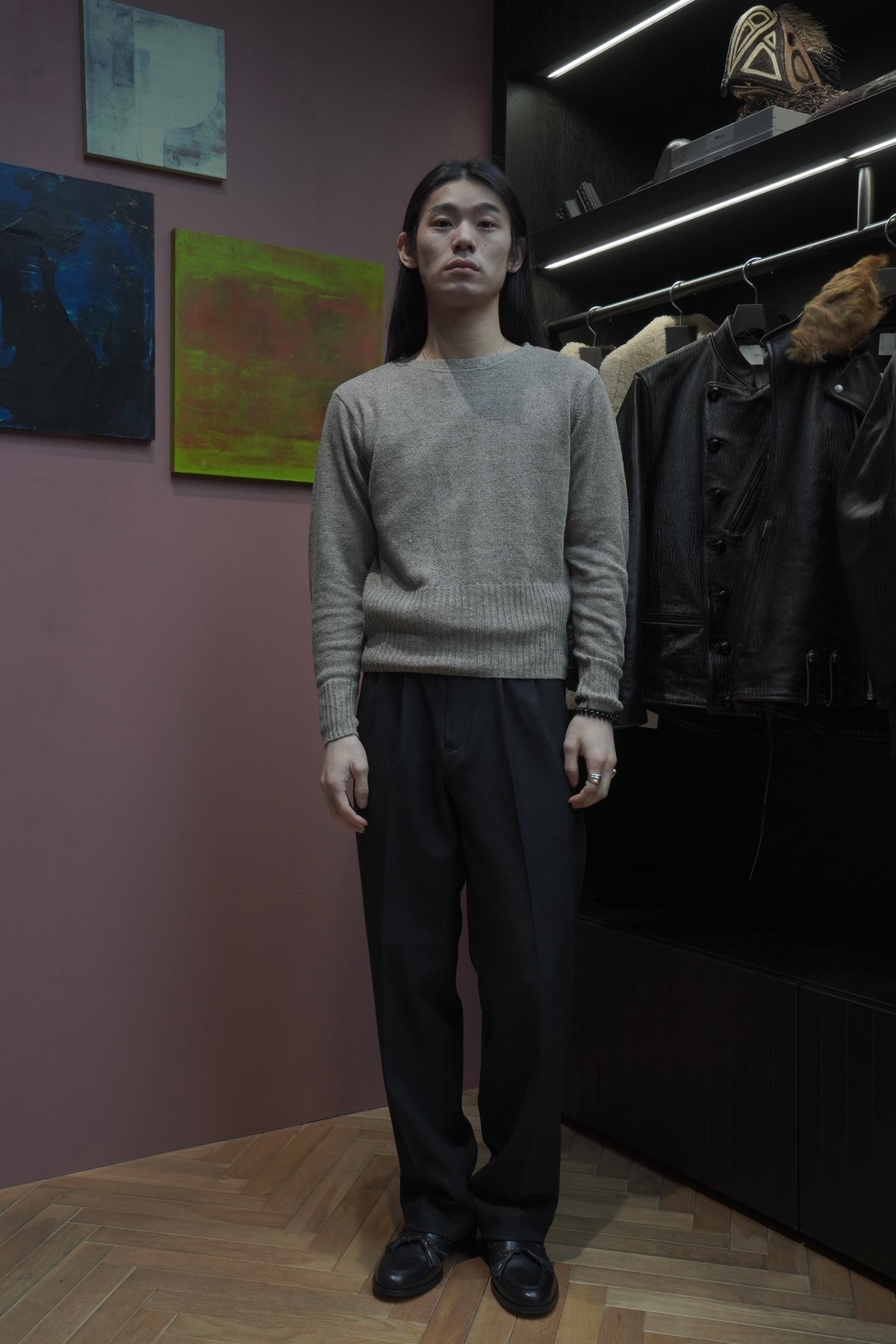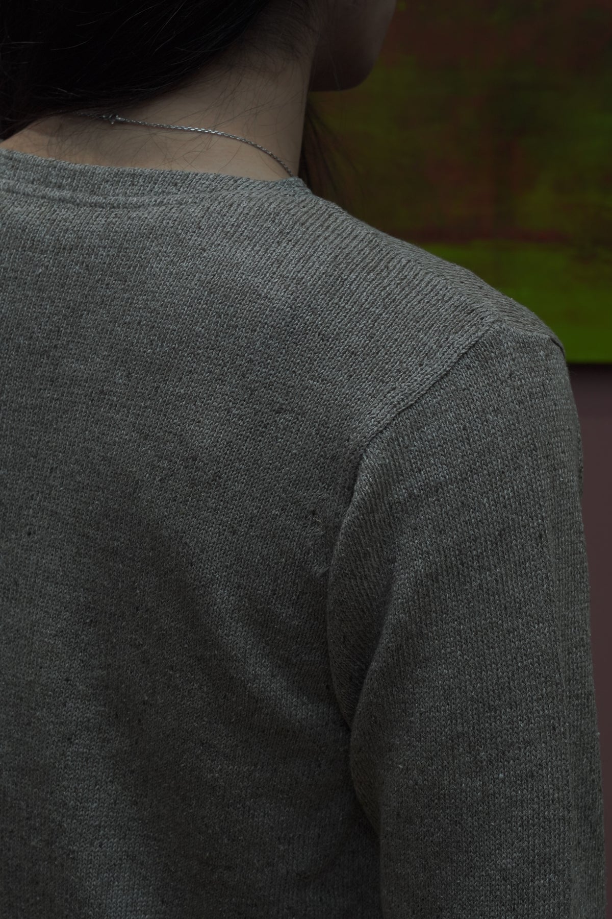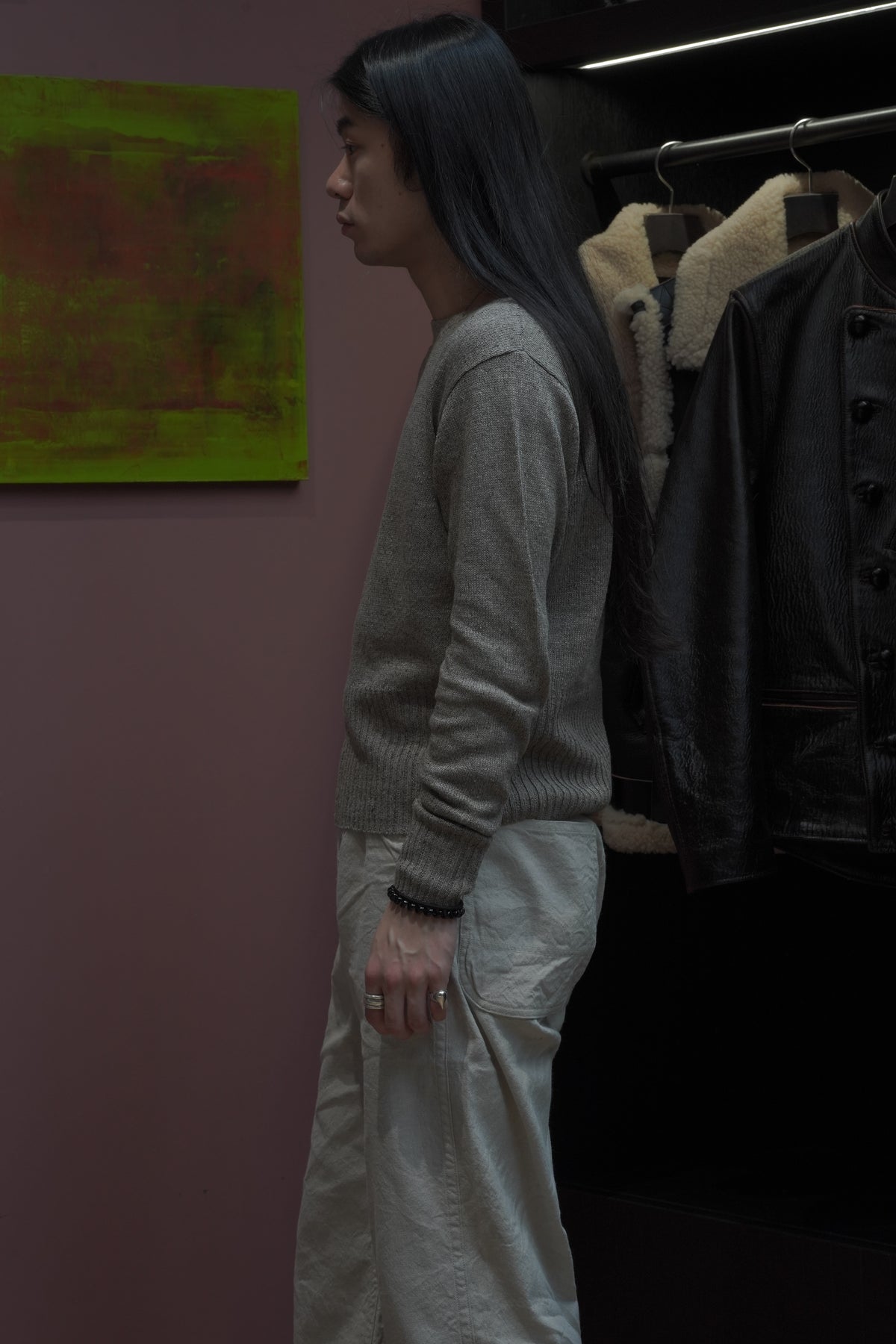Une pièce conçue sur la base du pull American Varsity Letterman des années 1950. début américainEn tant que vêtements de sport, les pulls portaient à l'époque le nom de l'université cousu sur la poitrine. Cette lettre dans T.T.Le design s'inspire d'un pull vintage de Californie, dont les patchs ont été supprimés.Je l'ai refait.En tricotant avec un mélange de fils de soie et de lin, la stabilité du tricot est augmentée, tandis que la caractéristique de sécheresse des vêtements de seconde main est améliorée.Cela représente le toucher.