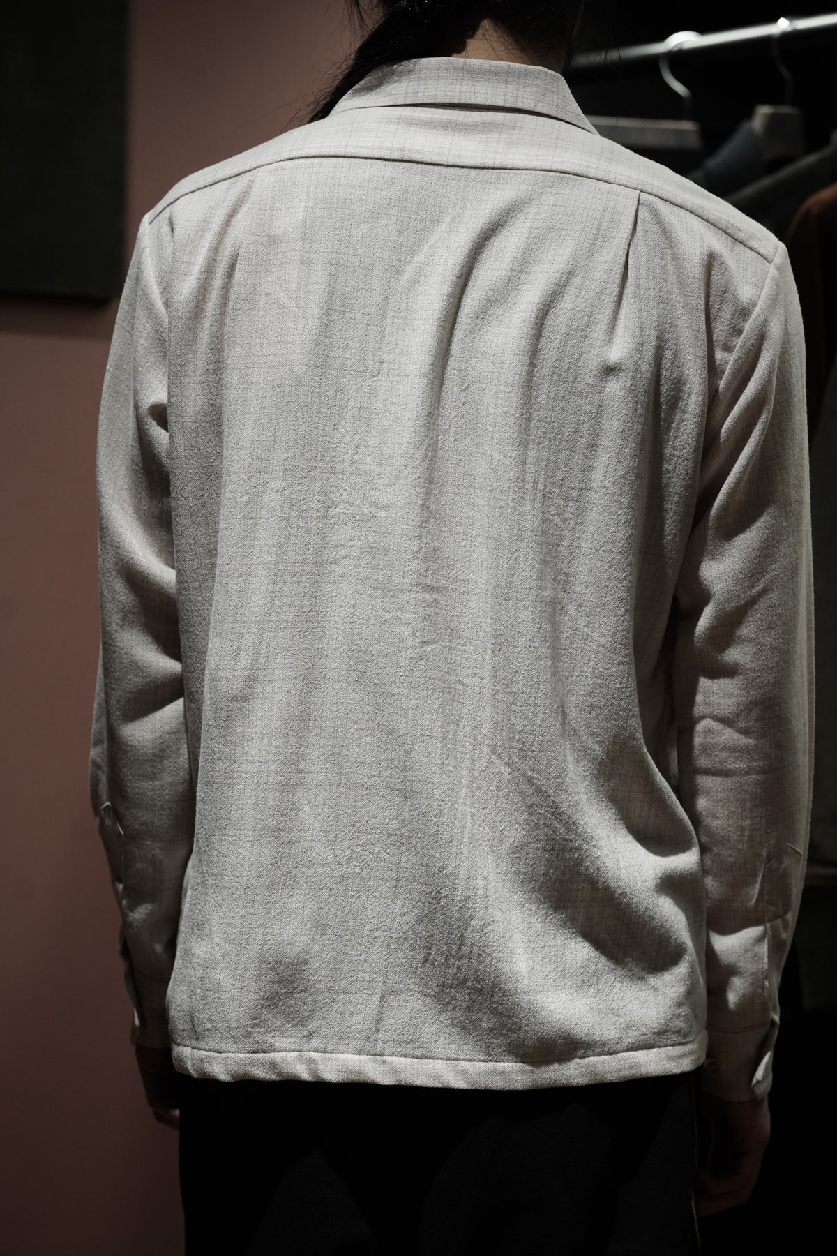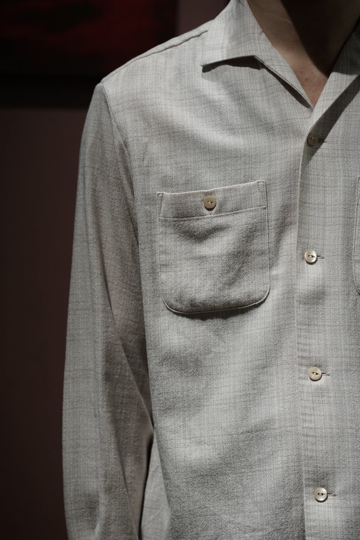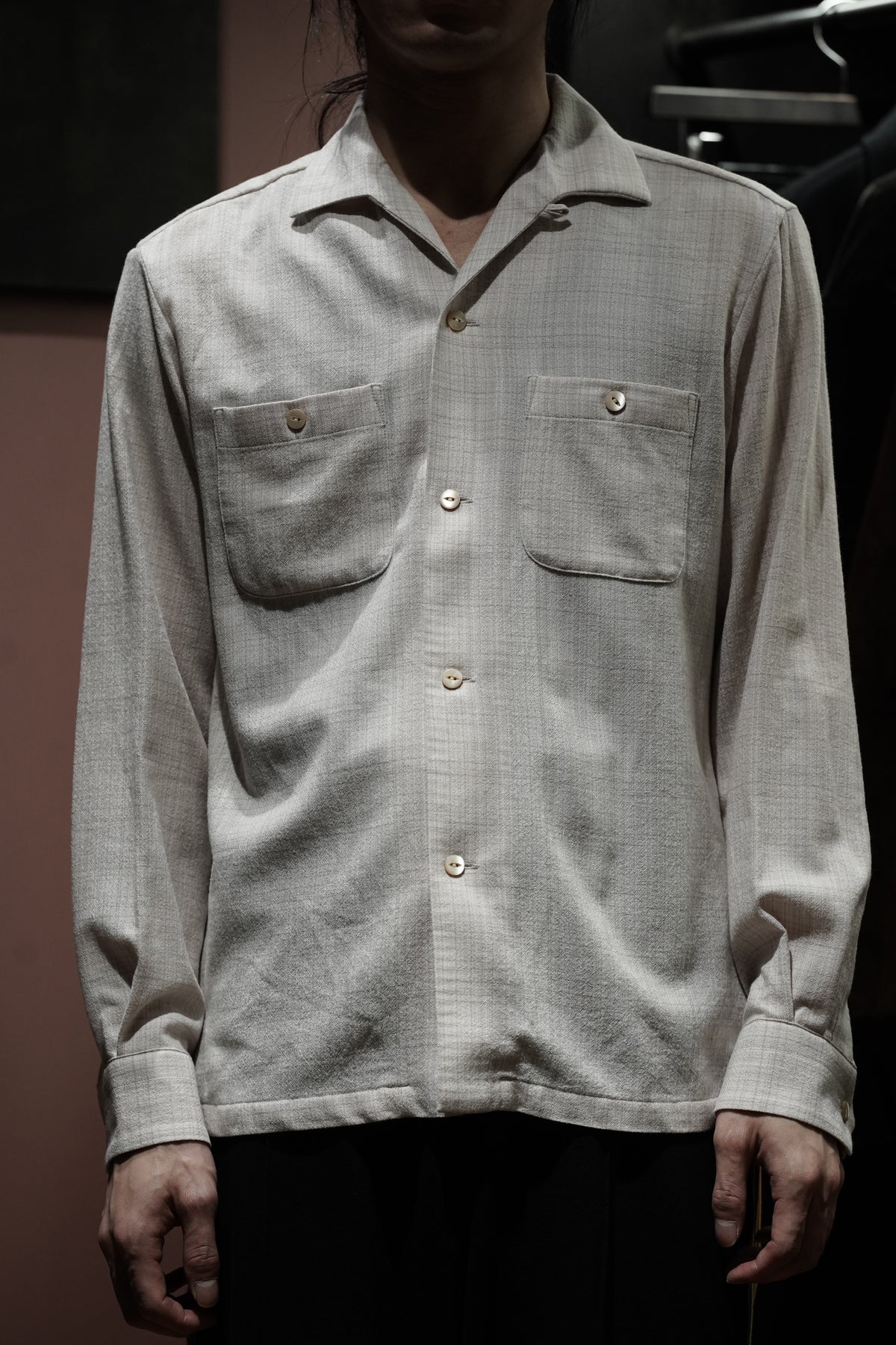 1950년대 미국산 이탈리안 칼라 셔츠를 기반으로 한 디자인입니다.제2차 세계대전 이후 경제 호황기에 휴양지에서 캐주얼 셔츠로 인기를 끌었던 셔츠로, 곡선 형태를 갖고 있다.개구부가 넓은 것이 특징입니다. 당시에는 리조트에서 티셔츠를 입는 문화가 전무했기 때문에 여유로운 룩에 딱 맞는 액세서리였습니다.아이템으로 여겨졌습니다.원단은 캐시미어처럼 얇은 SUPER180 울사를 사용하여 독창적인 가스리풍 패턴을 만들어냅니다.섬세한 질감을 살리기 위해 봉제를 프렌치 솔기로 변경하고, 가볍고 우아한 느낌을 줄 수 있도록 새롭게 디자인하였습니다.이다.