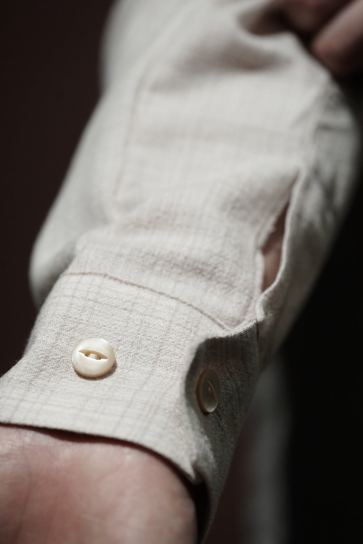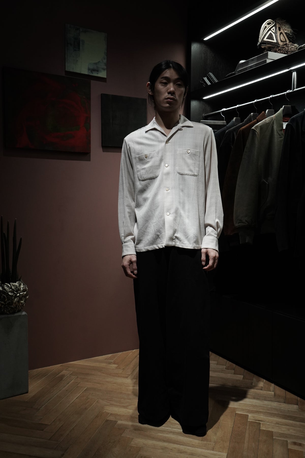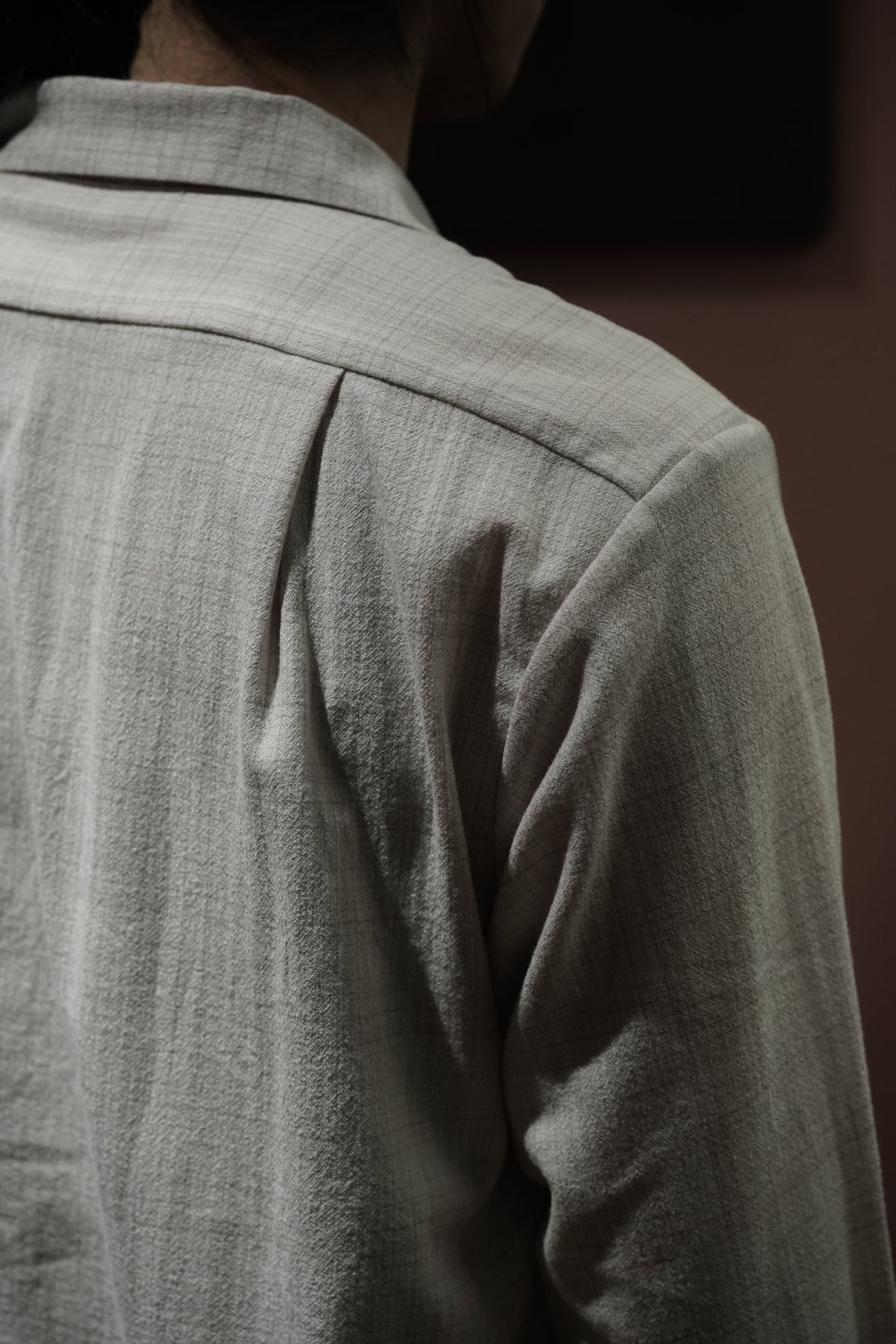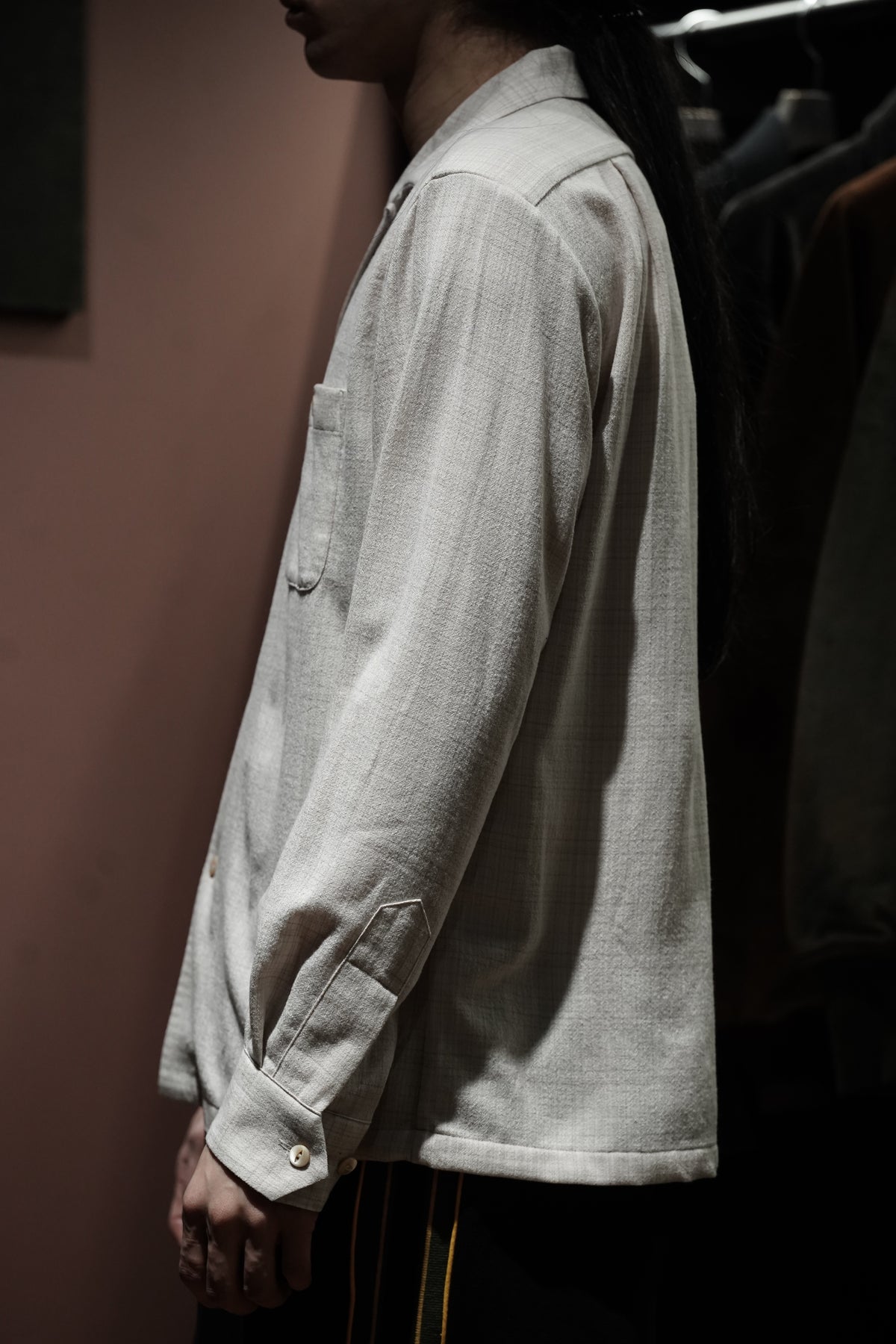 1950년대 미국산 이탈리안 칼라 셔츠를 기반으로 한 디자인입니다.제2차 세계대전 이후 경제 호황기에 휴양지에서 캐주얼 셔츠로 인기를 끌었던 셔츠로, 곡선 형태를 갖고 있다.개구부가 넓은 것이 특징입니다. 당시에는 리조트에서 티셔츠를 입는 문화가 전무했기 때문에 여유로운 룩에 딱 맞는 액세서리였습니다.아이템으로 여겨졌습니다.원단은 캐시미어처럼 얇은 SUPER180 울사를 사용하여 독창적인 가스리풍 패턴을 만들어냅니다.섬세한 질감을 살리기 위해 봉제를 프렌치 솔기로 변경하고, 가볍고 우아한 느낌을 줄 수 있도록 새롭게 디자인하였습니다.이다.