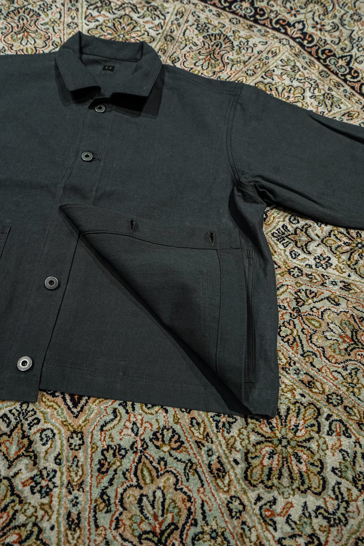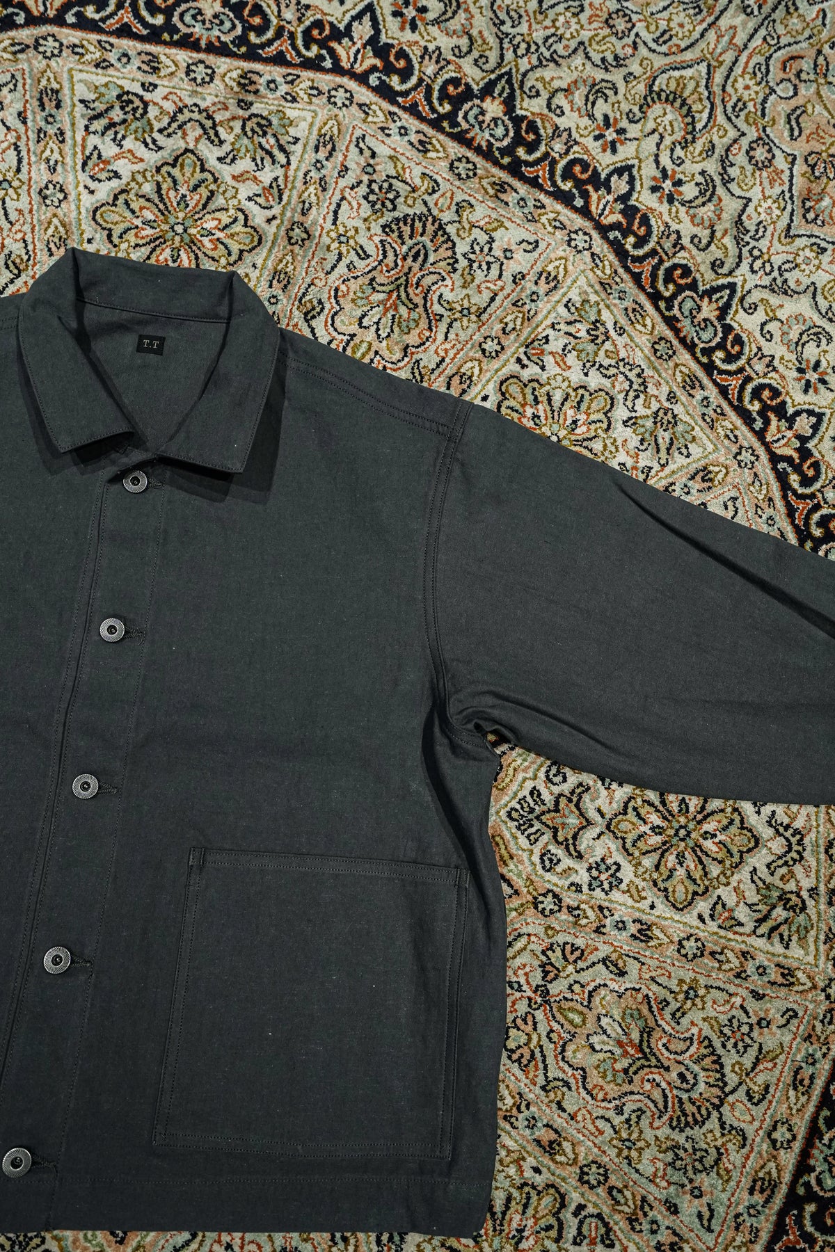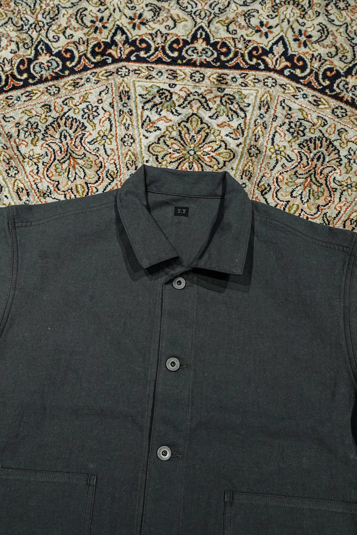 1910년경의 미국제 커버올을 바탕으로, T.T의 커버 올 재킷은 태어났다. 대량생산이진행된 1920년대, 직선적인 봉제나 평면적인 패턴 등, 중노동에 견디기 위한 기능성이 중시되어,옷보다는 ‘도구’로 존재했다. 이 재킷도 당시의 사양을 계승하면서, 겨드랑이마리를 개선하기 위해 어깨 경사를 가하는 등 재구축을 실시하고 있다.원단에는 면과 대마를 고밀도로 짠 백 웨폰을 사용. 위사에 도장실을 도입하여헬프 특유의 청량감을 가지면서, 경사에는 면의 공방사를 사용하는 것으로, 유연하고 표정 풍부한 바람맞게 완성하고 있다.특주의 각인들이 버튼과 백 파트에는 철 소재를 채용.훈한 것 같은 도금 가공을 한 것을 사용하여 시간의 경과를 표현했다.