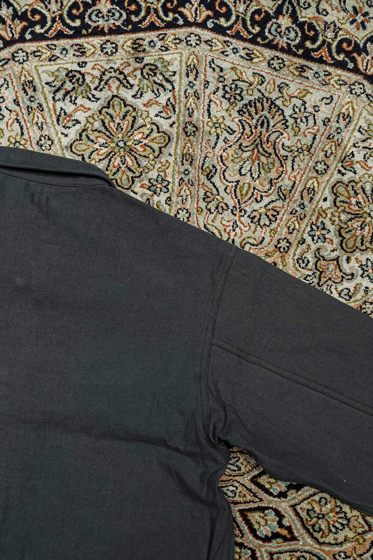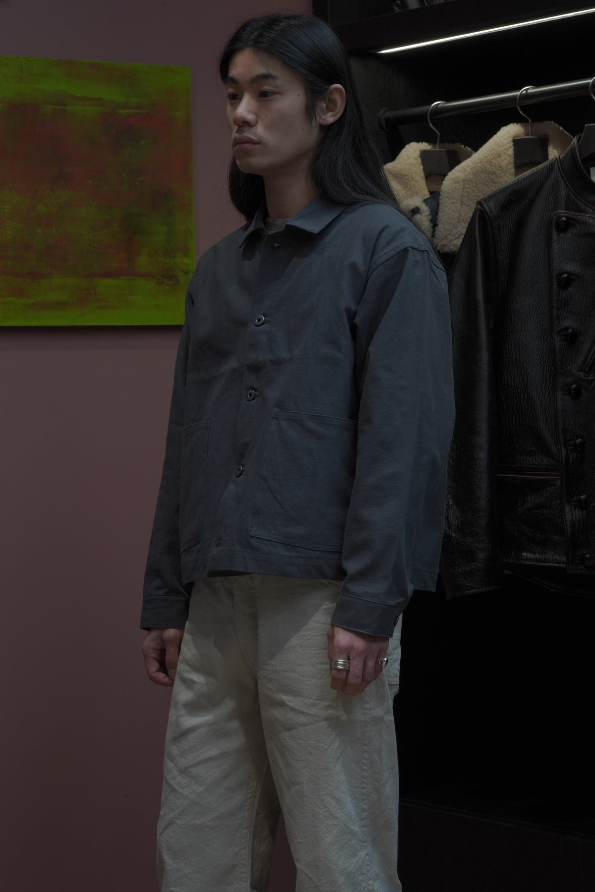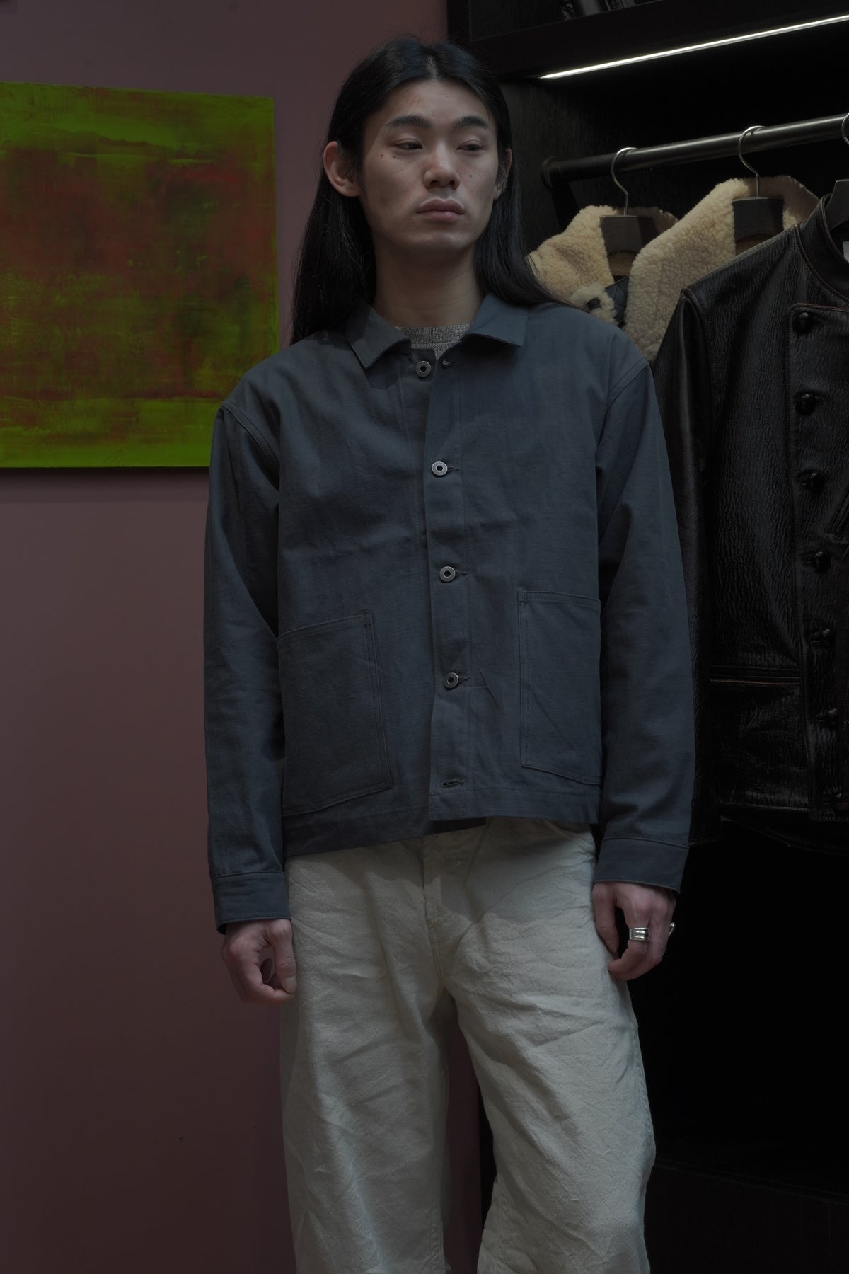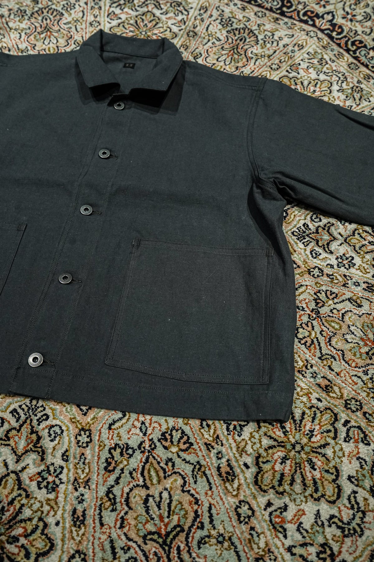 1910년경의 미국제 커버올을 바탕으로, T.T의 커버 올 재킷은 태어났다. 대량생산이진행된 1920년대, 직선적인 봉제나 평면적인 패턴 등, 중노동에 견디기 위한 기능성이 중시되어,옷보다는 ‘도구’로 존재했다. 이 재킷도 당시의 사양을 계승하면서, 겨드랑이마리를 개선하기 위해 어깨 경사를 가하는 등 재구축을 실시하고 있다.원단에는 면과 대마를 고밀도로 짠 백 웨폰을 사용. 위사에 도장실을 도입하여헬프 특유의 청량감을 가지면서, 경사에는 면의 공방사를 사용하는 것으로, 유연하고 표정 풍부한 바람맞게 완성하고 있다.특주의 각인들이 버튼과 백 파트에는 철 소재를 채용.훈한 것 같은 도금 가공을 한 것을 사용하여 시간의 경과를 표현했다.