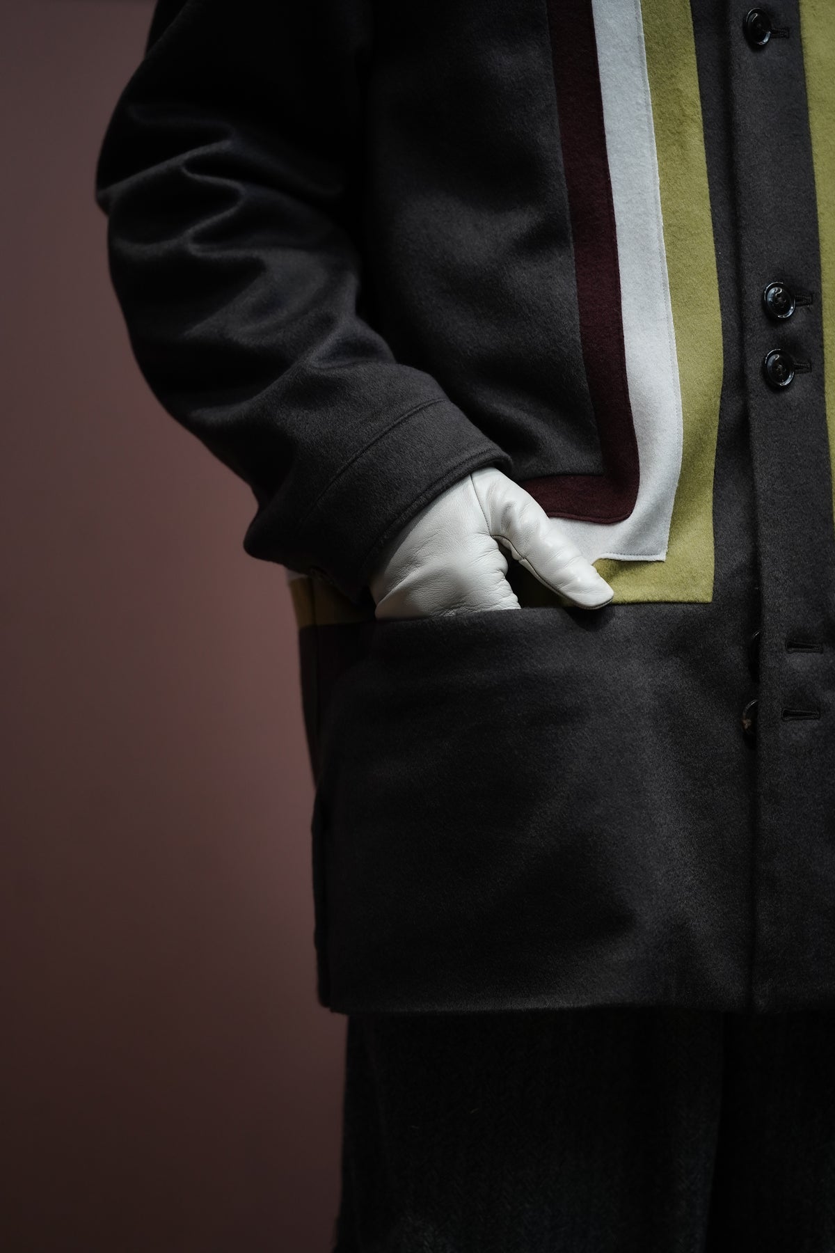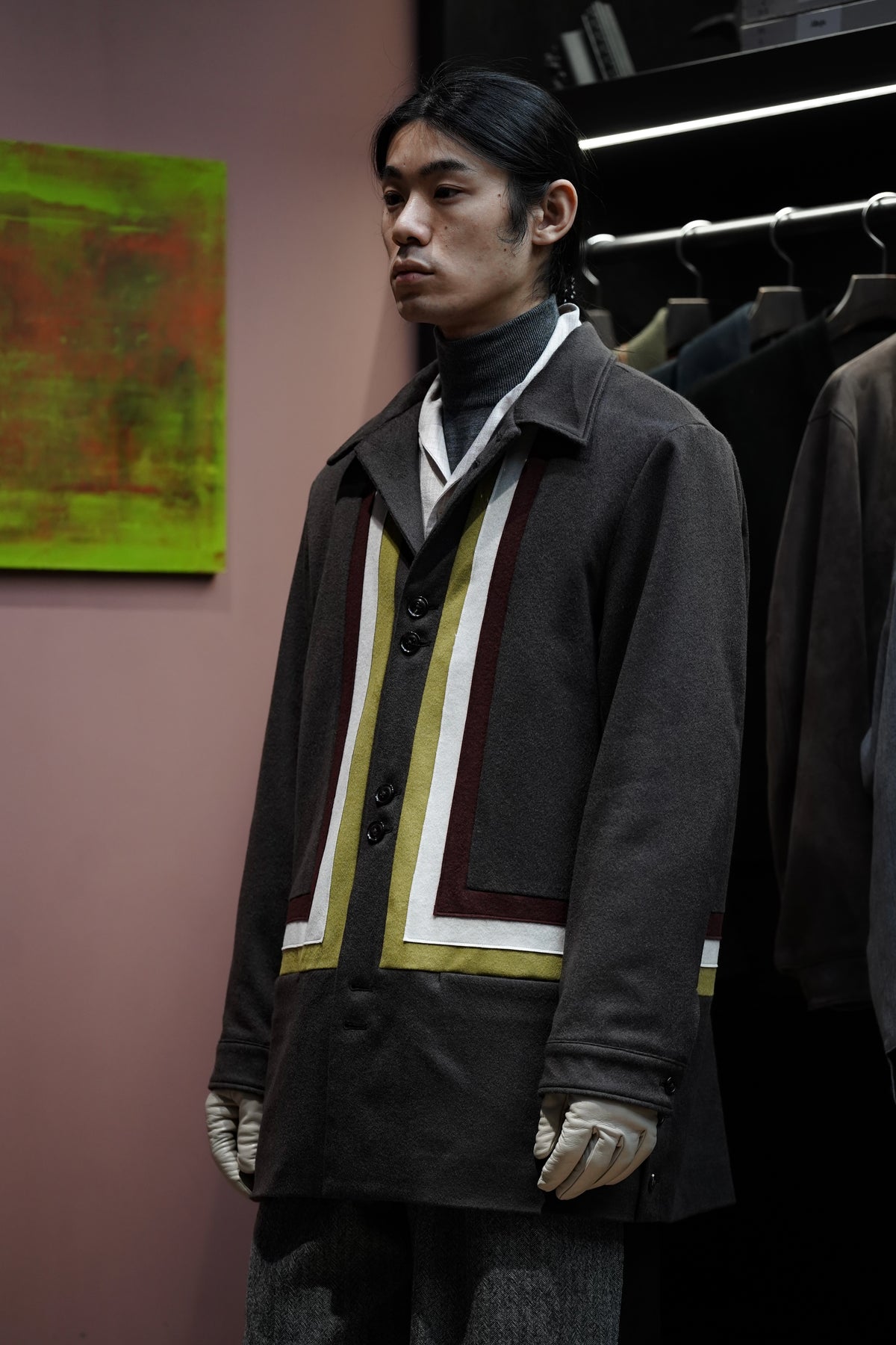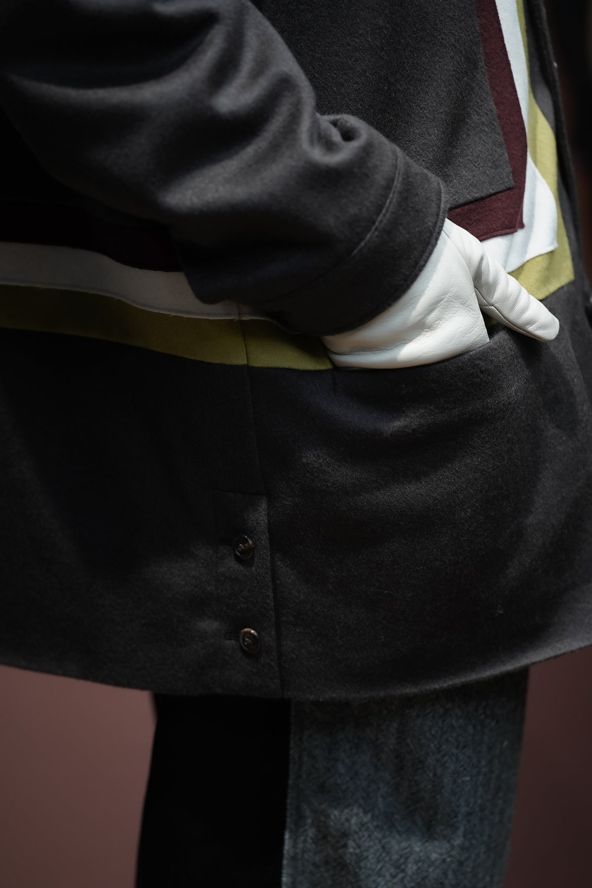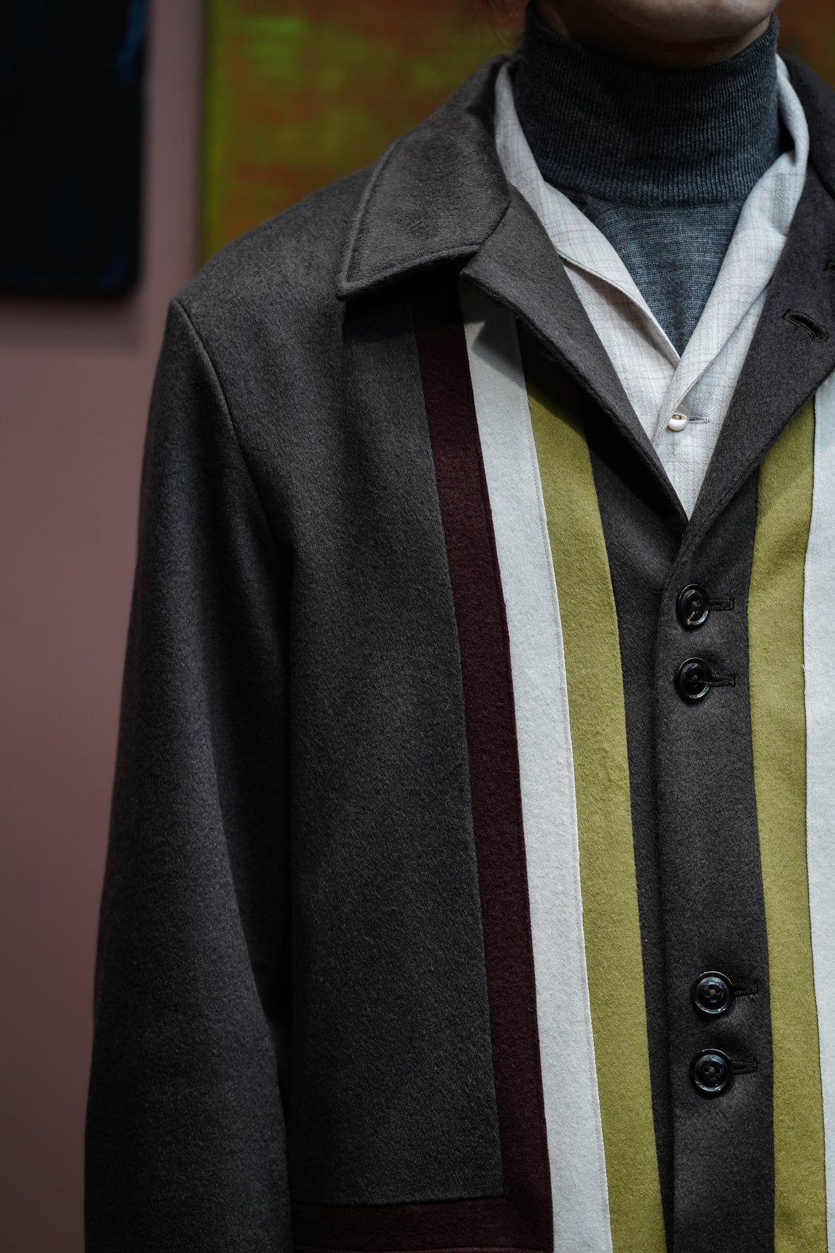 STEAFの1stコレクションで登場し発売と同時に完売したGRADATION COATを、再構築した特別なアイテム。ベースの生地にはイタリア・プラトー産地にあるメーカー「MTR」のPURE CASHMERE 100%の大変希少な素材をビーバー仕上げし使用し、配色部分にはSTEAFの25AWのテーマである「Himno Andino」からイメージした配色のウールをセレクト。身頃裏地は贅沢にもSILK 100%の裏地で仕立て、袖裏は袖通りの引っかかりを考慮し最高級ベンベルグを使用して仕立てた。そしてパターンは発売から4年経ったGRADATION COATをベースに今着たいと思うシルエットを求めてSTEAFらしく立体的に引き直し上質な着心地を追求した。