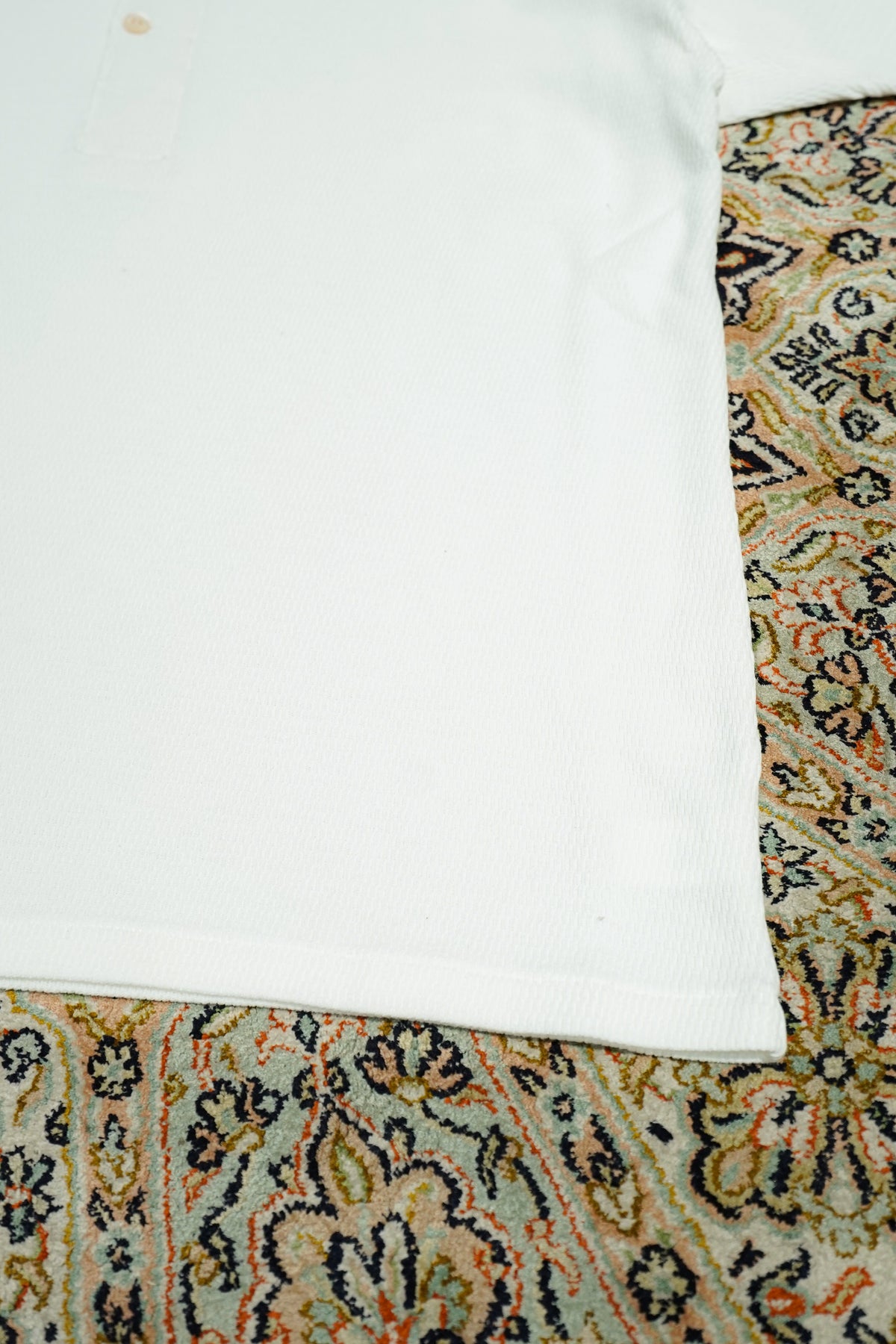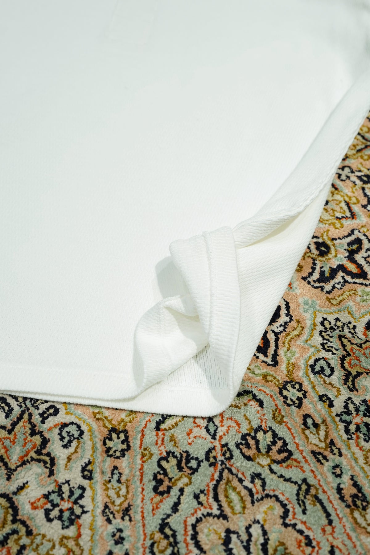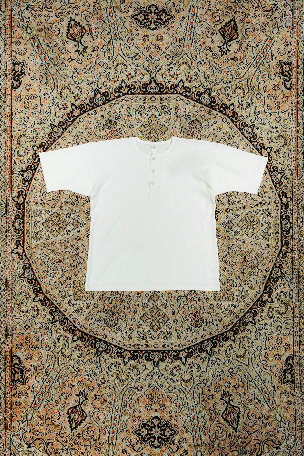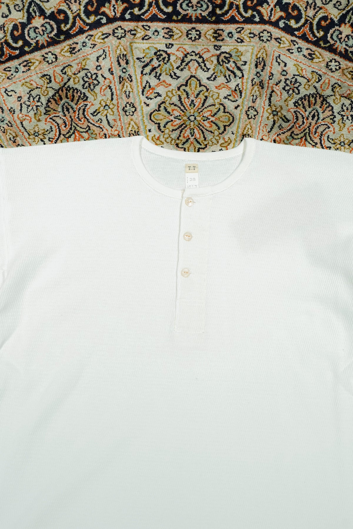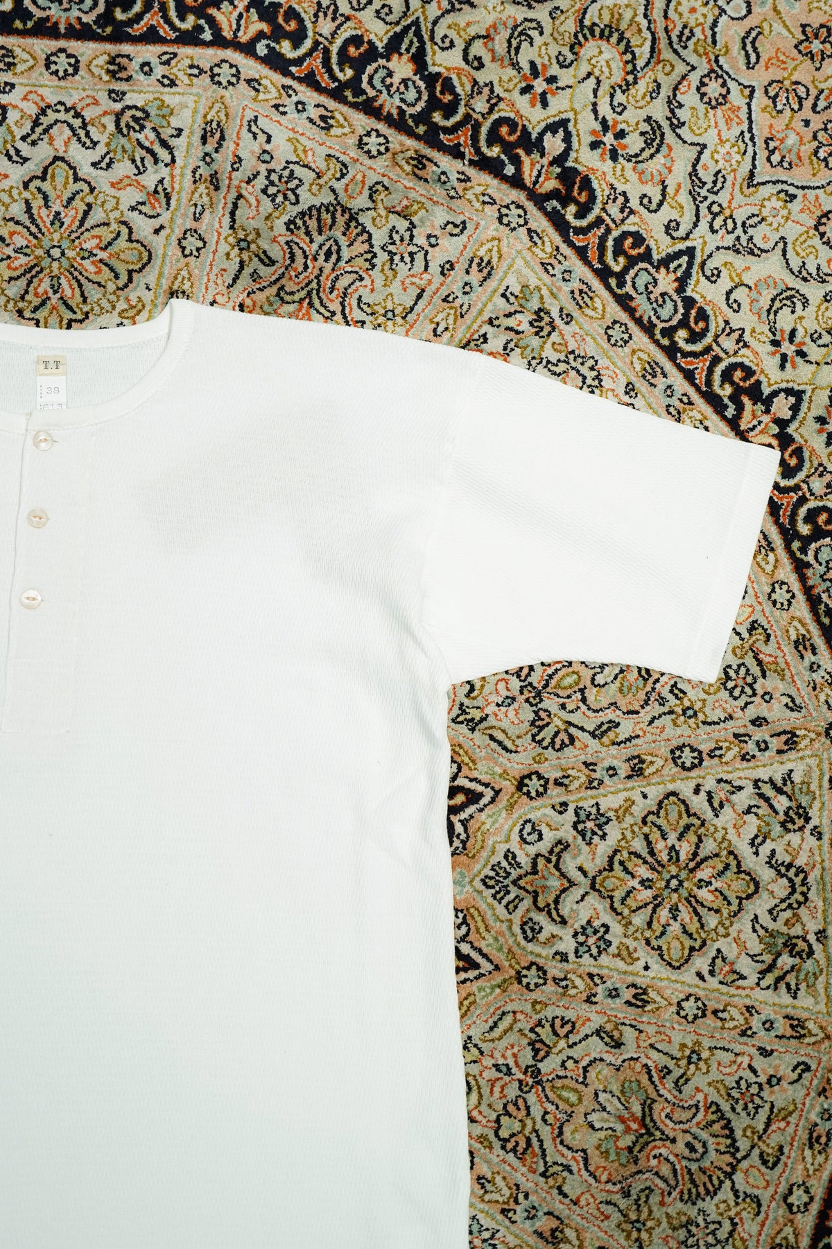 NYで見つけた1930年代のヘビーウェイトコットンヘンリーネックシャツは、従来の肌着縫製仕様とは異なる貴重な一品であった。肩に接ぎがなく、袖は直線的に付けられ、袖下には運動量を考慮したマチが設けられている。一方、脇には接ぎがあり、ヘビーウェイト生地であることから、丸胴編みが難しかったと推測される。生地の特性に合わせて工夫された裁断は、結果的にデザインとしても美しさを持ち合わせており、この完成度の高いカッティングを研究し、再現した。使用した生地は、オーガニックコットンの空紡糸によるサーマル。オーガニックコットンの滑らかさと、空紡糸特有のドライな質感を併せ持ち、快適な着心地を実現している。