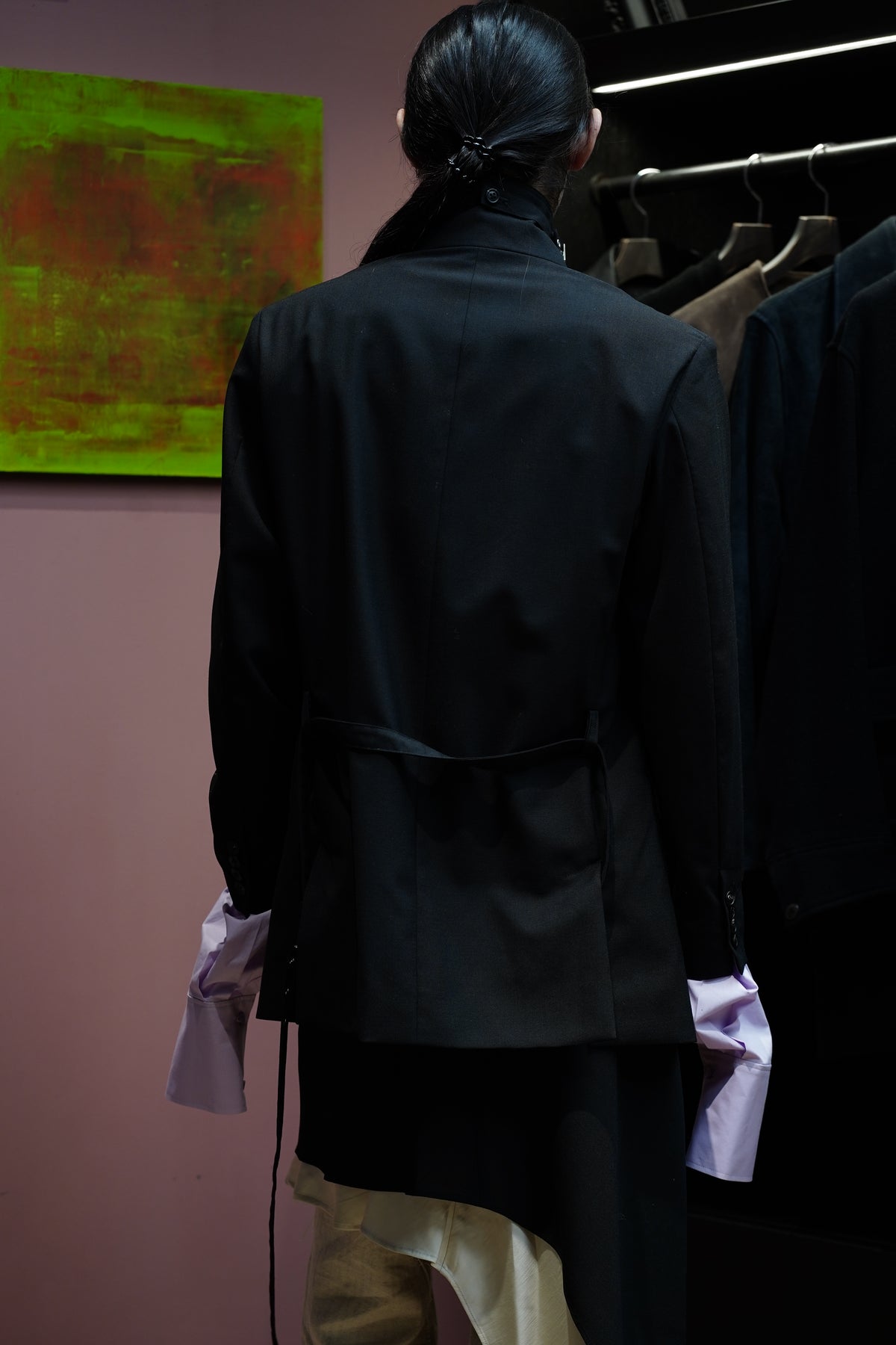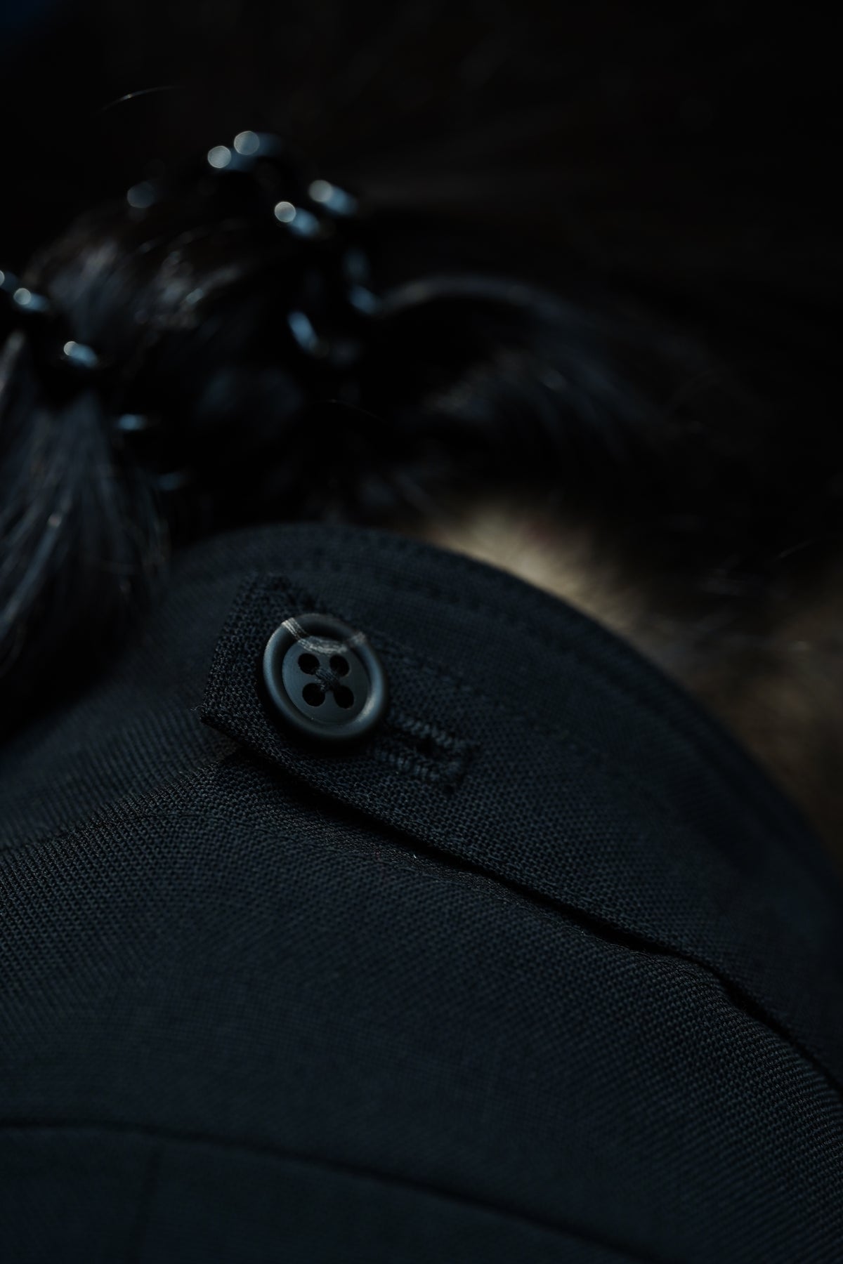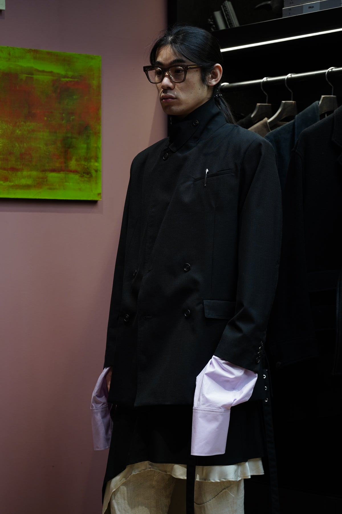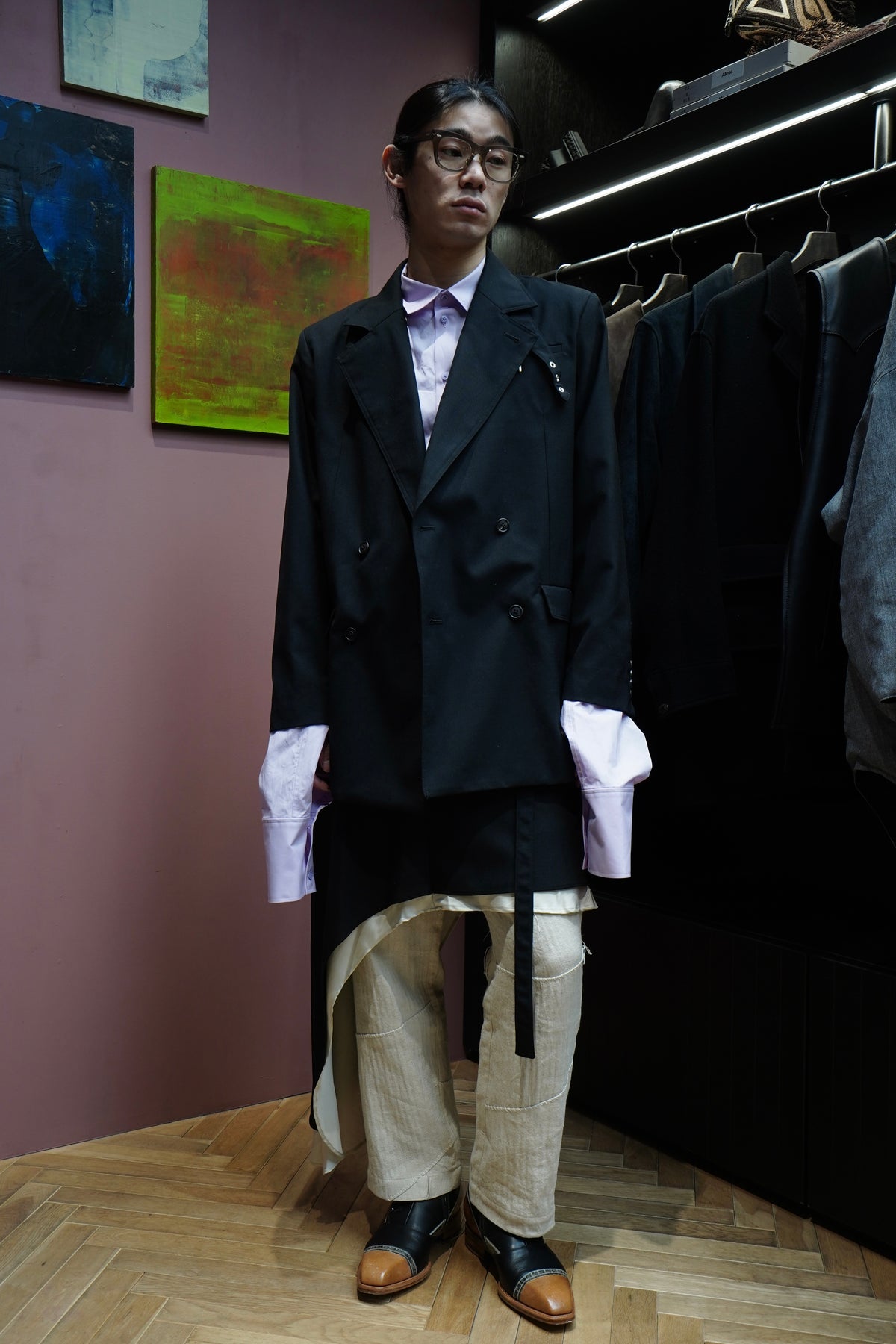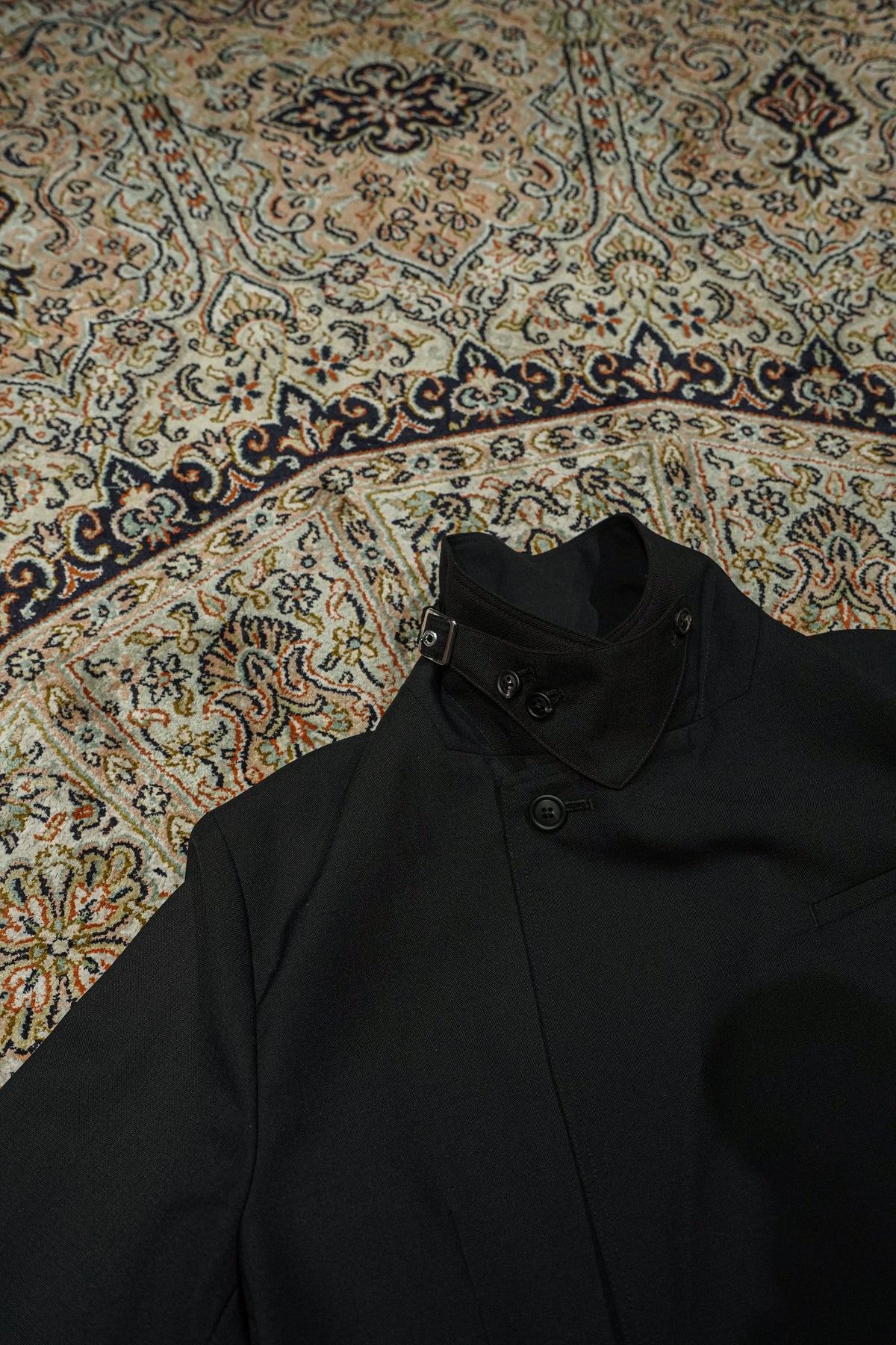 チンタブ付きのダブルブレステッドジャケット。ハトメのついたベルトやチンタブのデザインは、元々ワークシャツやミリタリーコートに使用されてきました。デザインをする際に相反するものを組み合わせることを重視し、上質なウールのテーラードジャケットにワークウェア要素をディテールで取り込み、デザインしている。ニッケルカラーのハトメを使用したのはインスピレーションでもあるセラのメタリックな素材感を表現したく、あえてシルバーカラーのハトメを使用しています。ファブリックは尾州で製作されたウールを使用しています。3/60の糸を700回撚糸された張りコシがありつつも軽く仕上がっている平織りのウール生地です。