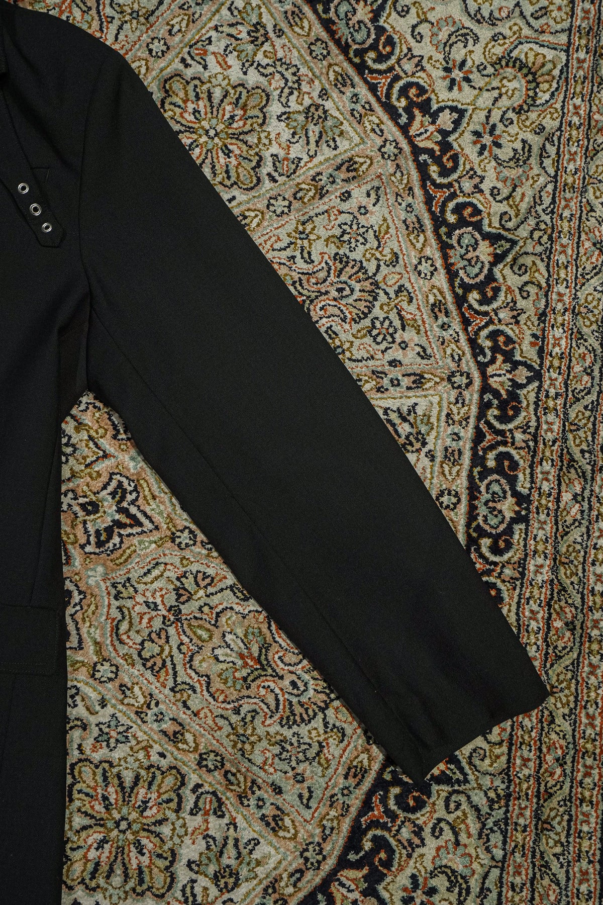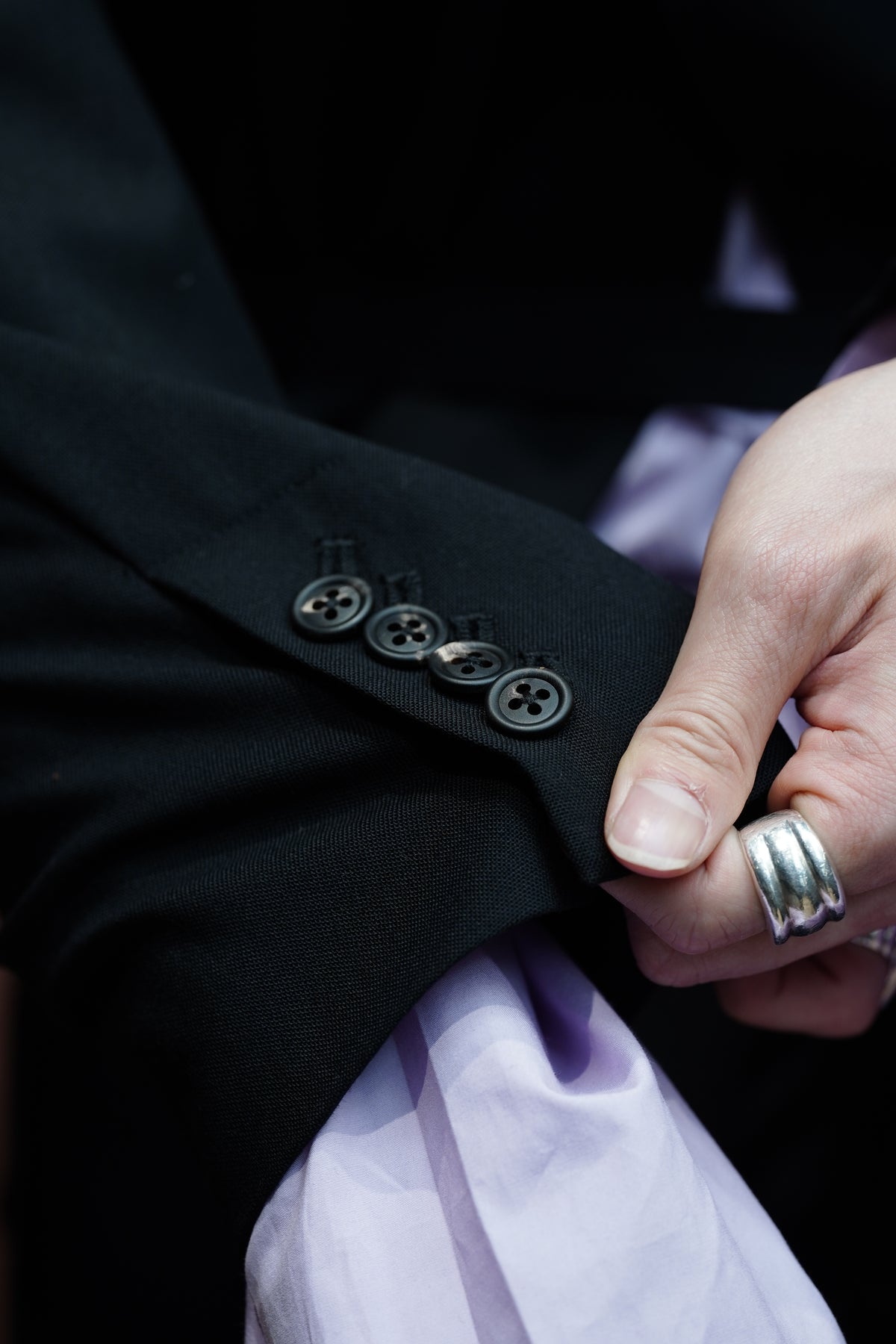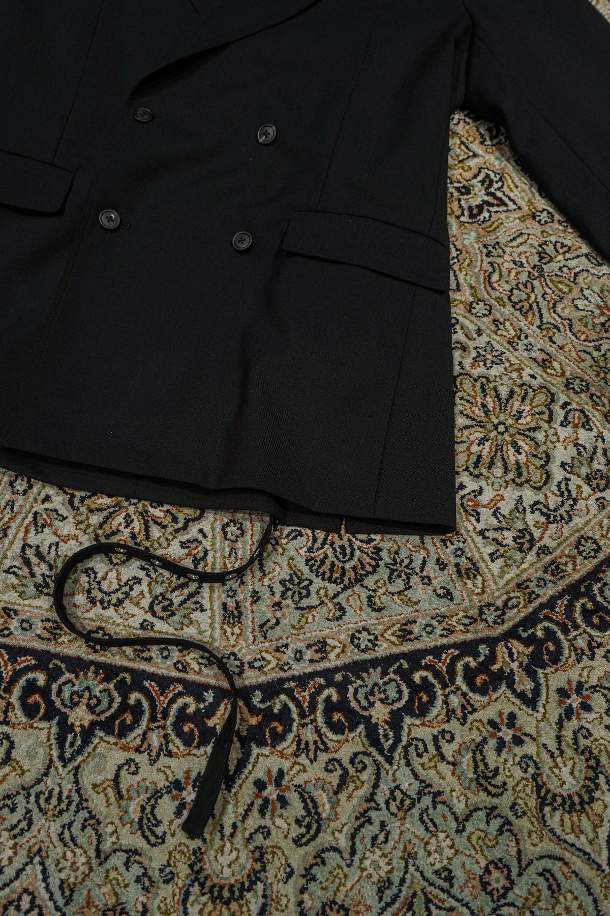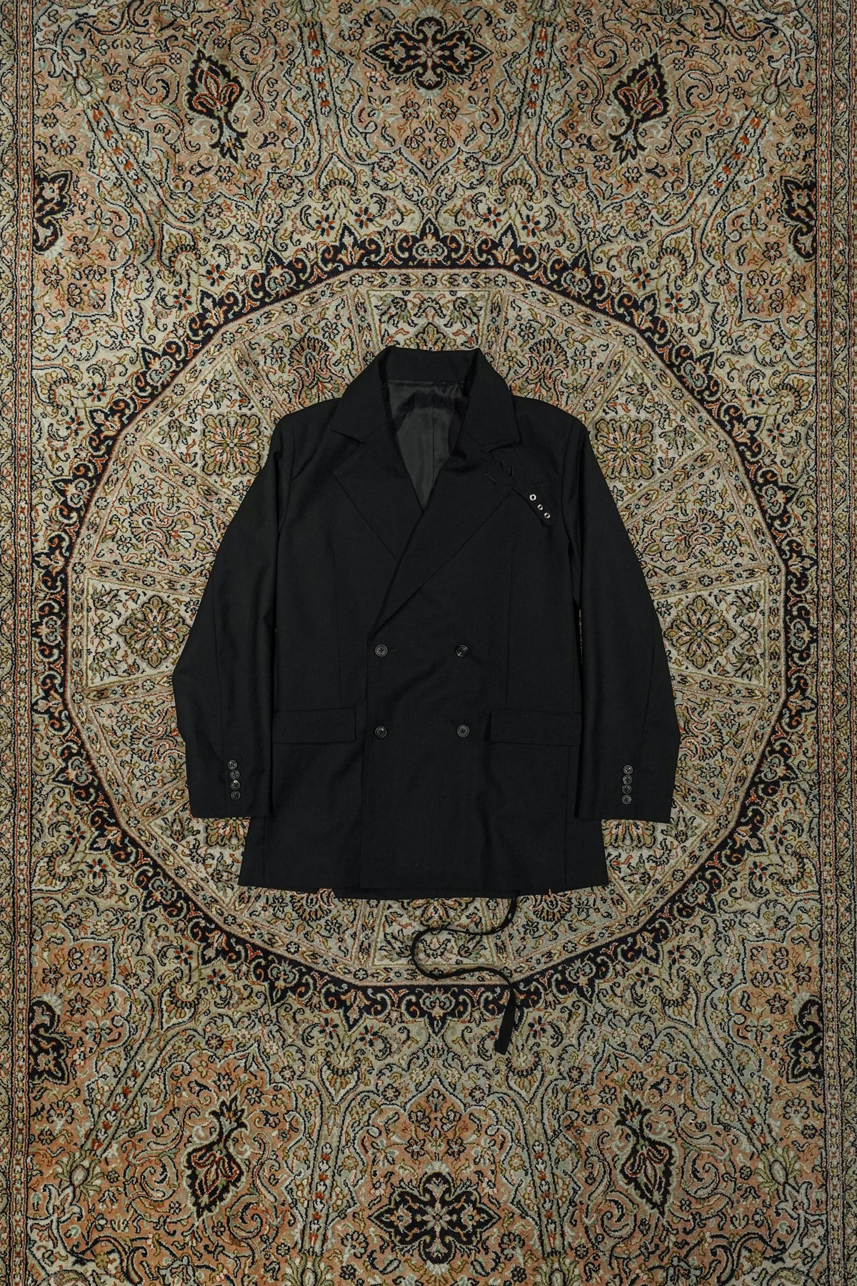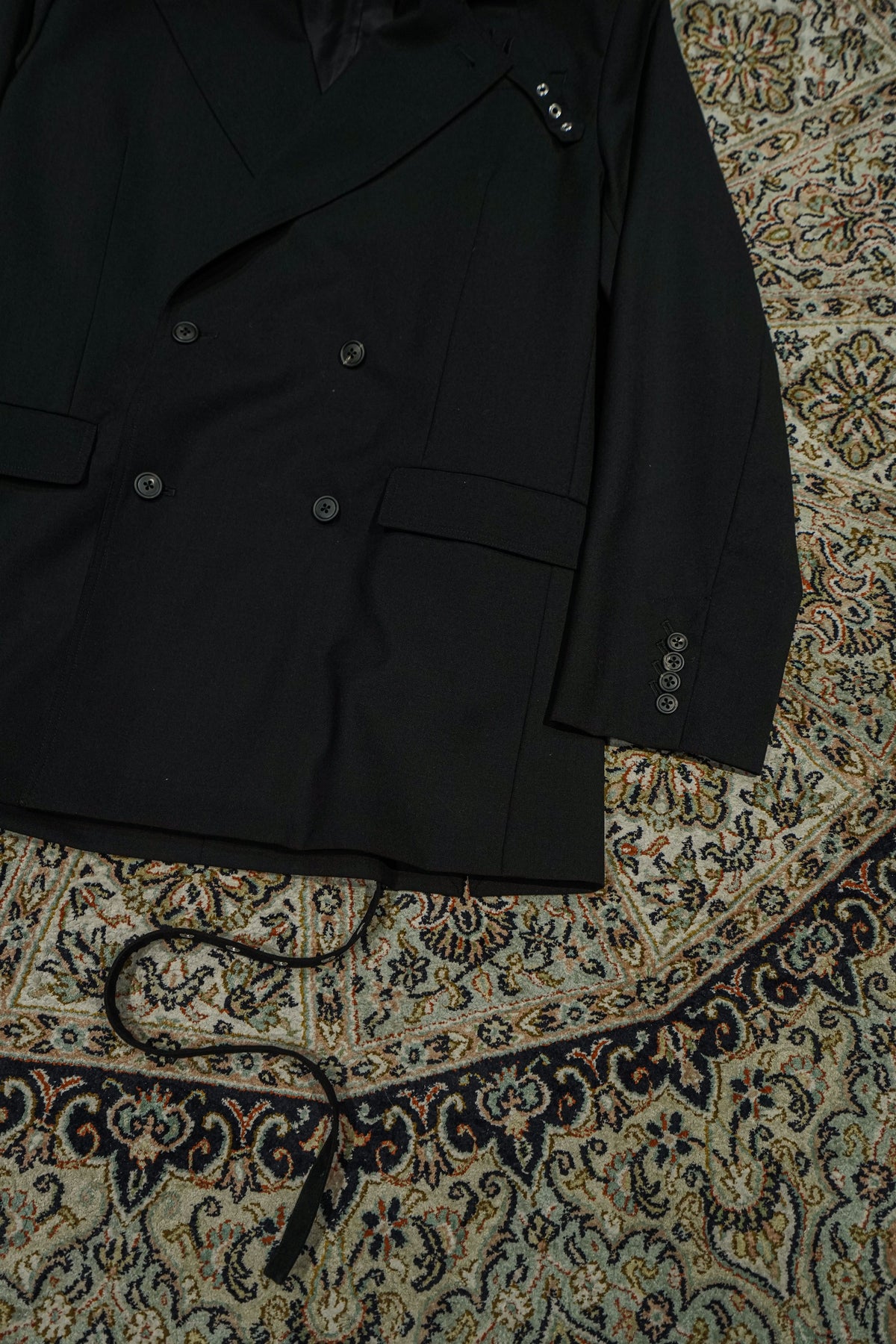 チンタブ付きのダブルブレステッドジャケット。ハトメのついたベルトやチンタブのデザインは、元々ワークシャツやミリタリーコートに使用されてきました。デザインをする際に相反するものを組み合わせることを重視し、上質なウールのテーラードジャケットにワークウェア要素をディテールで取り込み、デザインしている。ニッケルカラーのハトメを使用したのはインスピレーションでもあるセラのメタリックな素材感を表現したく、あえてシルバーカラーのハトメを使用しています。ファブリックは尾州で製作されたウールを使用しています。3/60の糸を700回撚糸された張りコシがありつつも軽く仕上がっている平織りのウール生地です。