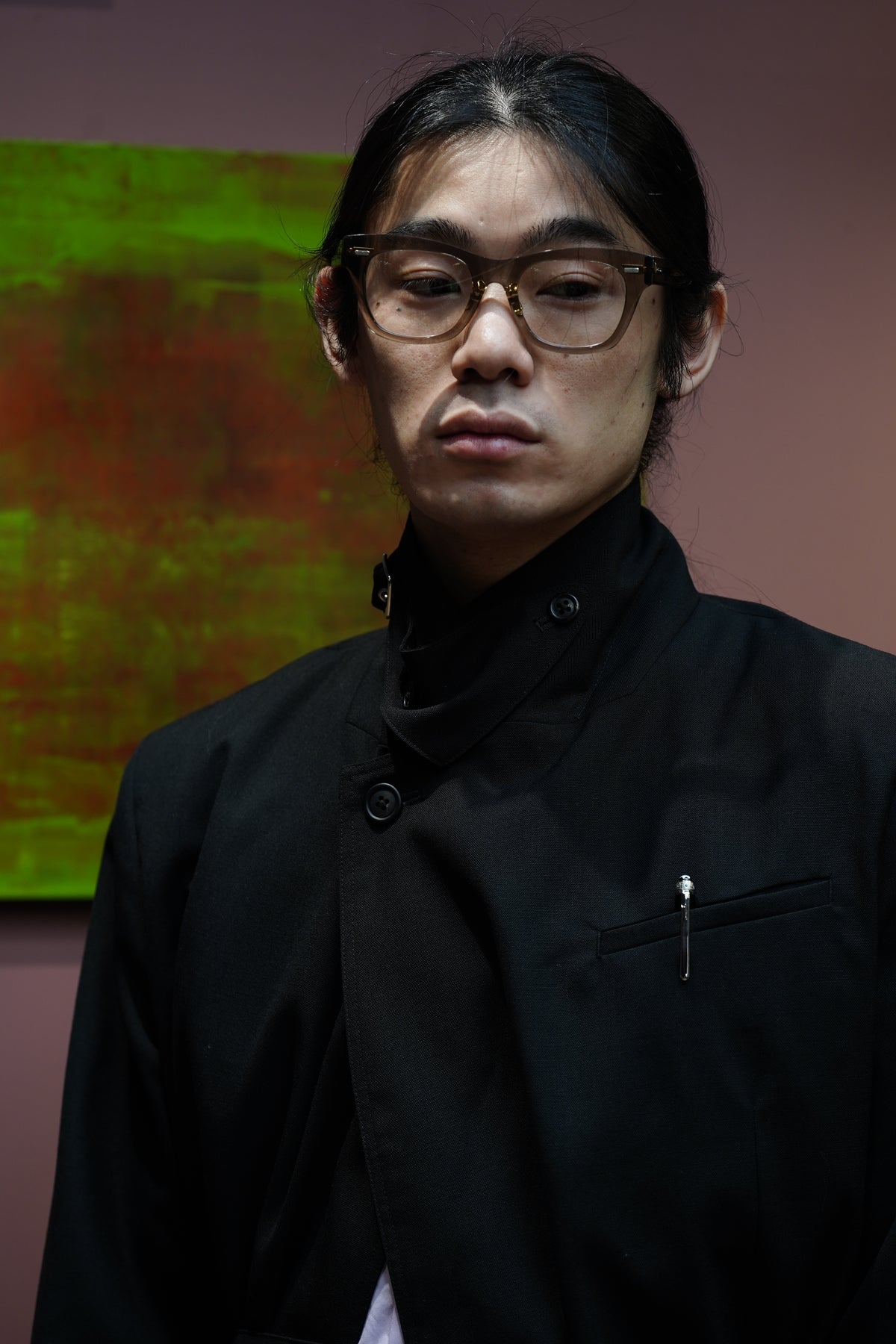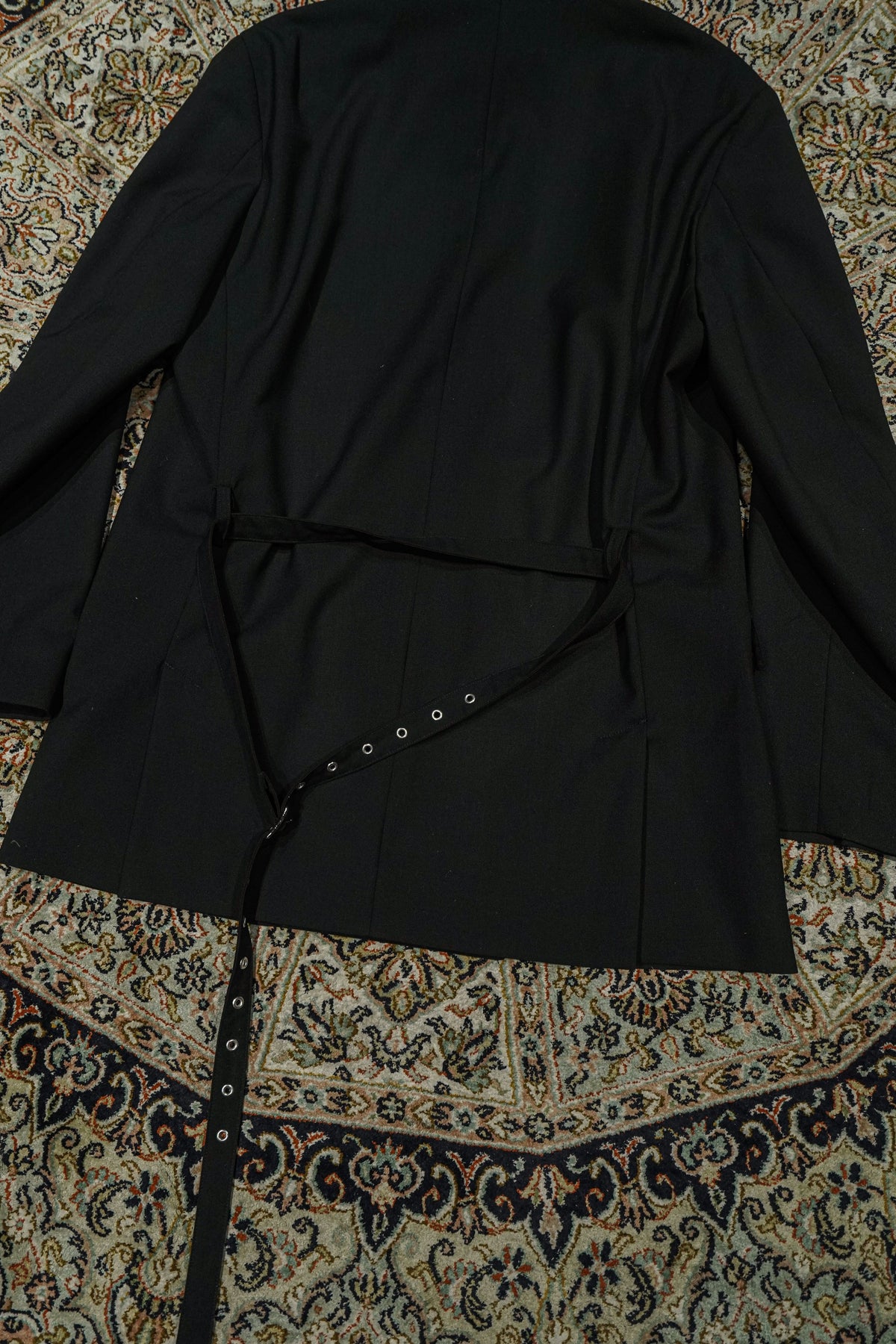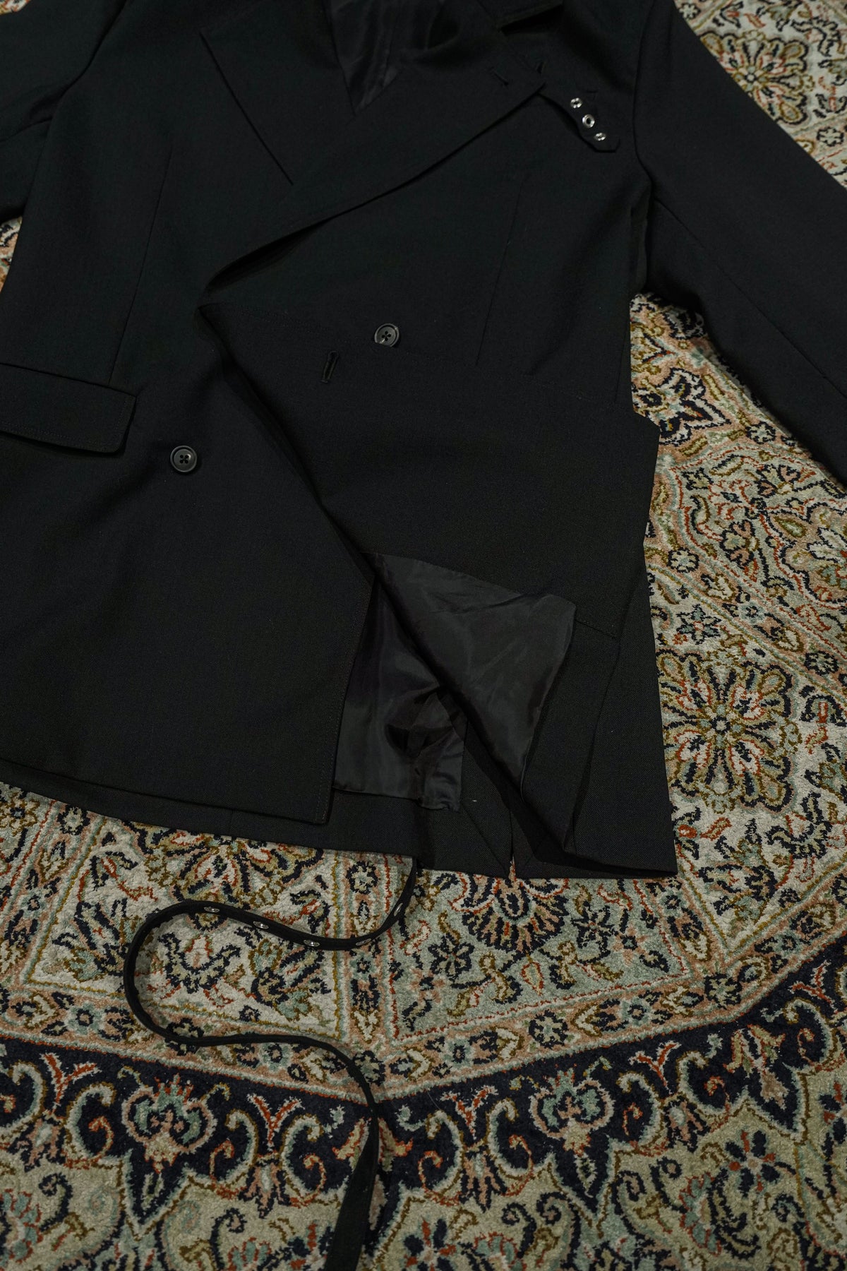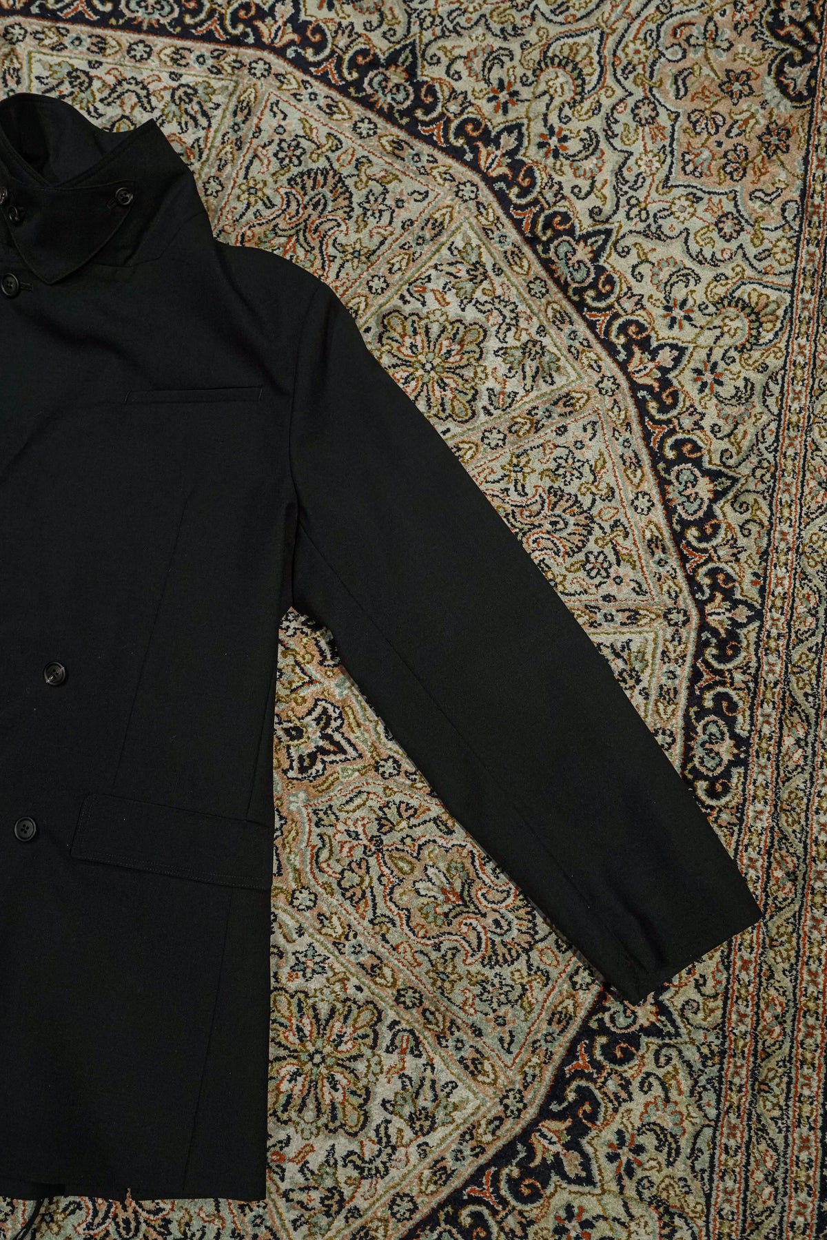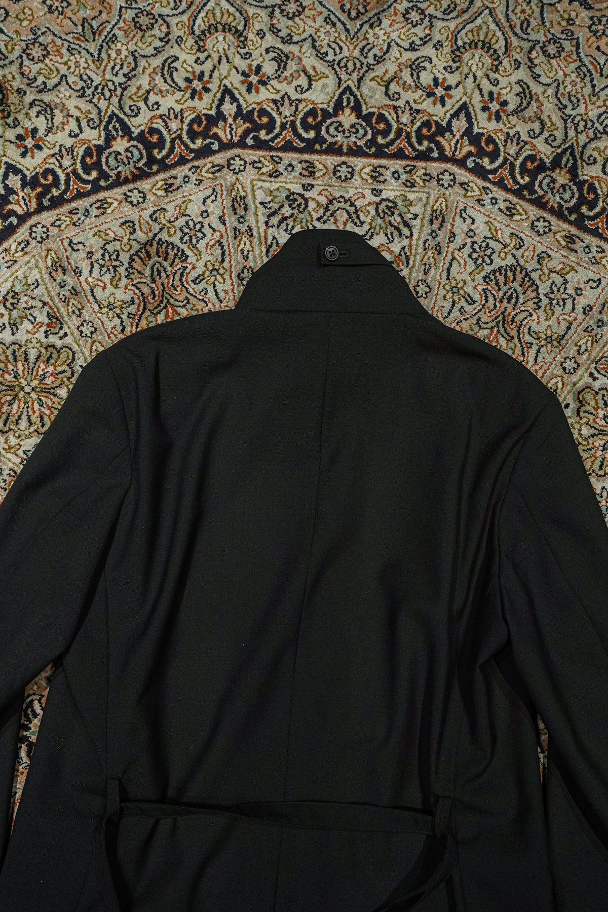 チンタブ付きのダブルブレステッドジャケット。ハトメのついたベルトやチンタブのデザインは、元々ワークシャツやミリタリーコートに使用されてきました。デザインをする際に相反するものを組み合わせることを重視し、上質なウールのテーラードジャケットにワークウェア要素をディテールで取り込み、デザインしている。ニッケルカラーのハトメを使用したのはインスピレーションでもあるセラのメタリックな素材感を表現したく、あえてシルバーカラーのハトメを使用しています。ファブリックは尾州で製作されたウールを使用しています。3/60の糸を700回撚糸された張りコシがありつつも軽く仕上がっている平織りのウール生地です。