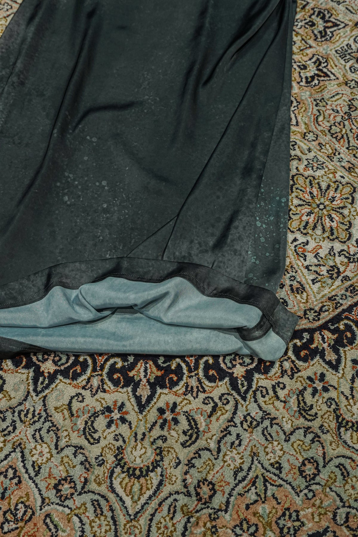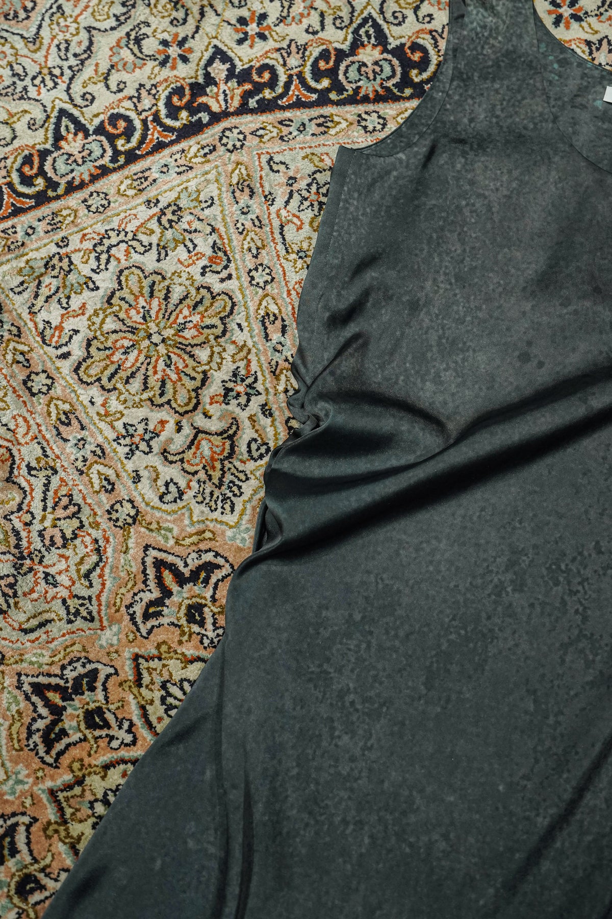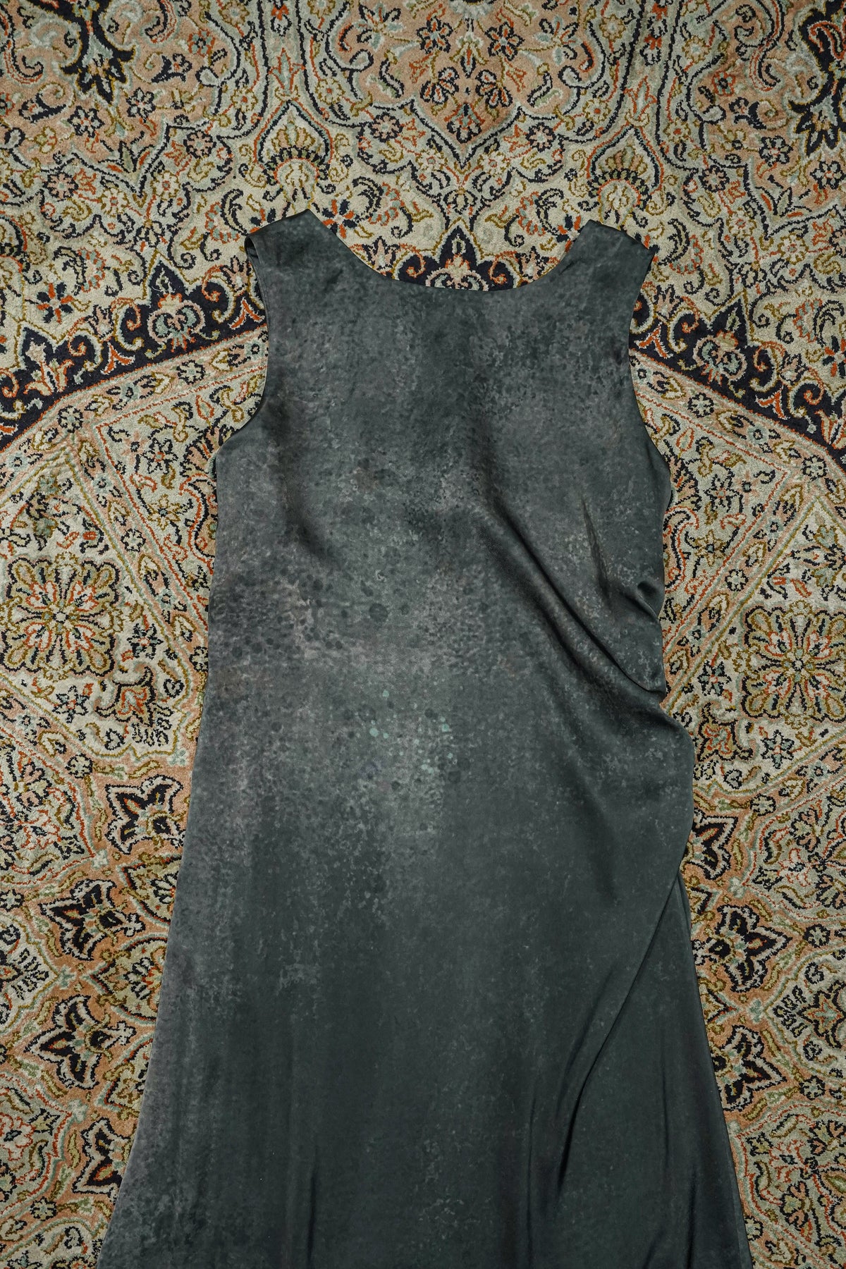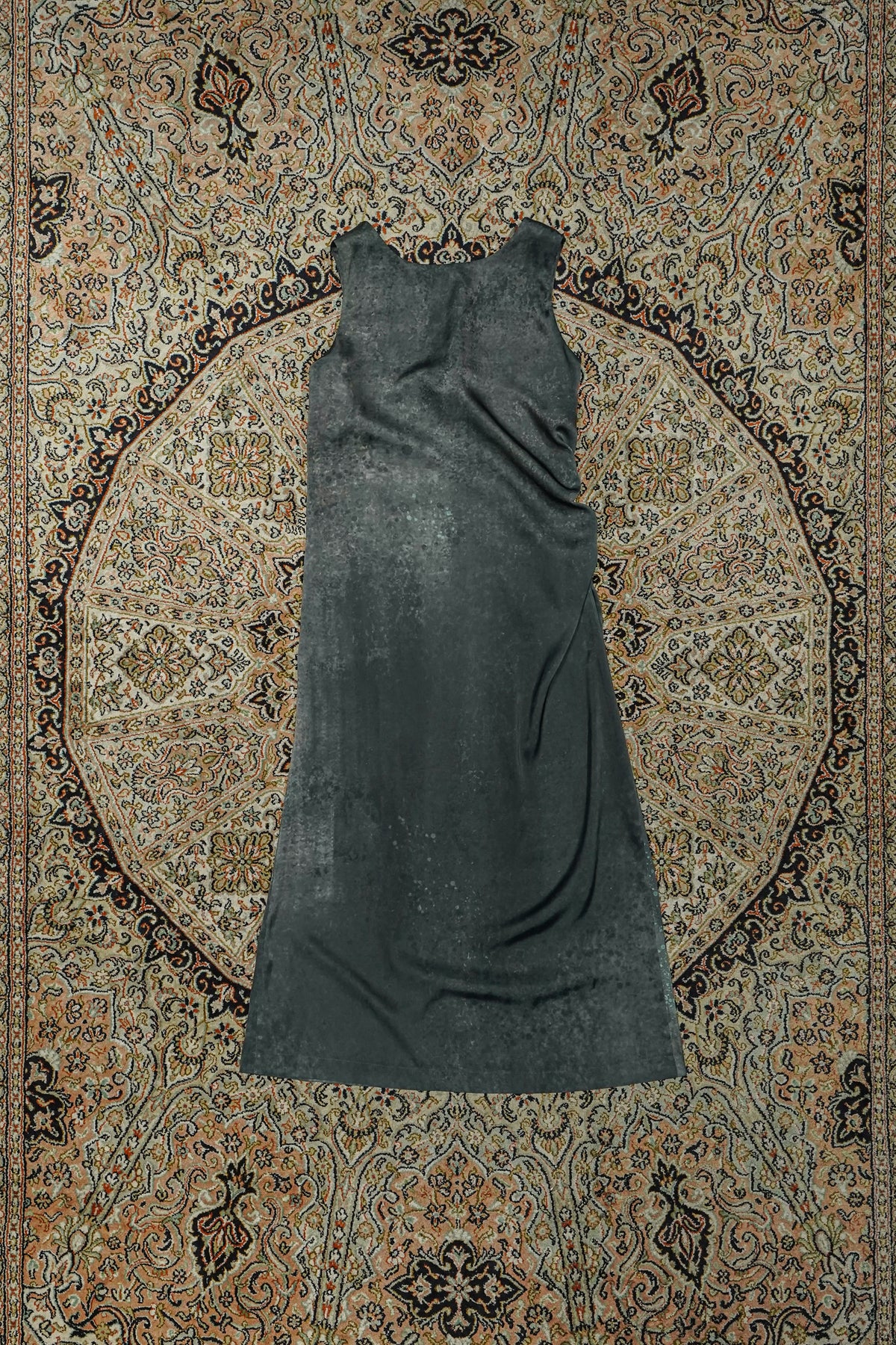 パターン上でアシンメトリーにカーブさせたカーブタンクドレス。このカーブタンクドレスは右見頃にドレープの分量入れてカーブさせており、平置きした時にそのカーブがわかるようになっています。再度の縫い代にゴムを叩いてフレア分量を寄せており、着用すると斜めにドレープが出るようデザインされています。ファブリックは華やかな光沢感とソフトな風合いを持つ素材に、リチャードセラの使用している鉛のテクスチャをイメージし今シーズンのカラースタディーとして描いた絵を昇華転写プリントしています。程良い反発感を持たせることで美しいシルエットを生み出します。