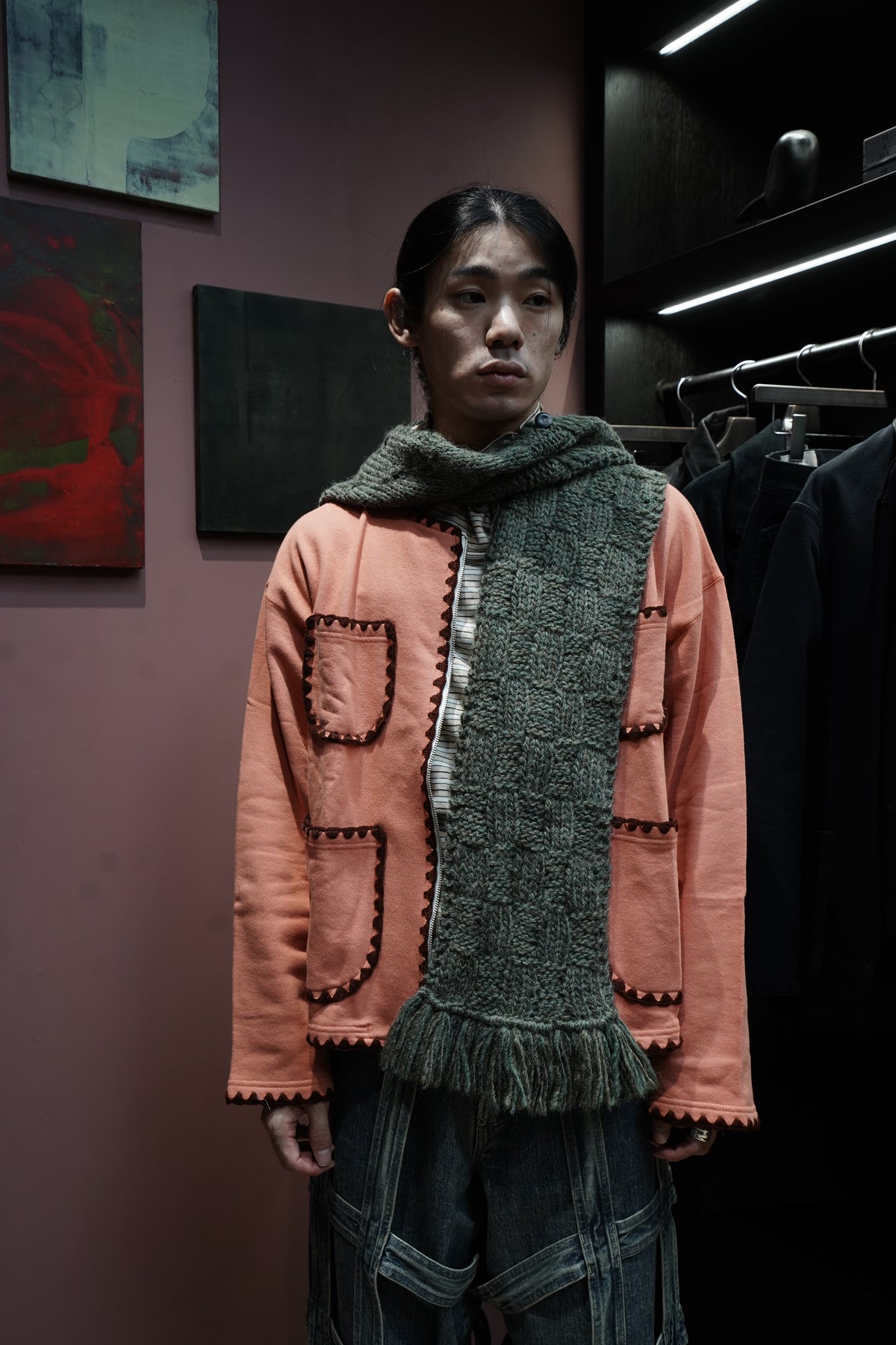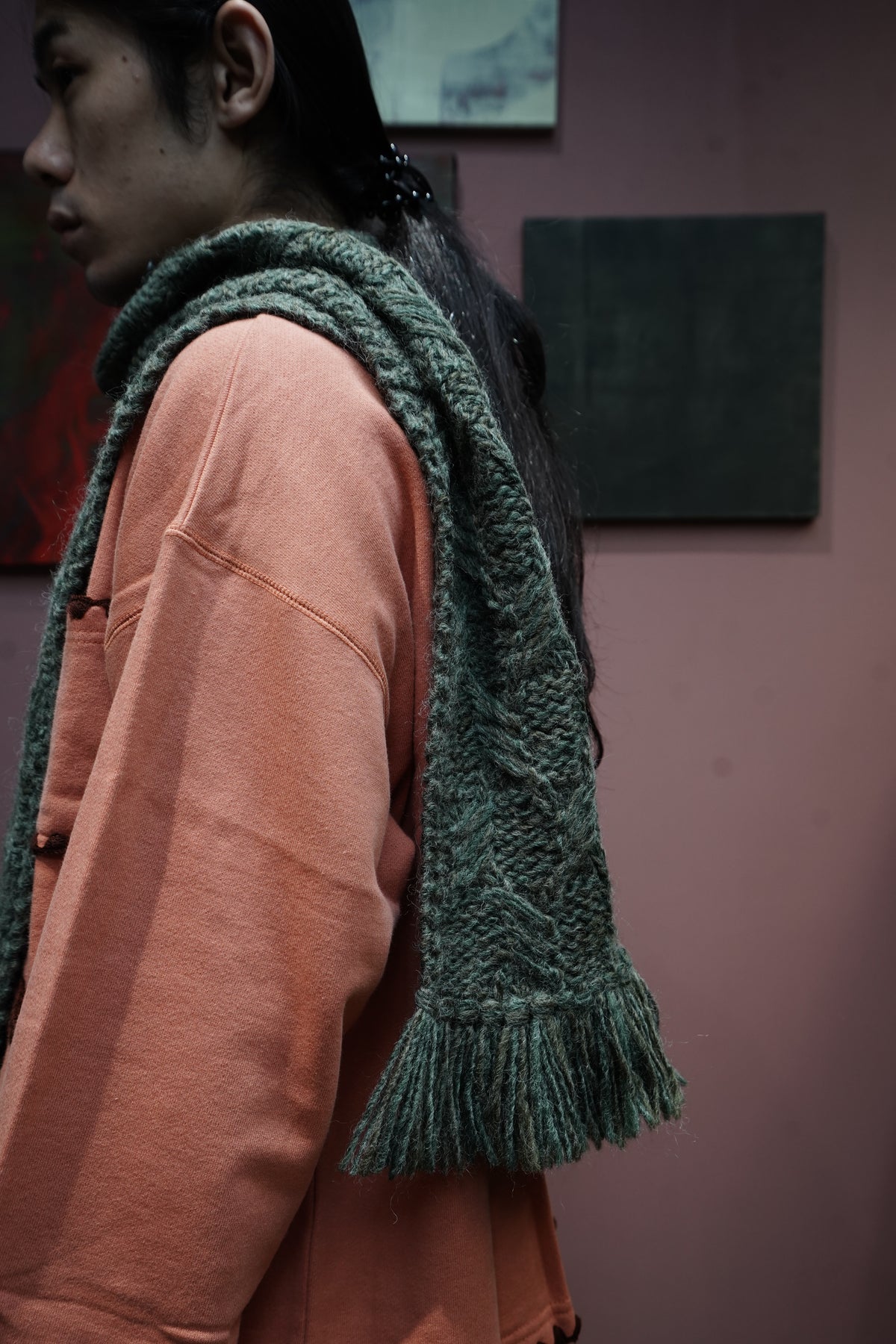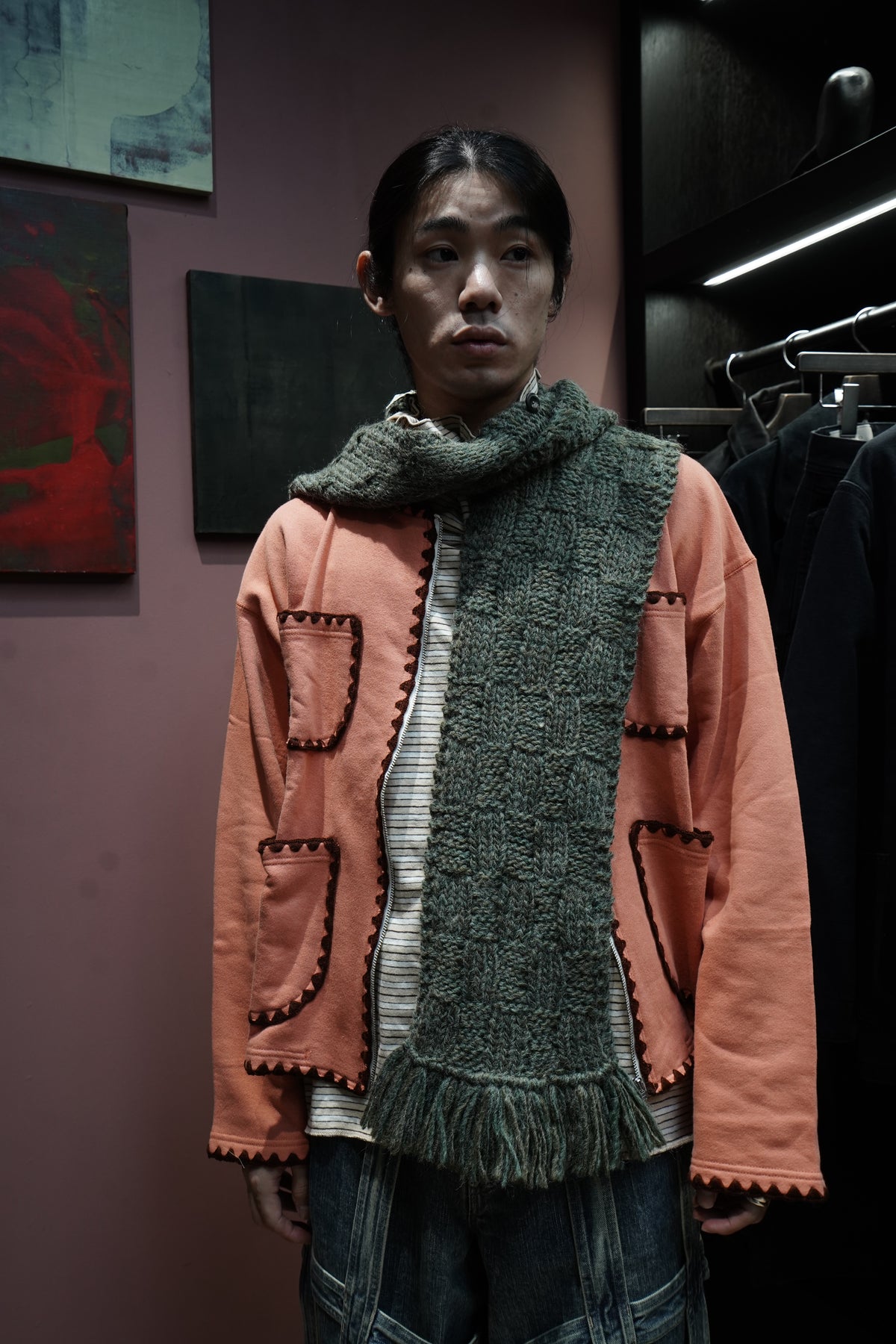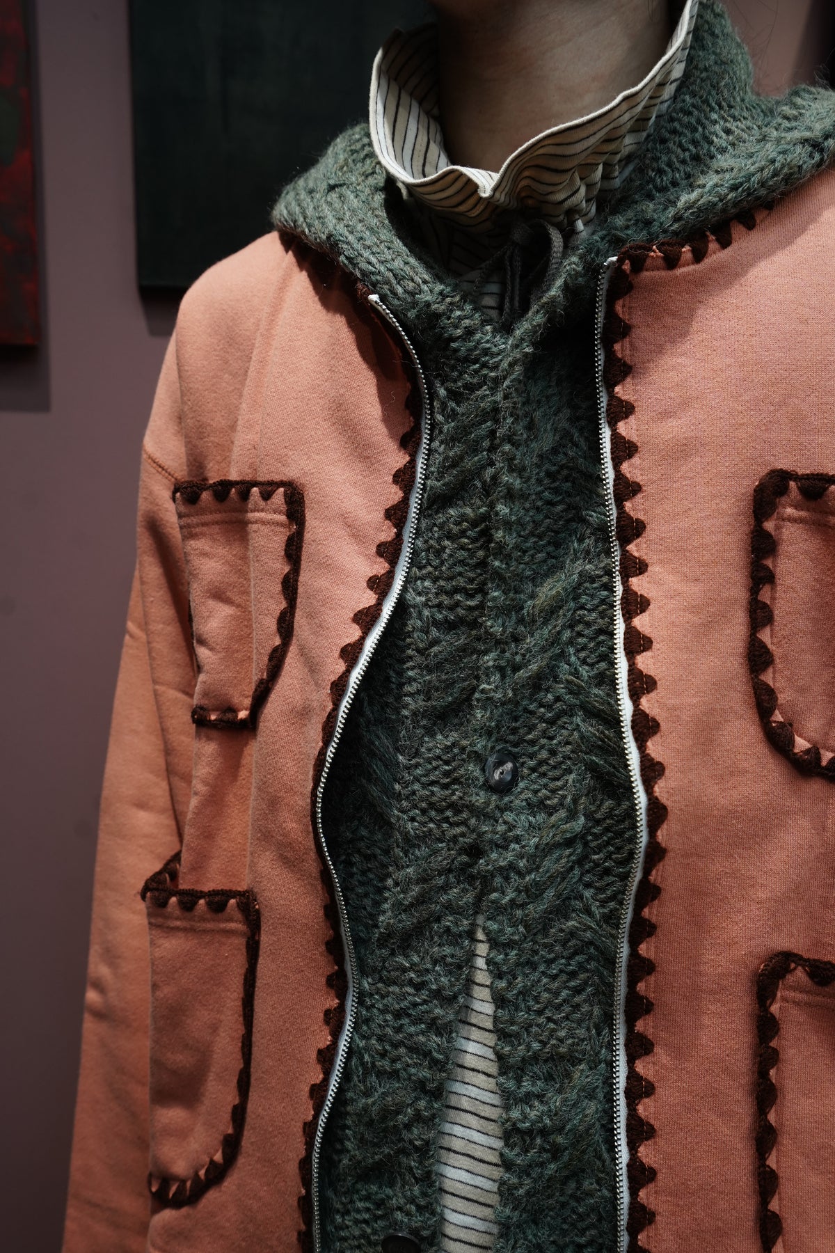 凸显人的手臂的全手工的连帽 围巾 以本季主题为印象的图案是帽子和围巾每个部分都有不同的图案。 材料是秘鲁产的羊毛使用丙烯酸线阶段,使皮肤接触时不会有刺痛感 用加工蓬松的优质的质感是特征。 前面有STEAF上面有纽扣,扣上纽扣,穿在外套下面连帽针织衫看起来像层叠的设计。