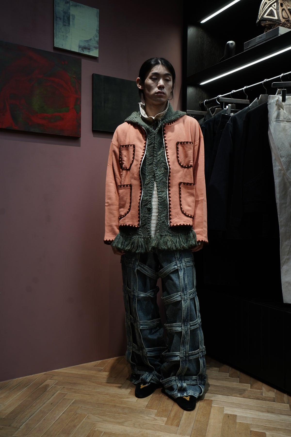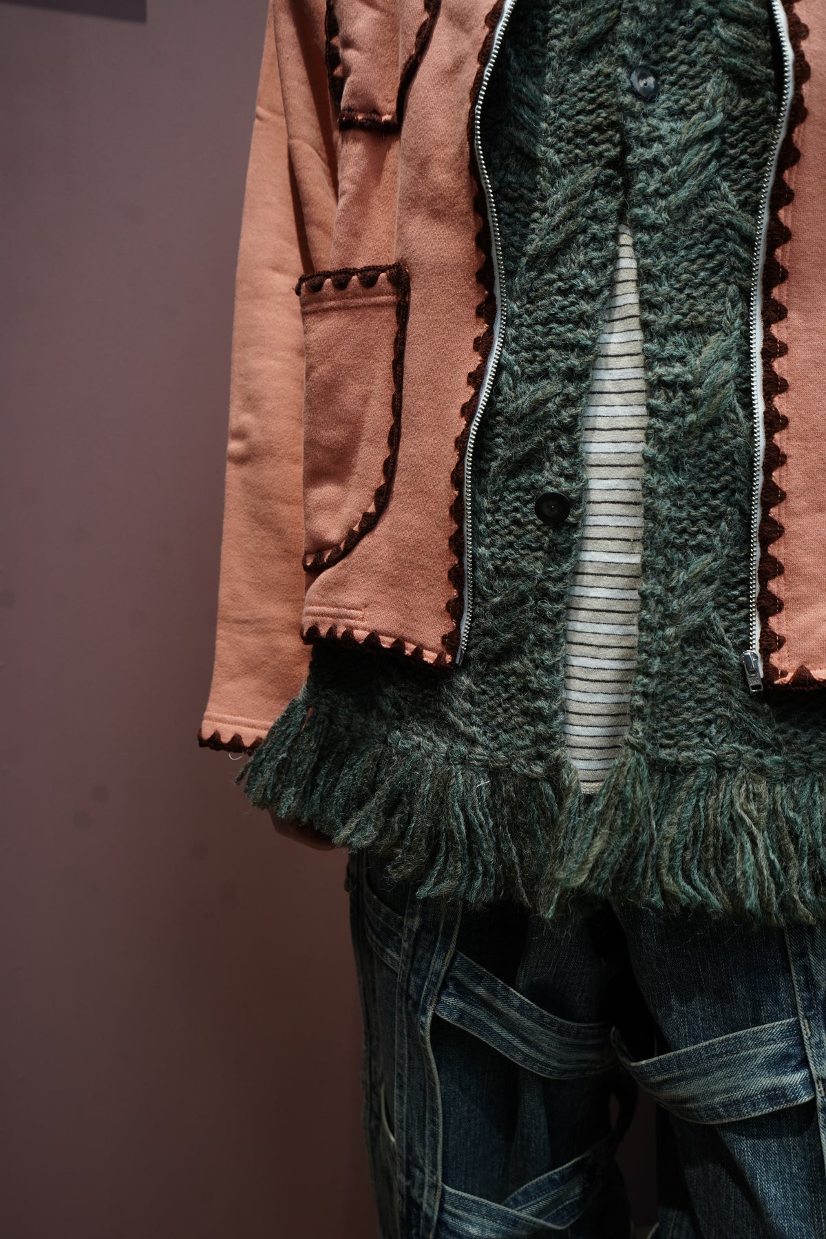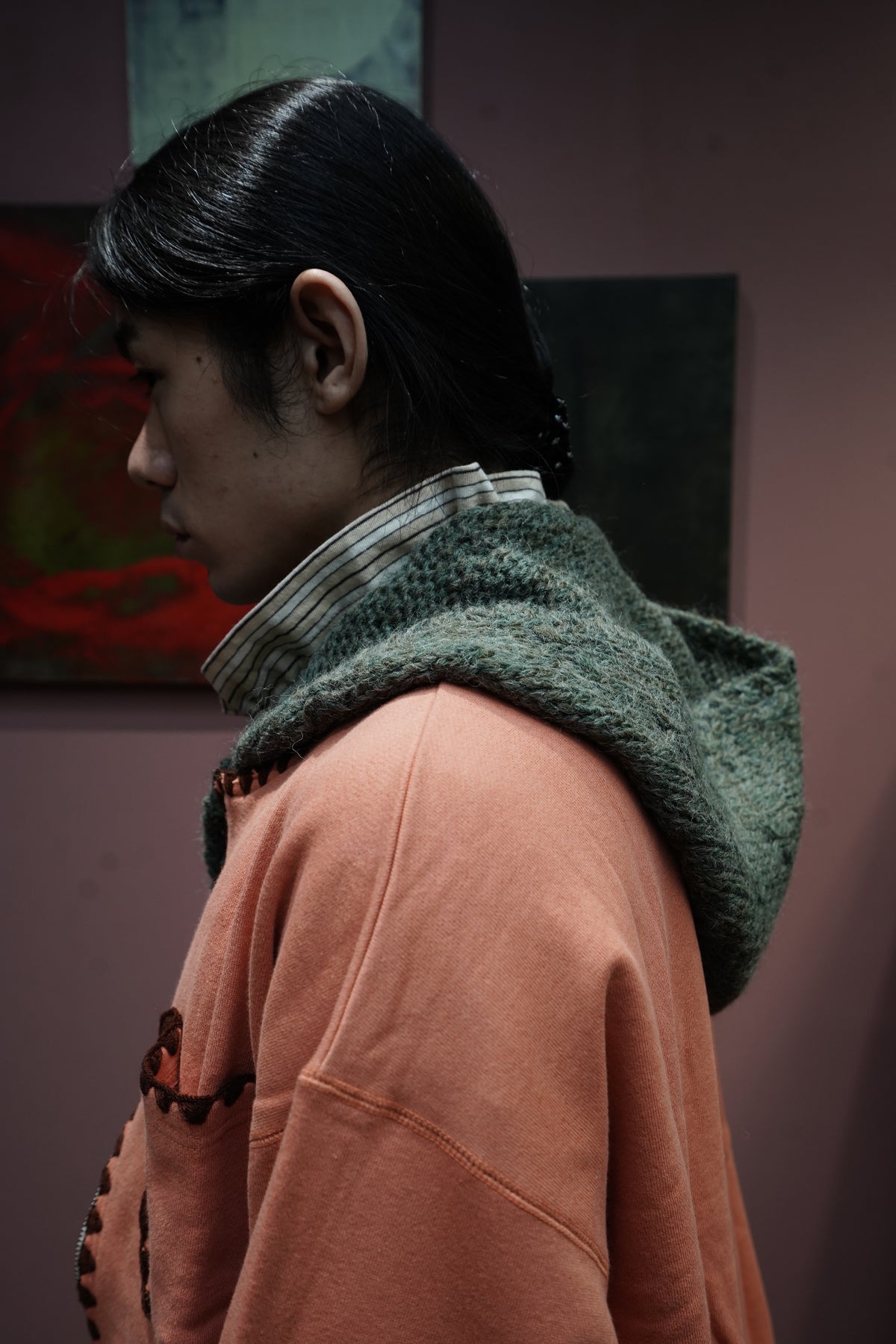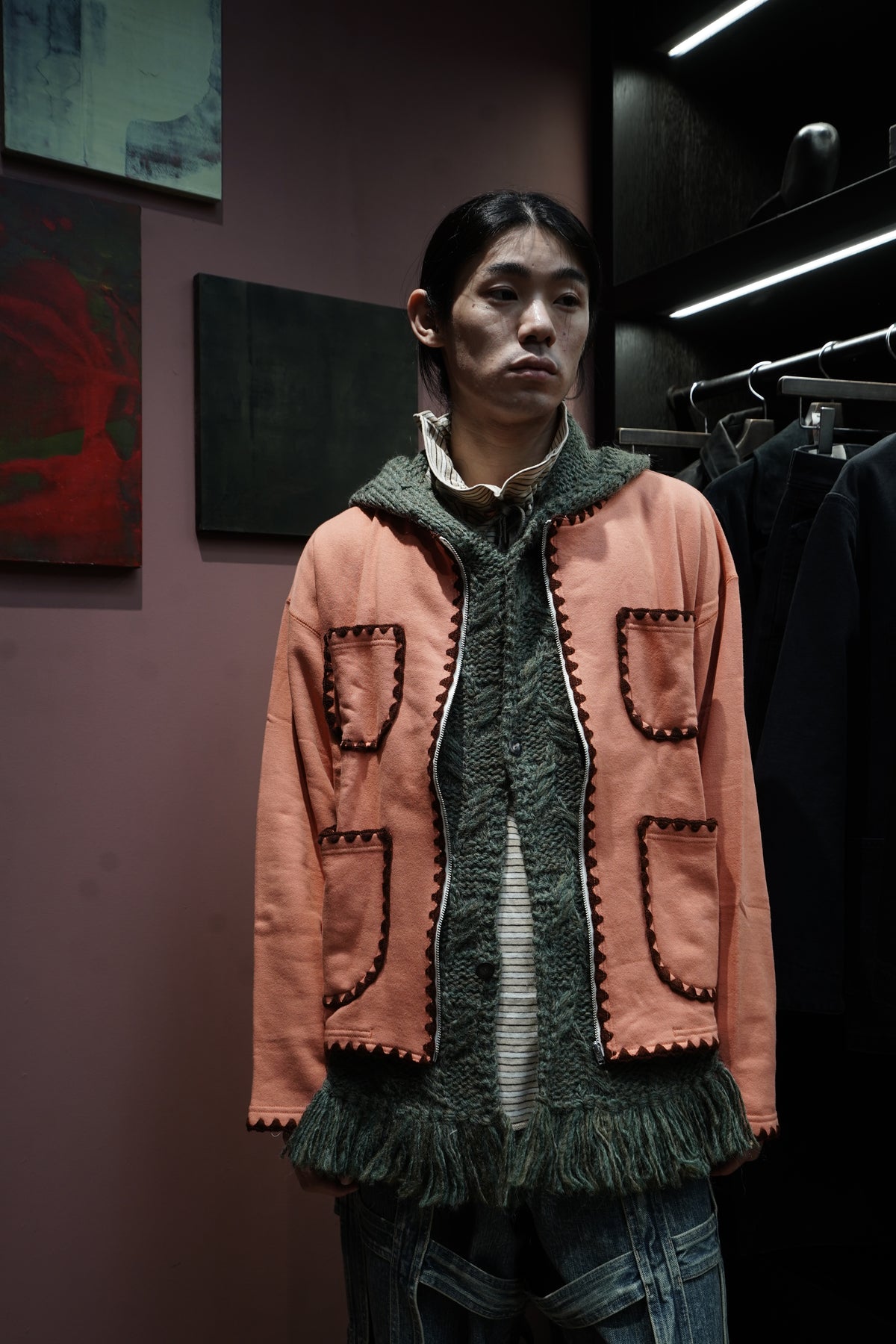 凸显人的手臂的全手工的连帽 围巾 以本季主题为印象的图案是帽子和围巾每个部分都有不同的图案。 材料是秘鲁产的羊毛使用丙烯酸线阶段,使皮肤接触时不会有刺痛感 用加工蓬松的优质的质感是特征。 前面有STEAF上面有纽扣,扣上纽扣,穿在外套下面连帽针织衫看起来像层叠的设计。