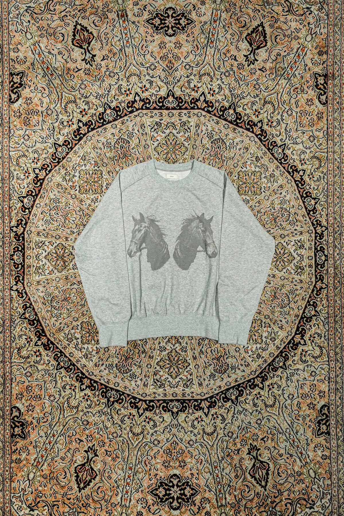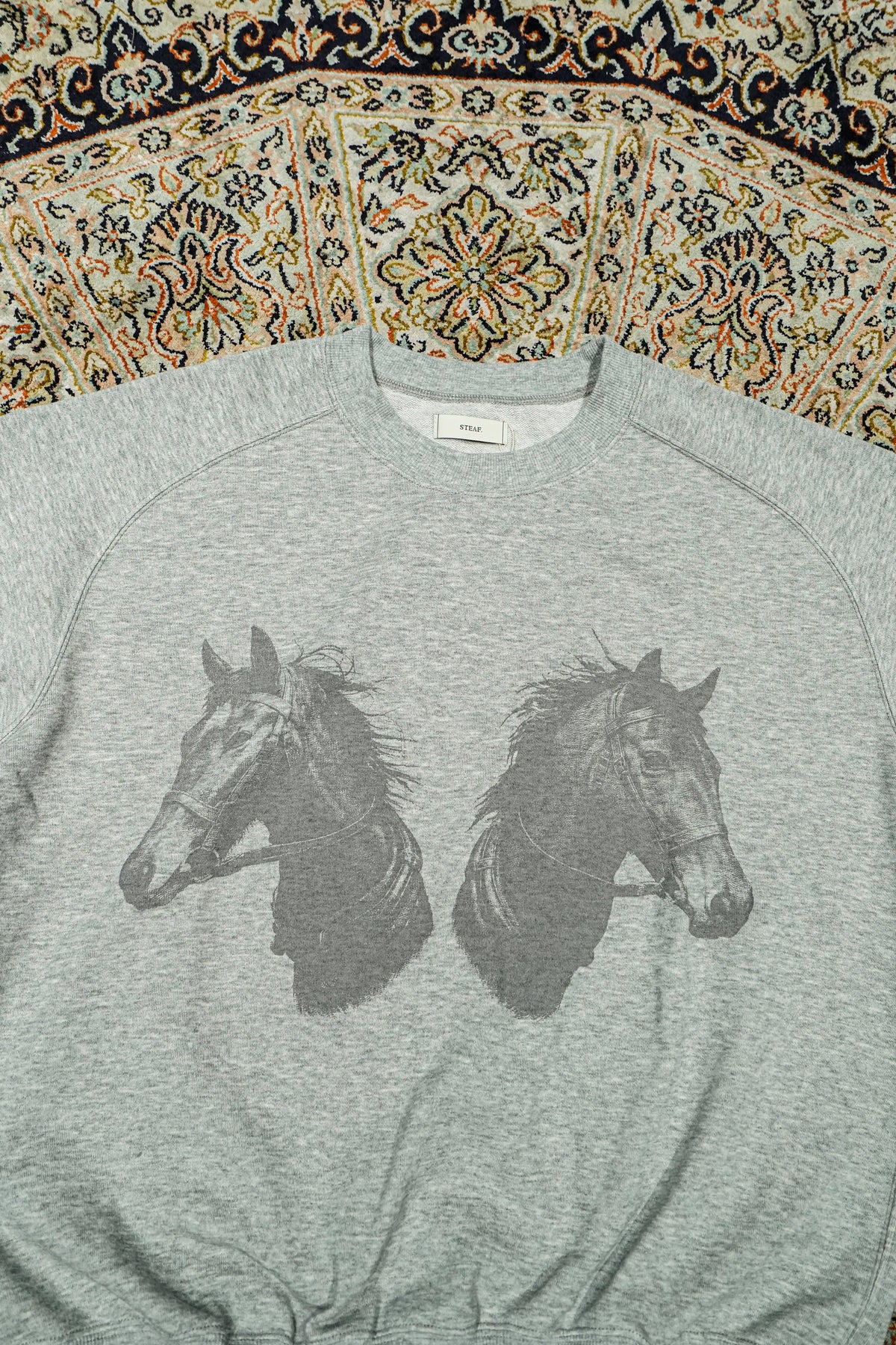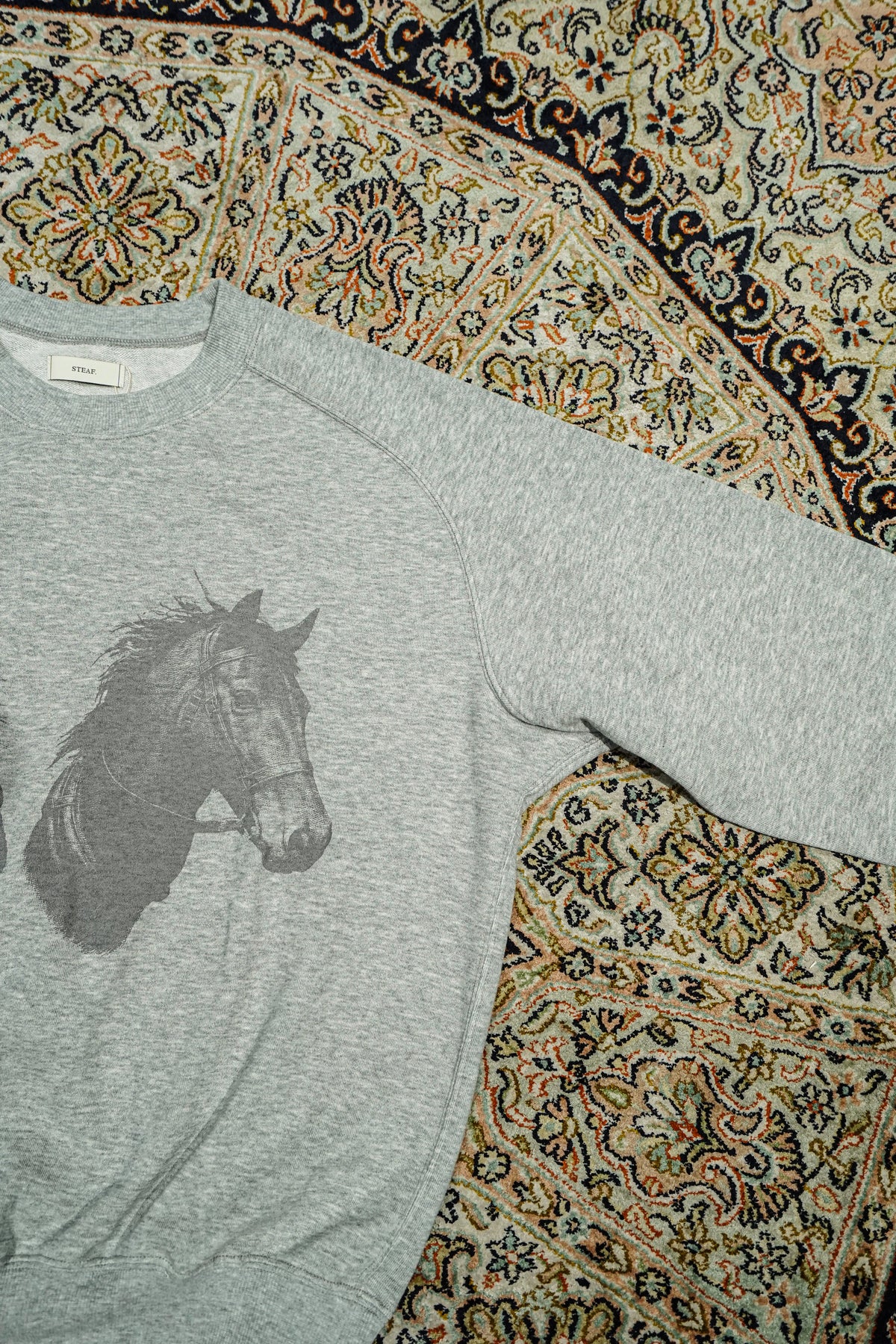 STEAFらしい腕の動きがより自由になるようになったフリーダムスリーブのラグラン切り替えと、袖口のリブの切り替えのラインが特徴。フロントにはテーマのワークにリンクしたジーンズブランドを連想させるデザイナーが手書きで書いた馬をインクジェットプリントで鮮明にプリントされていす。
