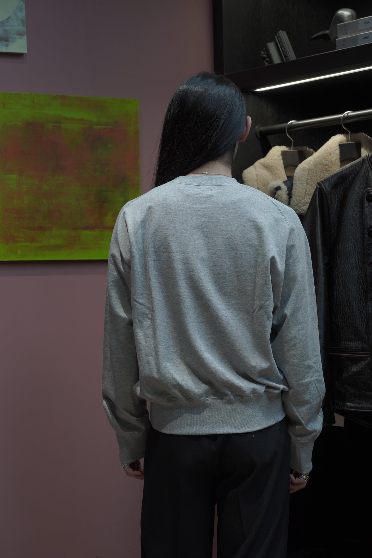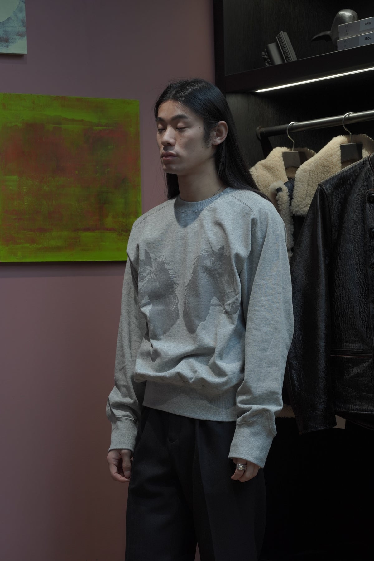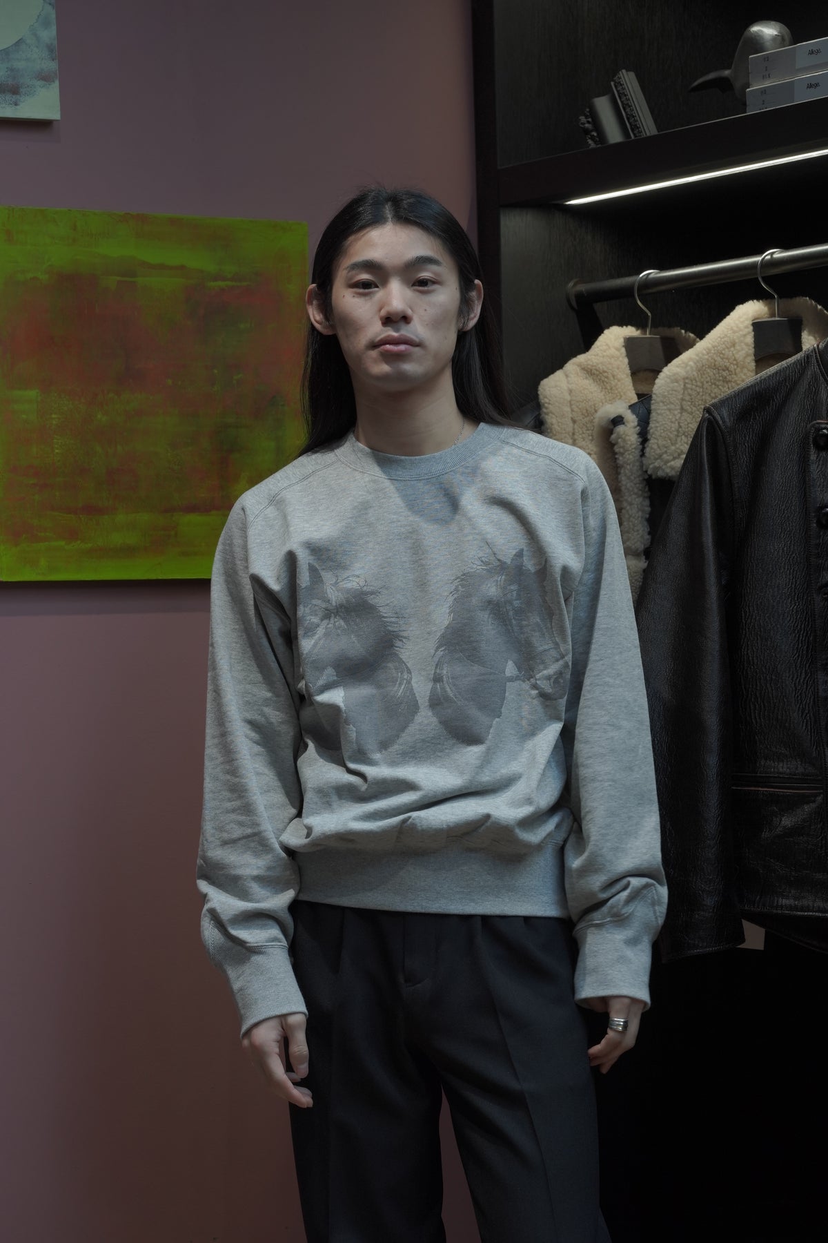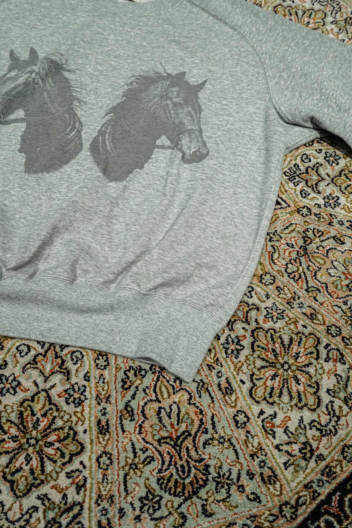 STEAFらしい腕の動きがより自由になるようになったフリーダムスリーブのラグラン切り替えと、袖口のリブの切り替えのラインが特徴。フロントにはテーマのワークにリンクしたジーンズブランドを連想させるデザイナーが手書きで書いた馬をインクジェットプリントで鮮明にプリントされていす。