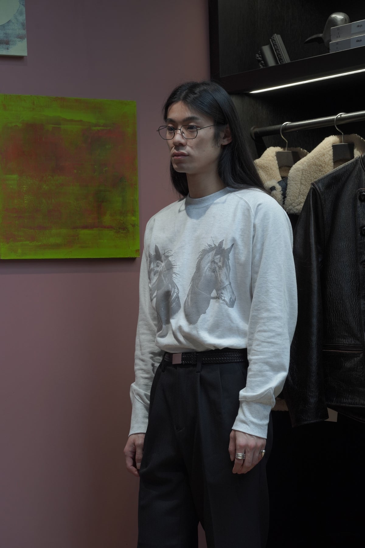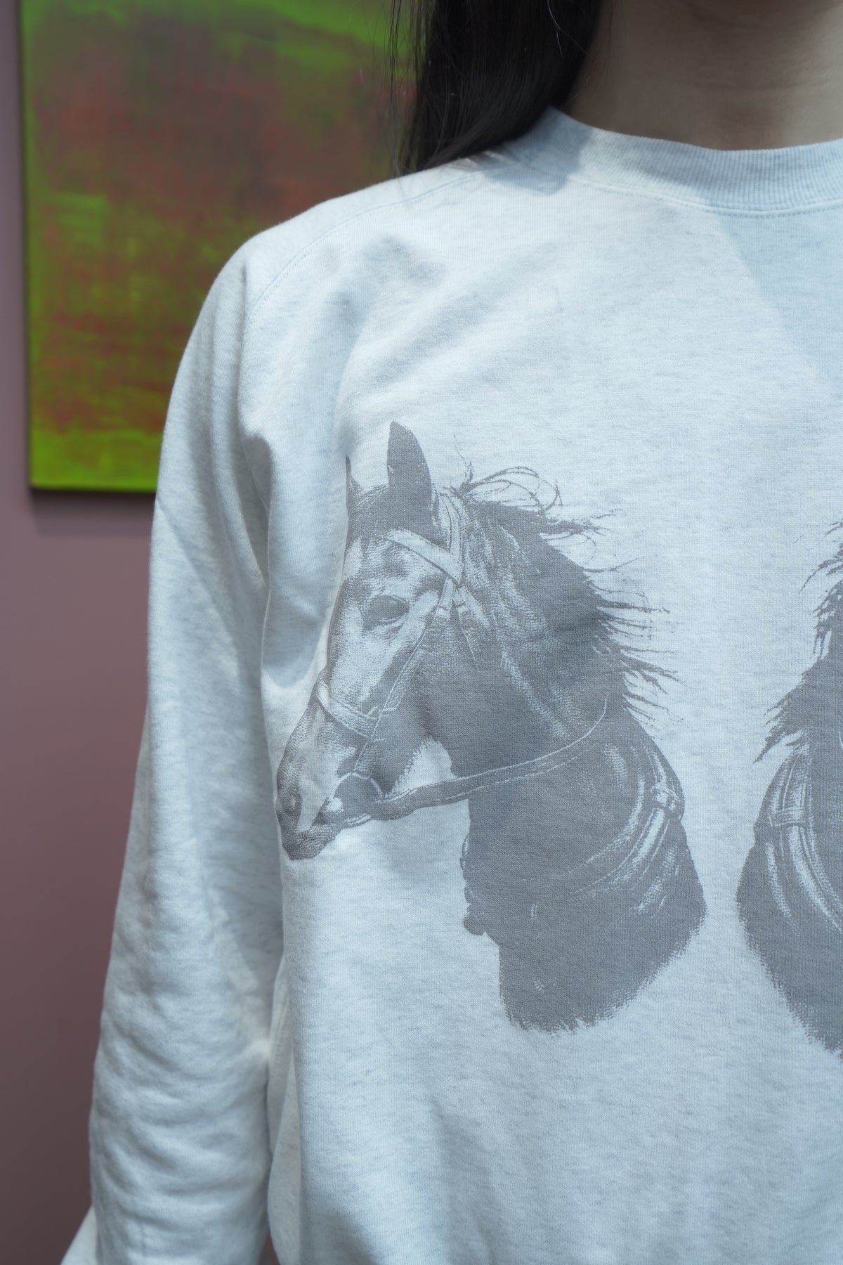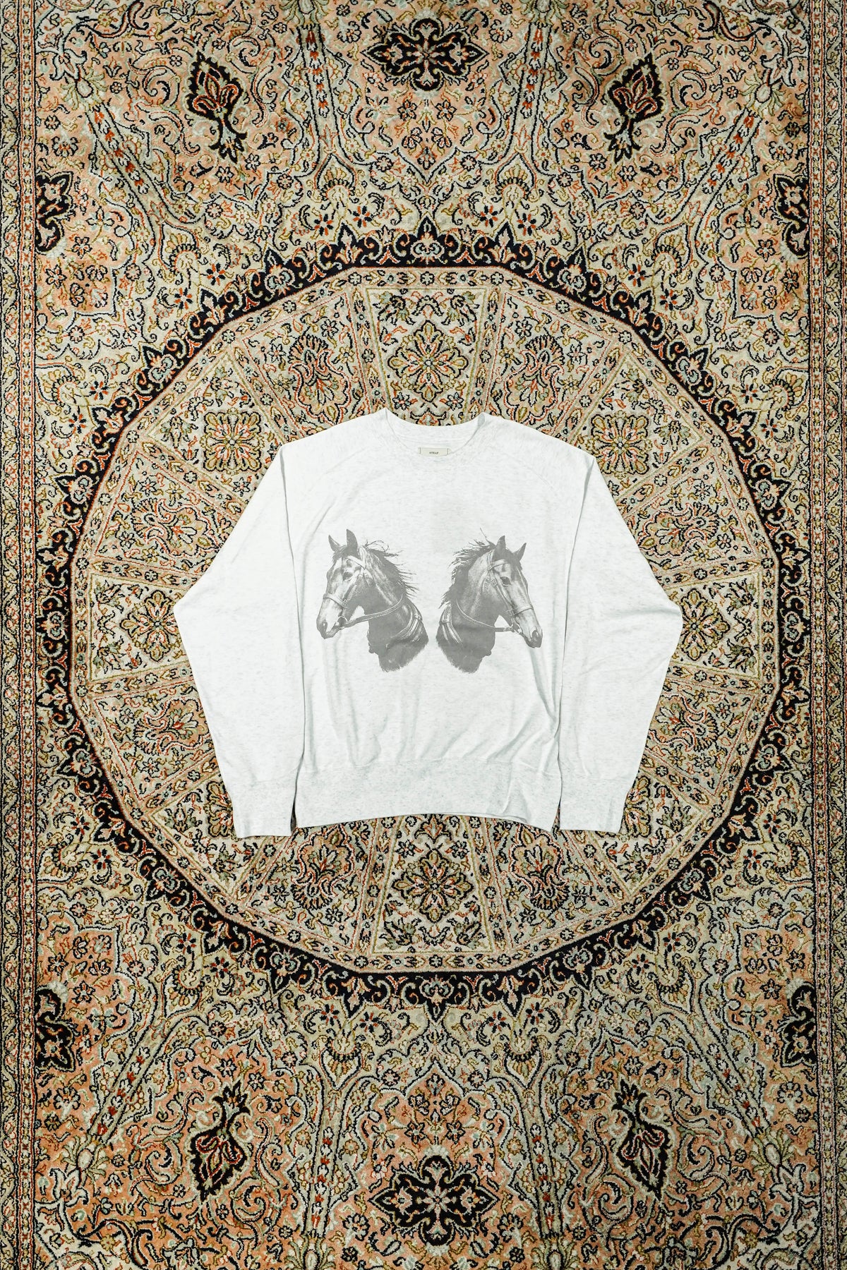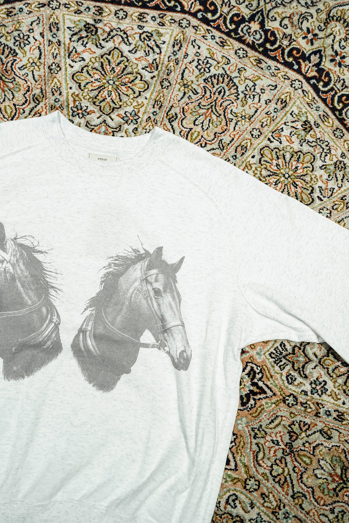 STEAFらしい腕の動きがより自由になるようになったフリーダムスリーブのラグラン切り替えと、袖口のリブの切り替えのラインが特徴。フロントにはテーマのワークにリンクしたジーンズブランドを連想させるデザイナーが手書きで書いた馬をインクジェットプリントで鮮明にプリントされていす。