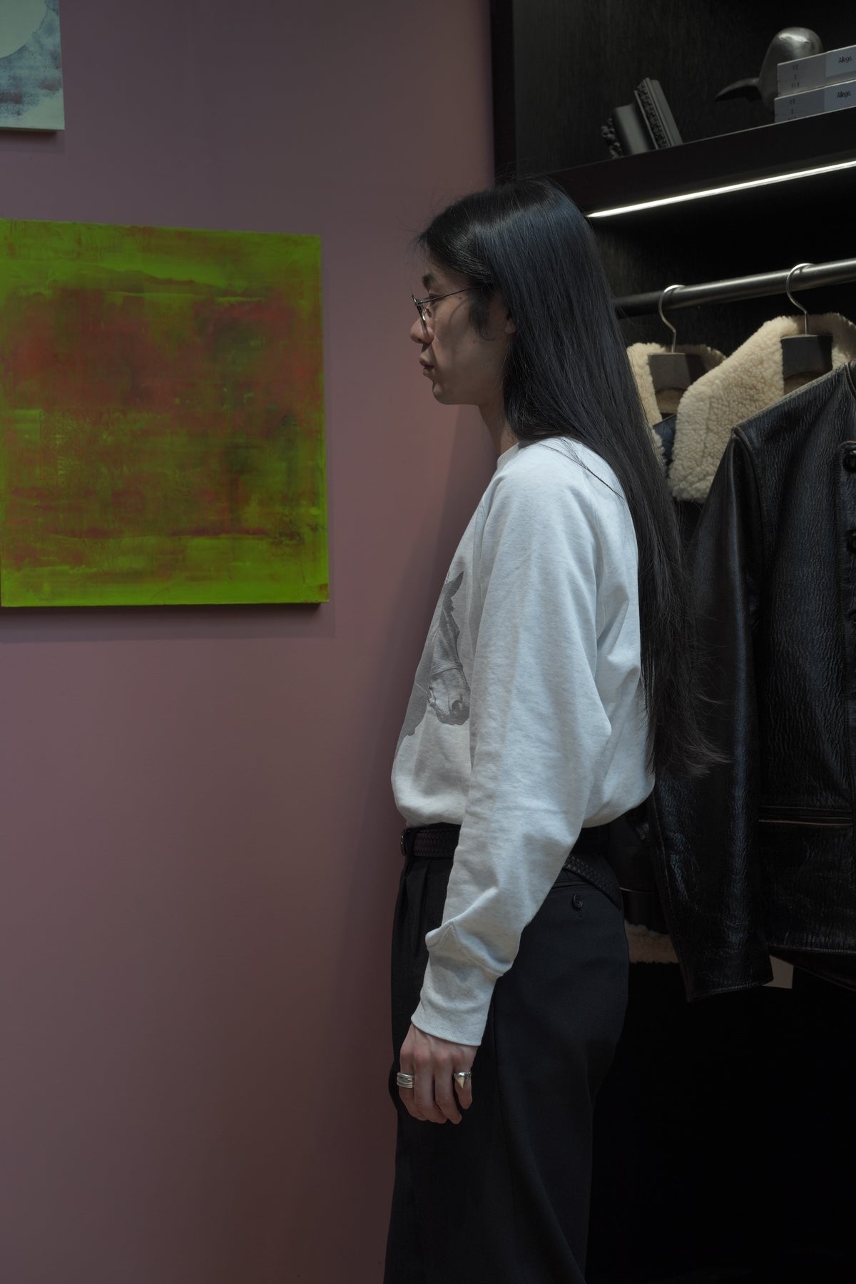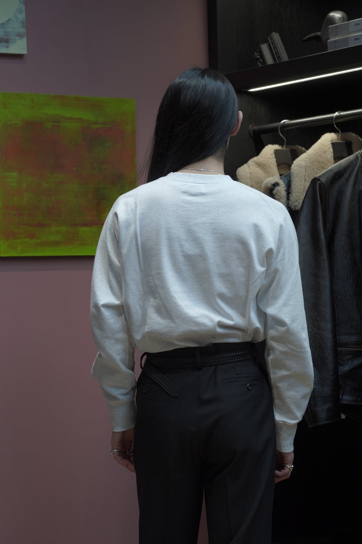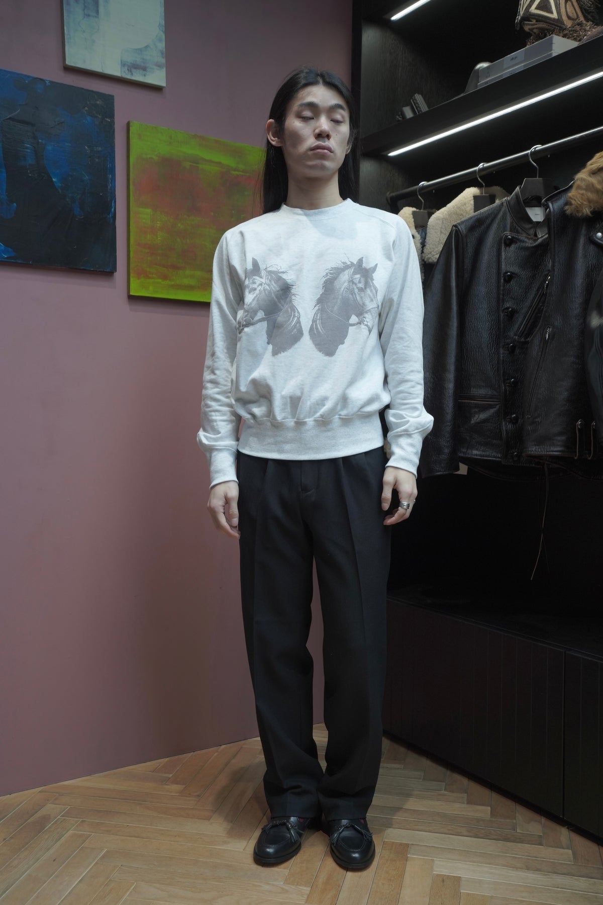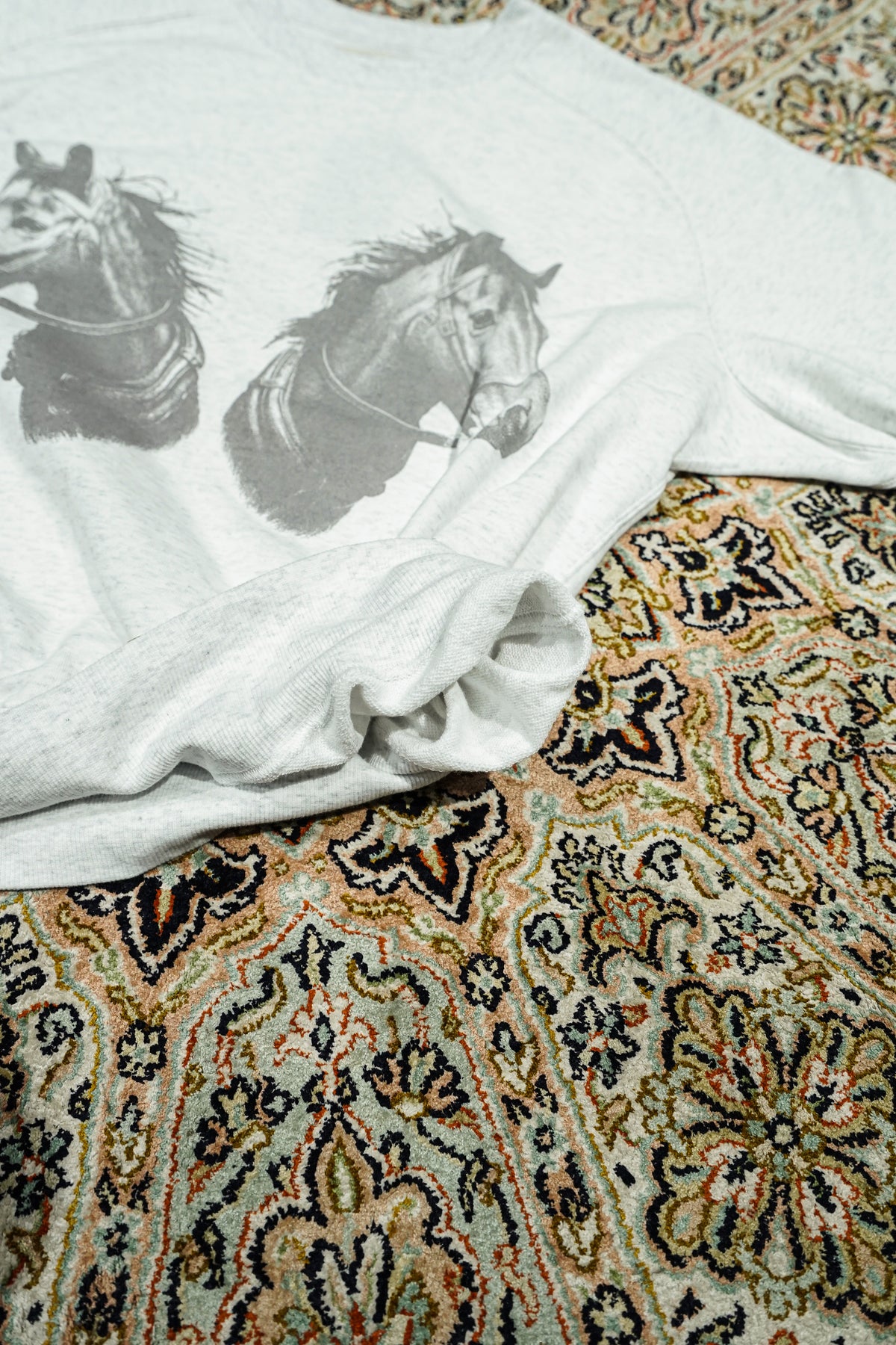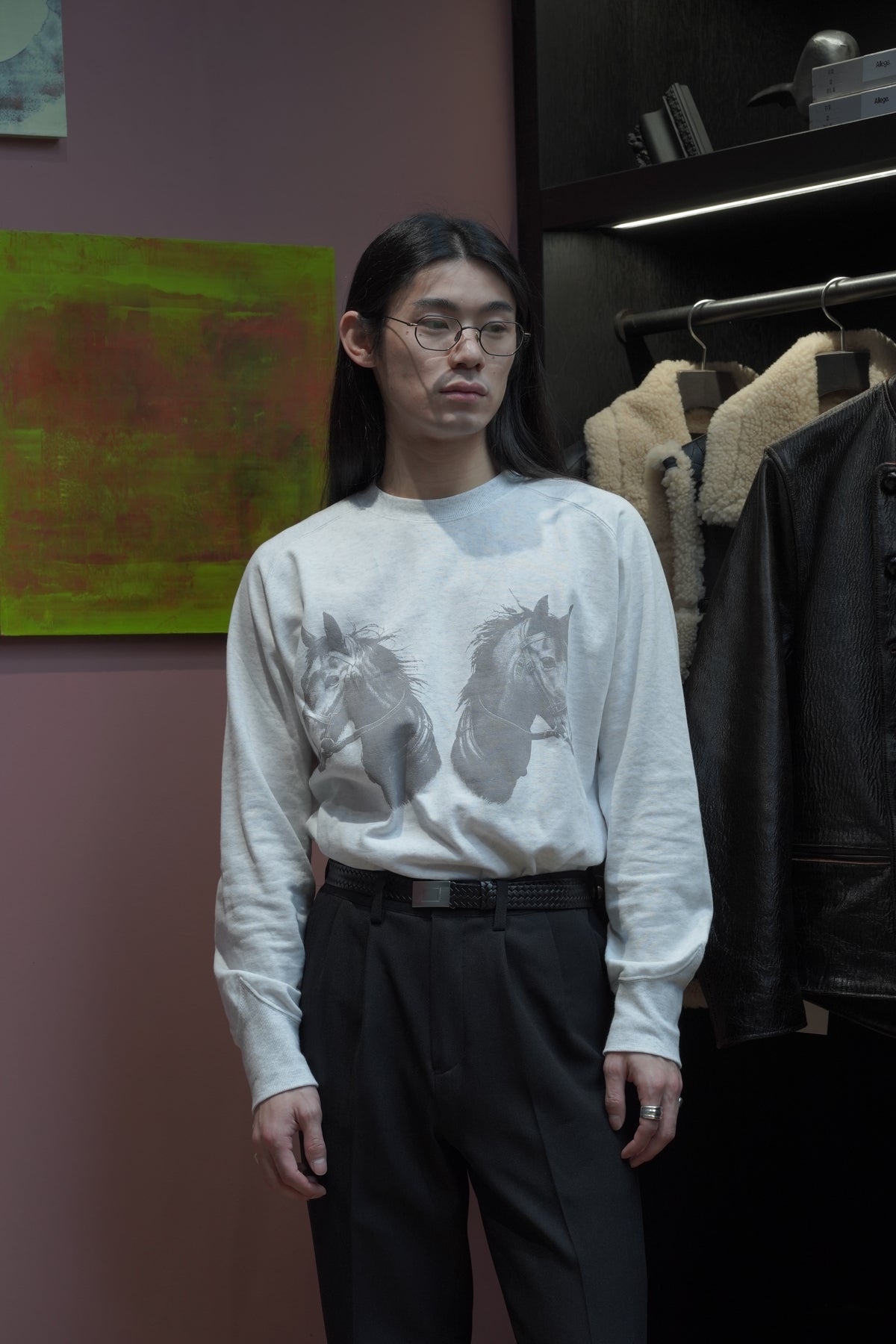 STEAFらしい腕の動きがより自由になるようになったフリーダムスリーブのラグラン切り替えと、袖口のリブの切り替えのラインが特徴。フロントにはテーマのワークにリンクしたジーンズブランドを連想させるデザイナーが手書きで書いた馬をインクジェットプリントで鮮明にプリントされていす。