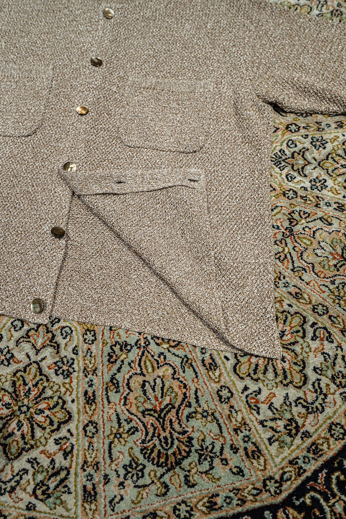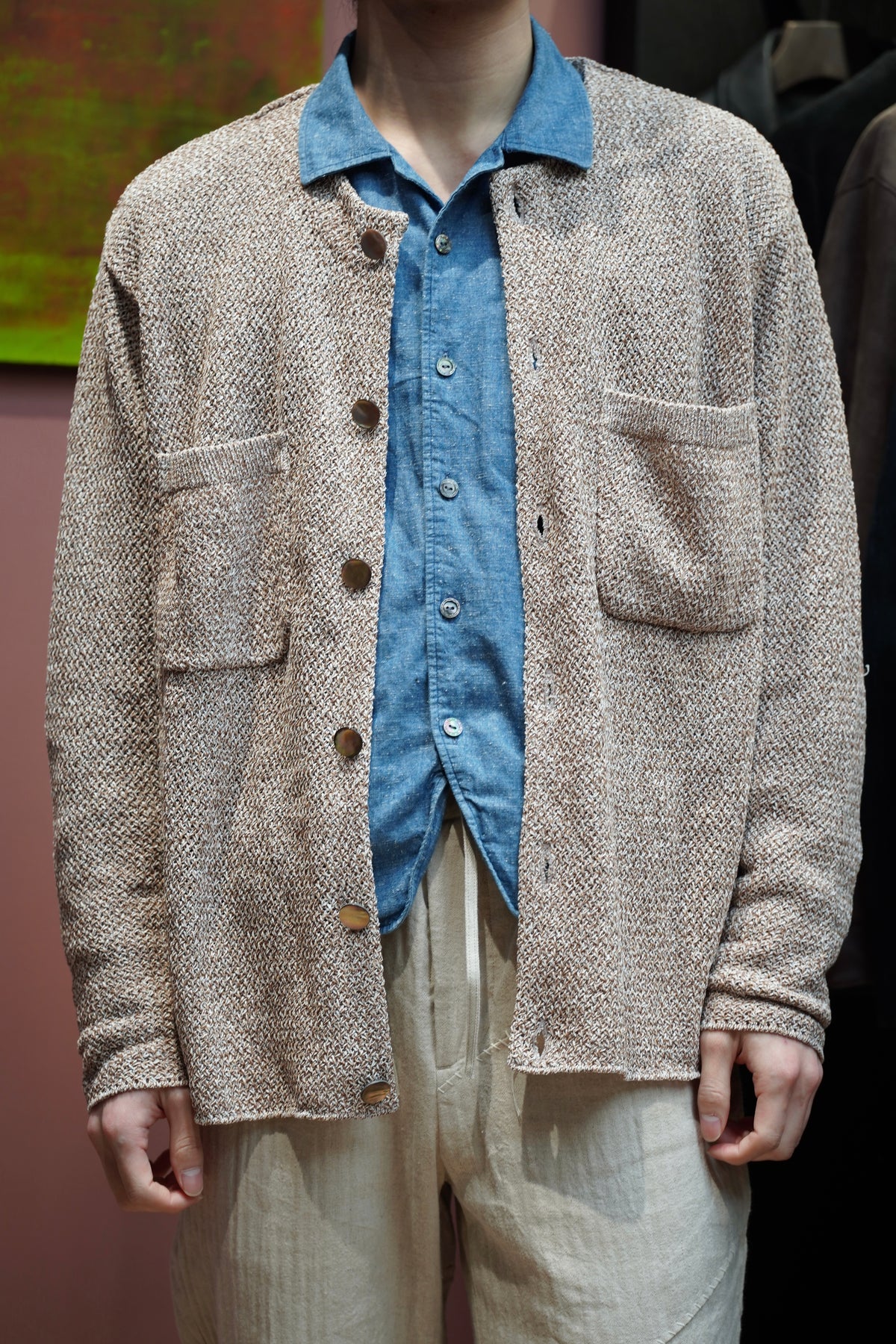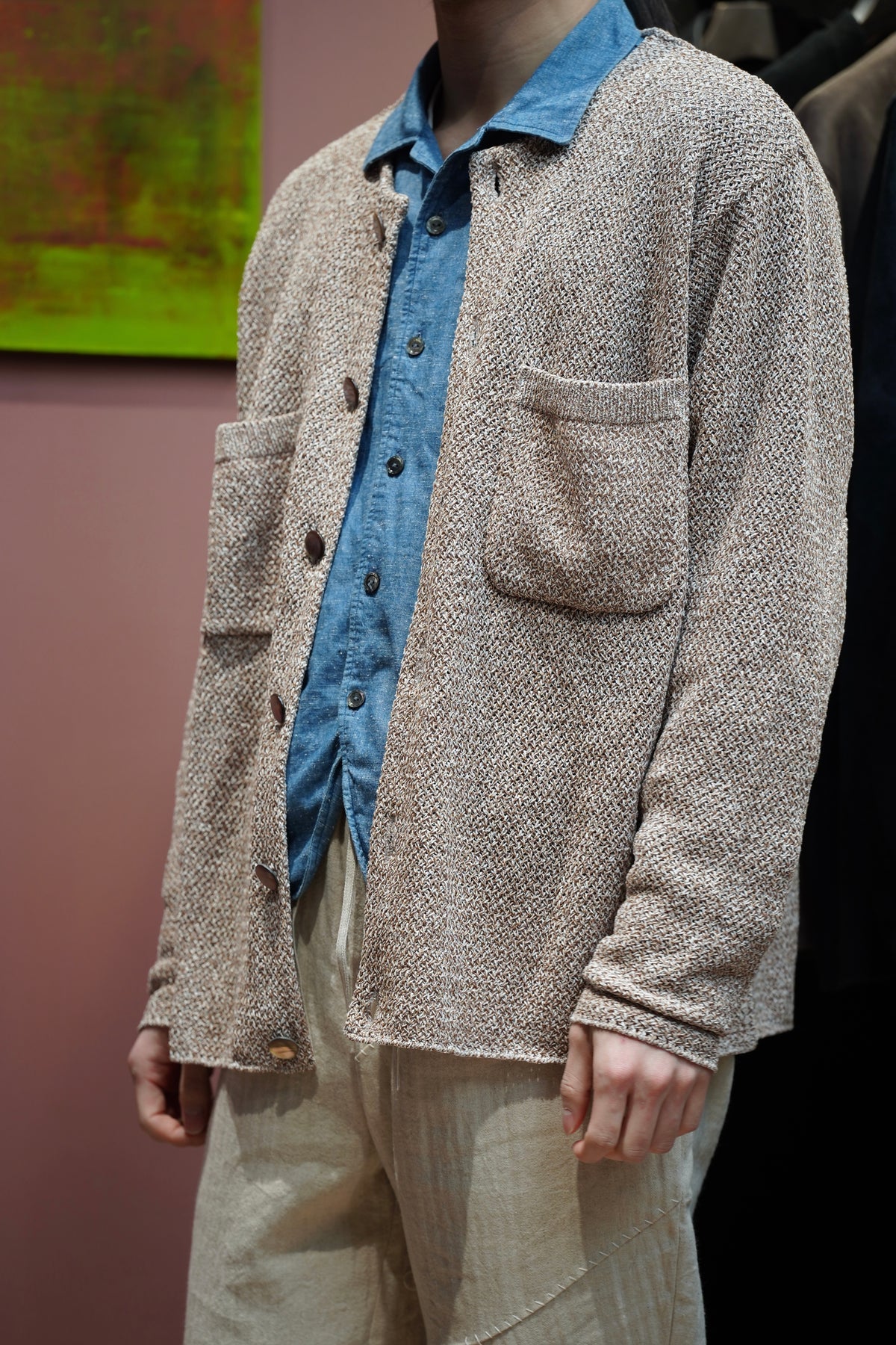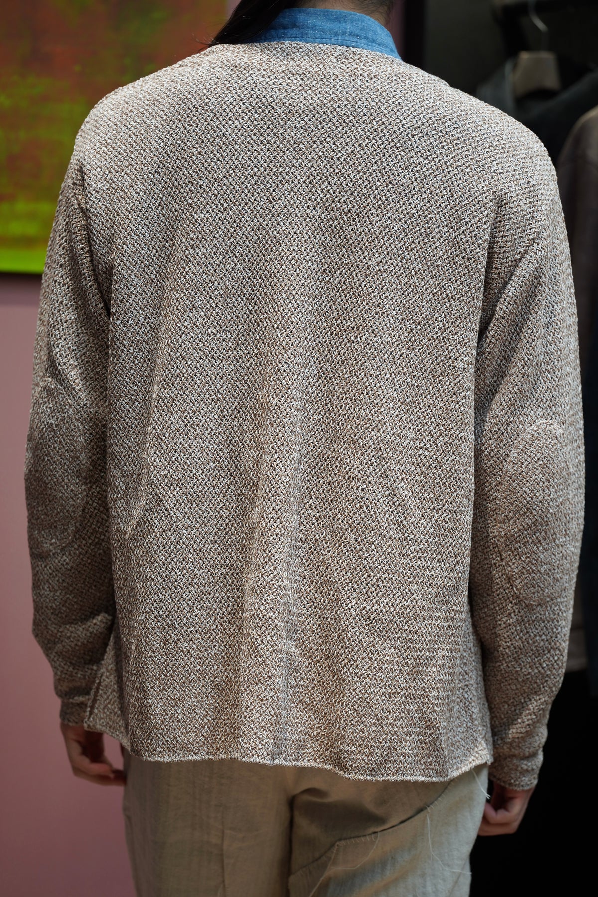 和紙とポリエステルの糸をWカバーした3色杢素材をバスケット編みで編み立てた7Gのカーディガンです。