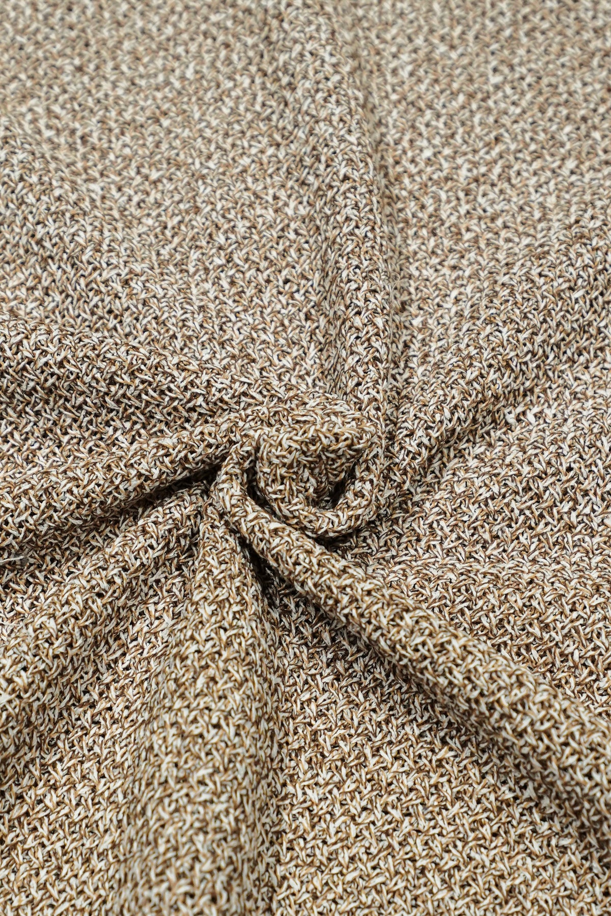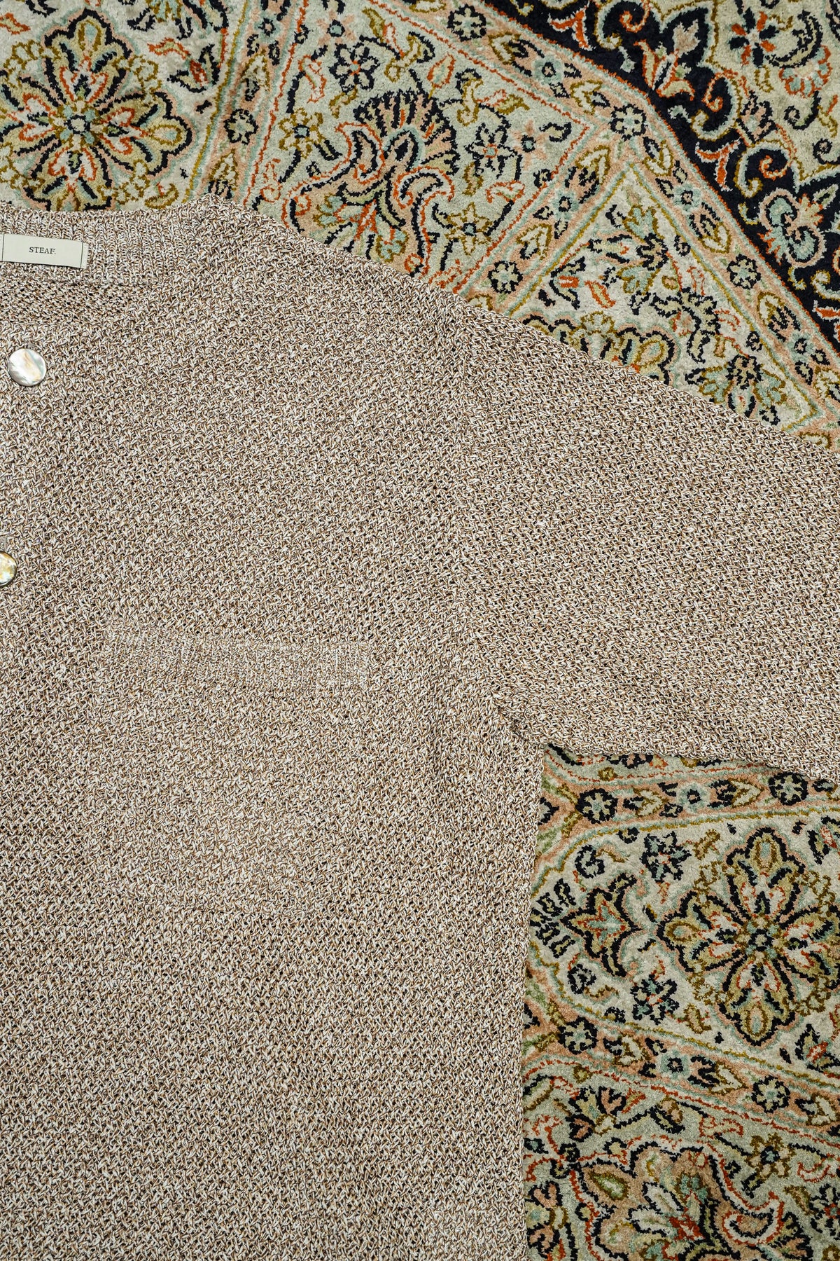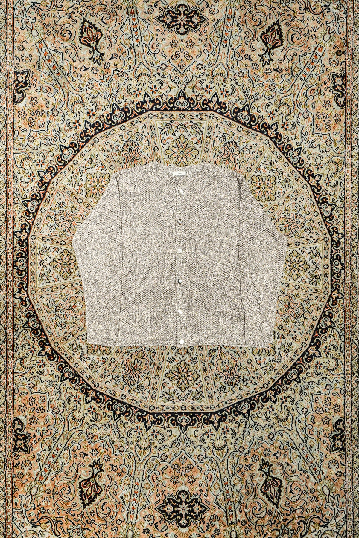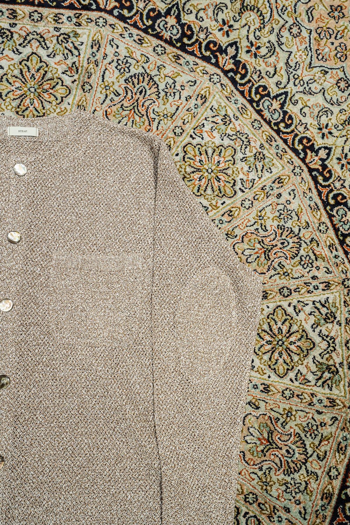 和紙とポリエステルの糸をWカバーした3色杢素材をバスケット編みで編み立てた7Gのカーディガンです。