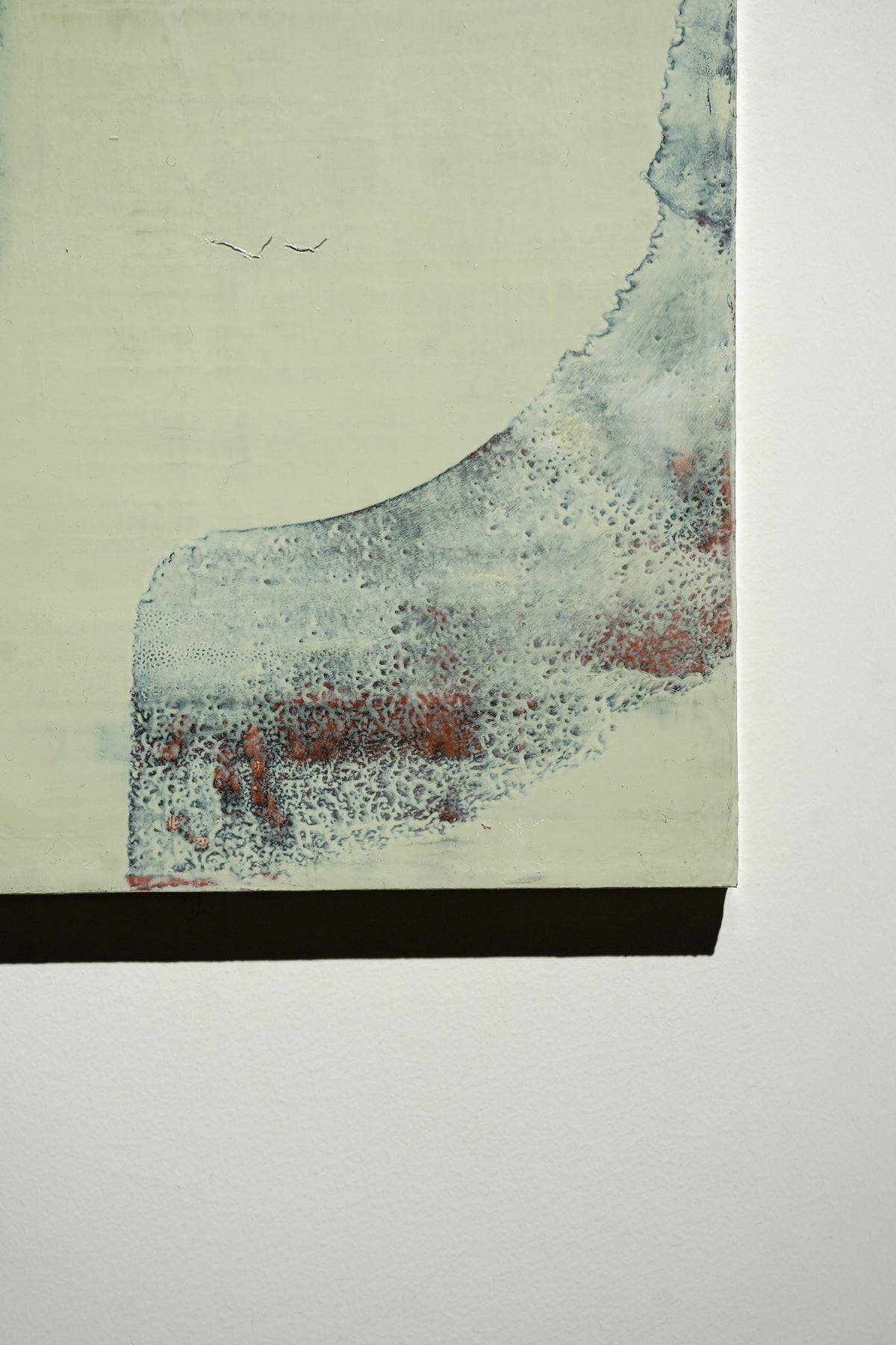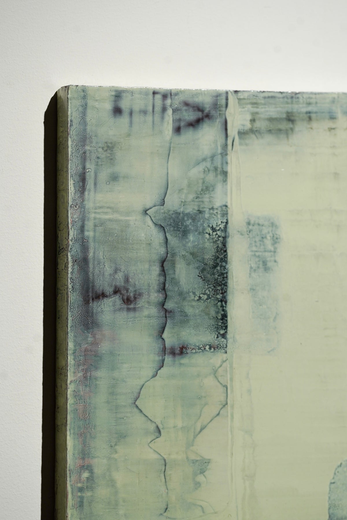 オイルを塗り、剥がし、また塗りまた剥がし、、、という作業工程のうえ、アーティストの記憶の奥底にあるイメージを抽象画で表現。